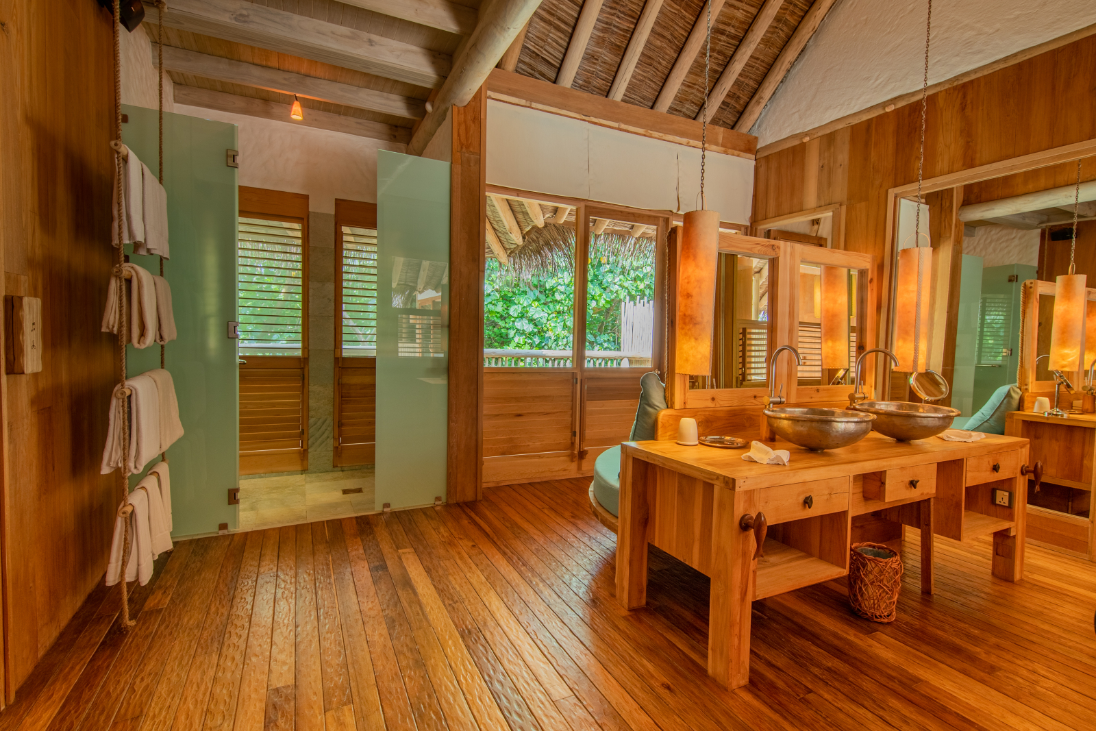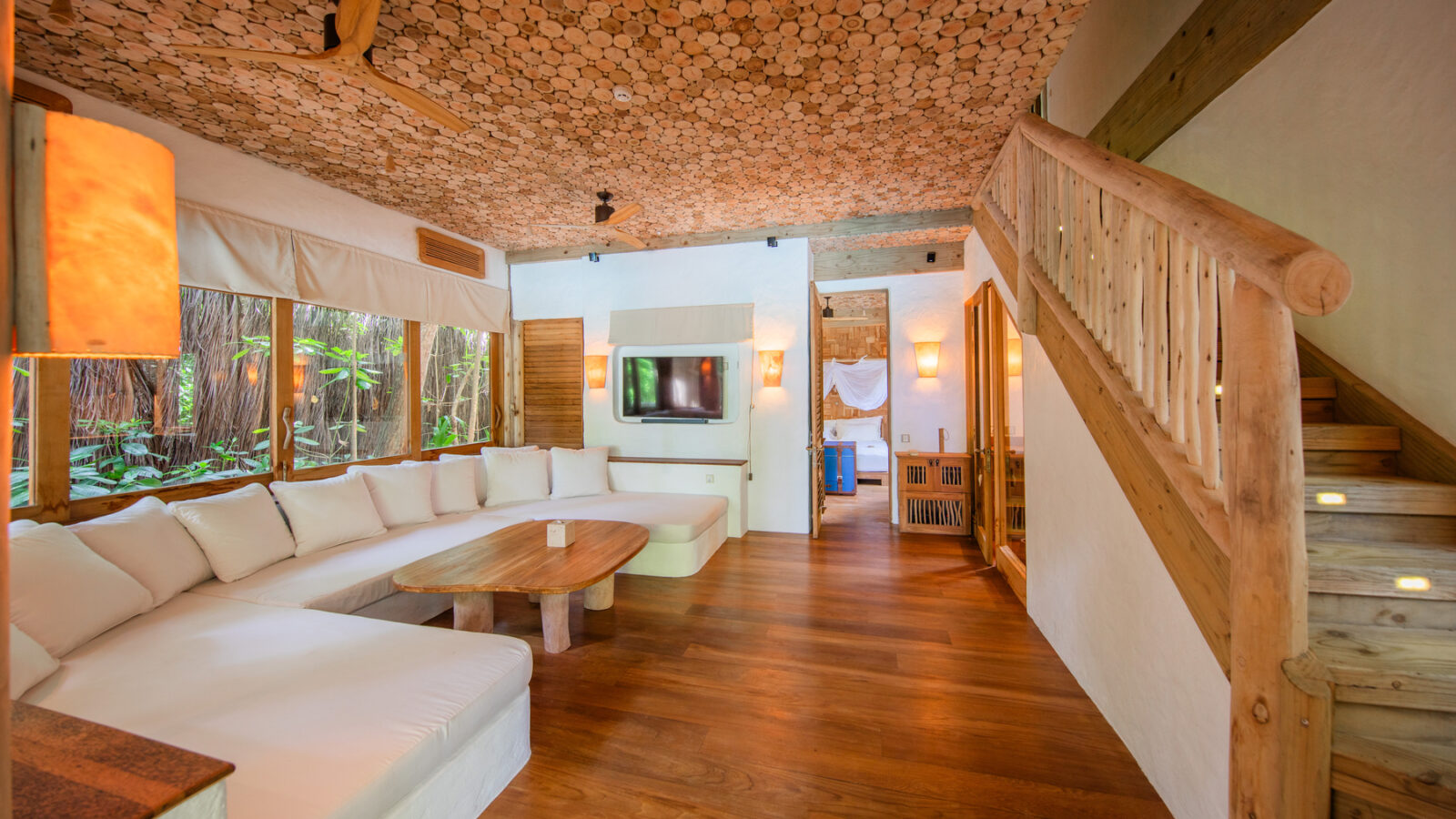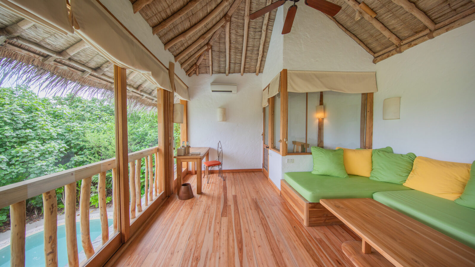 На 1-м этаже: спальня с кроватью king-size или кроватями twin, гостиная, ванная комната на открытом воздухе с ванной и душем, душевая кабина, терраса с бассейном. Гостиная и спальня разделены дверью.