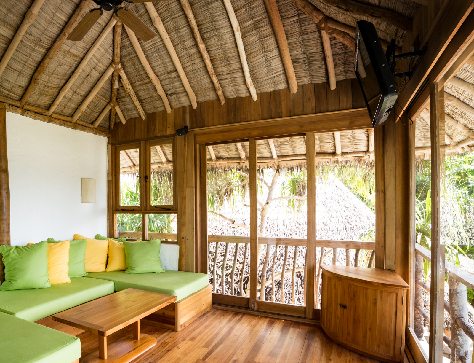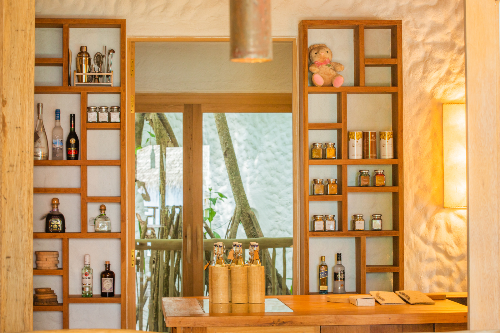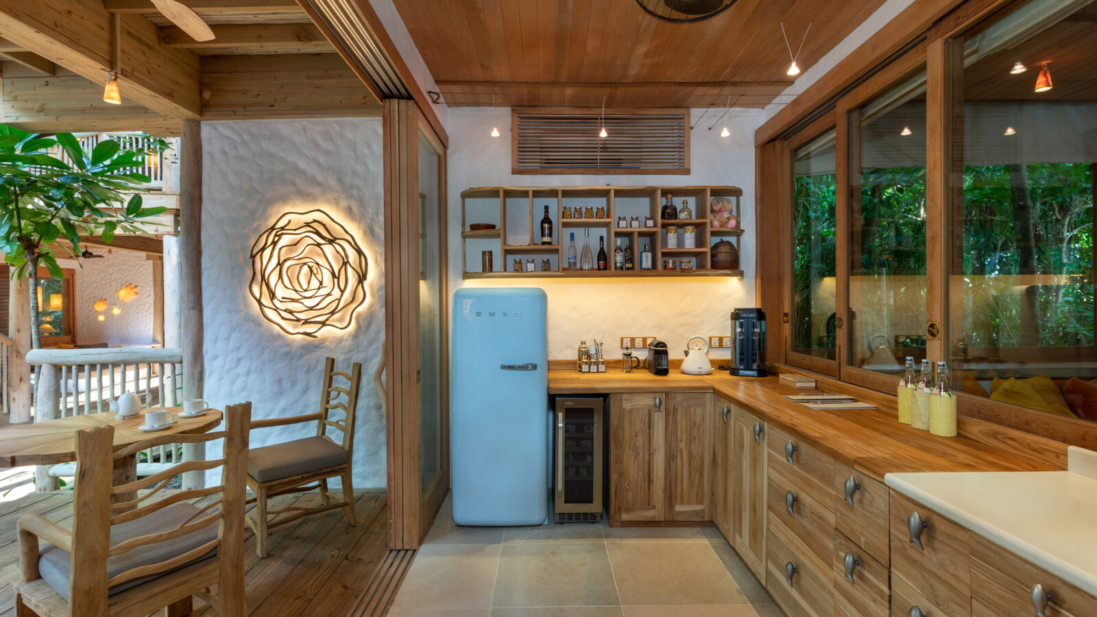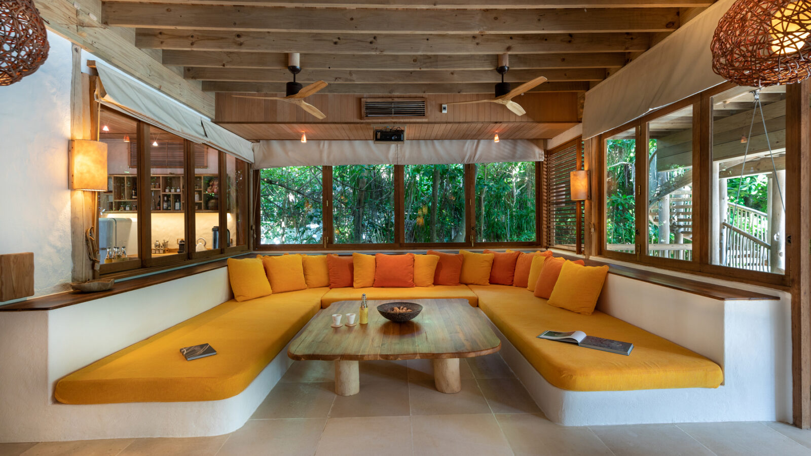На 1-м этаже: спальня с кроватью king-size или кроватями twin, гостиная, ванная комната на открытом воздухе с ванной и душем, душевая кабина, терраса с бассейном. Гостиная и спальня разделены дверью.