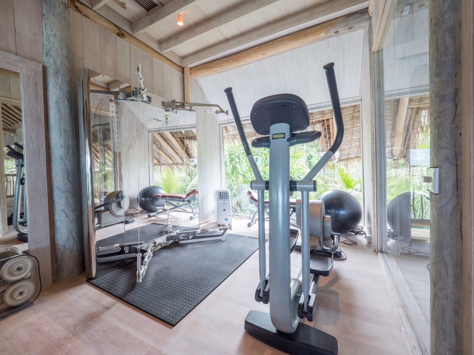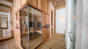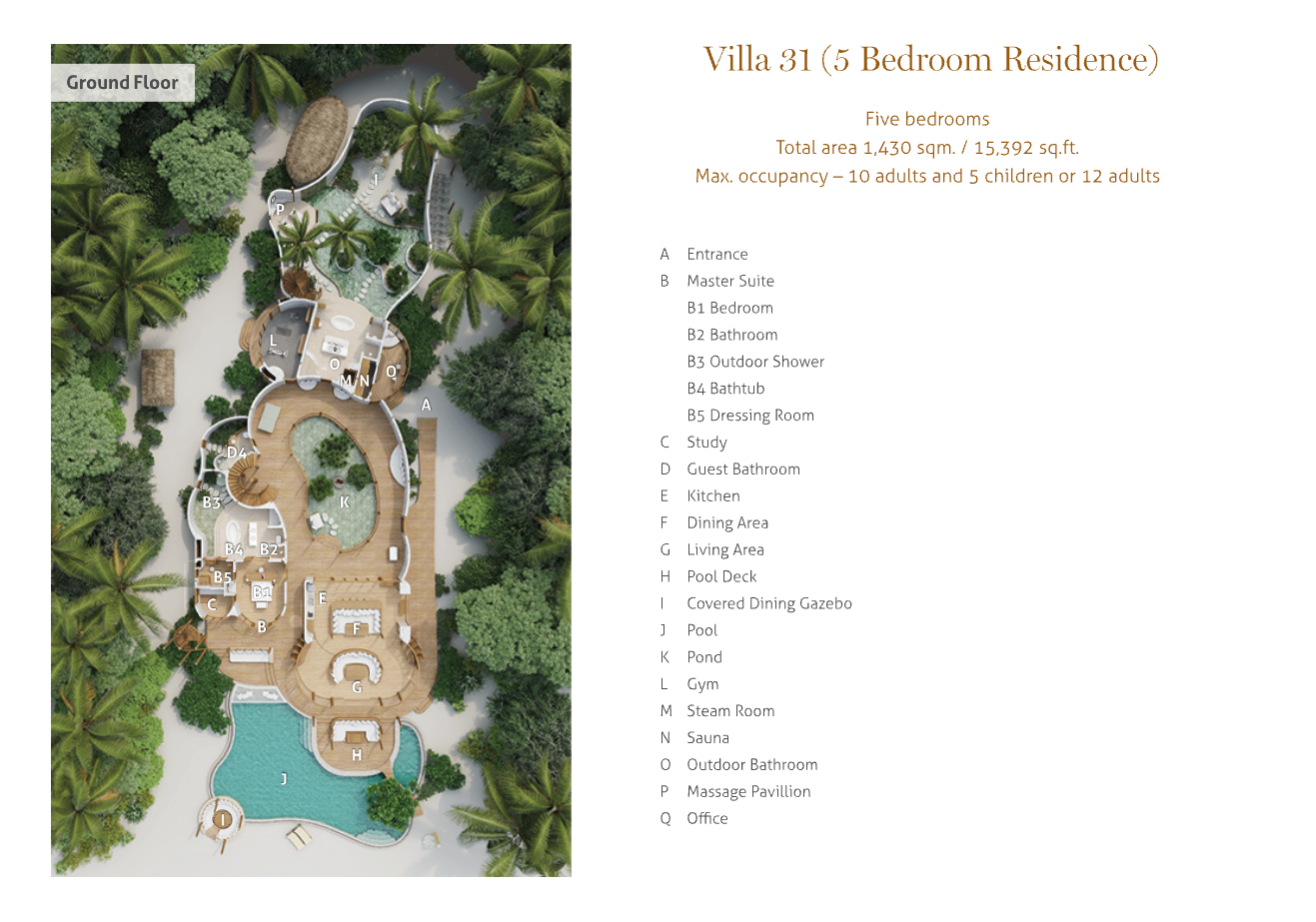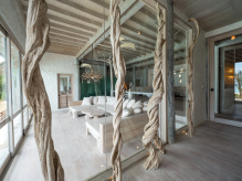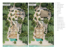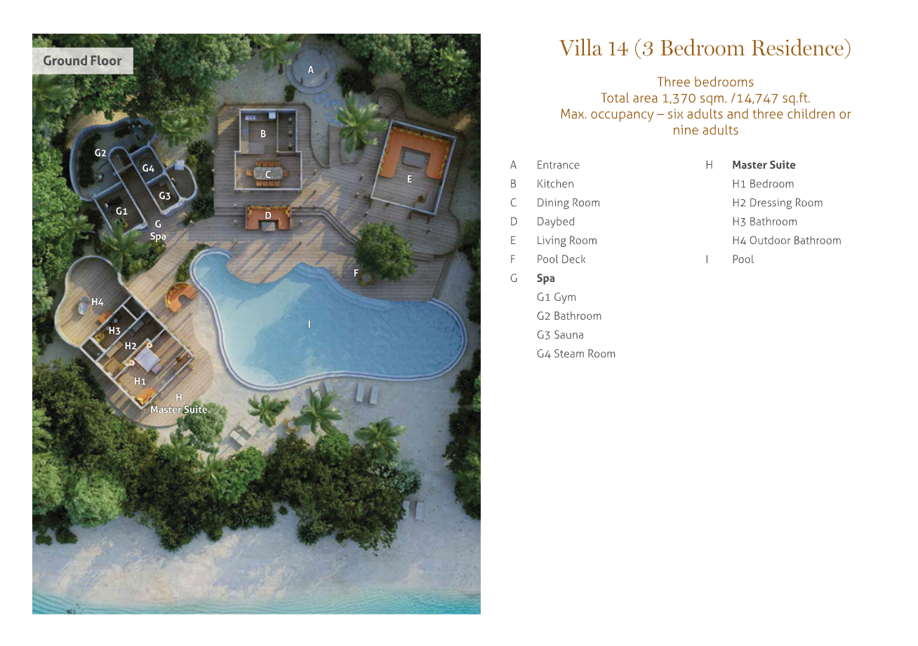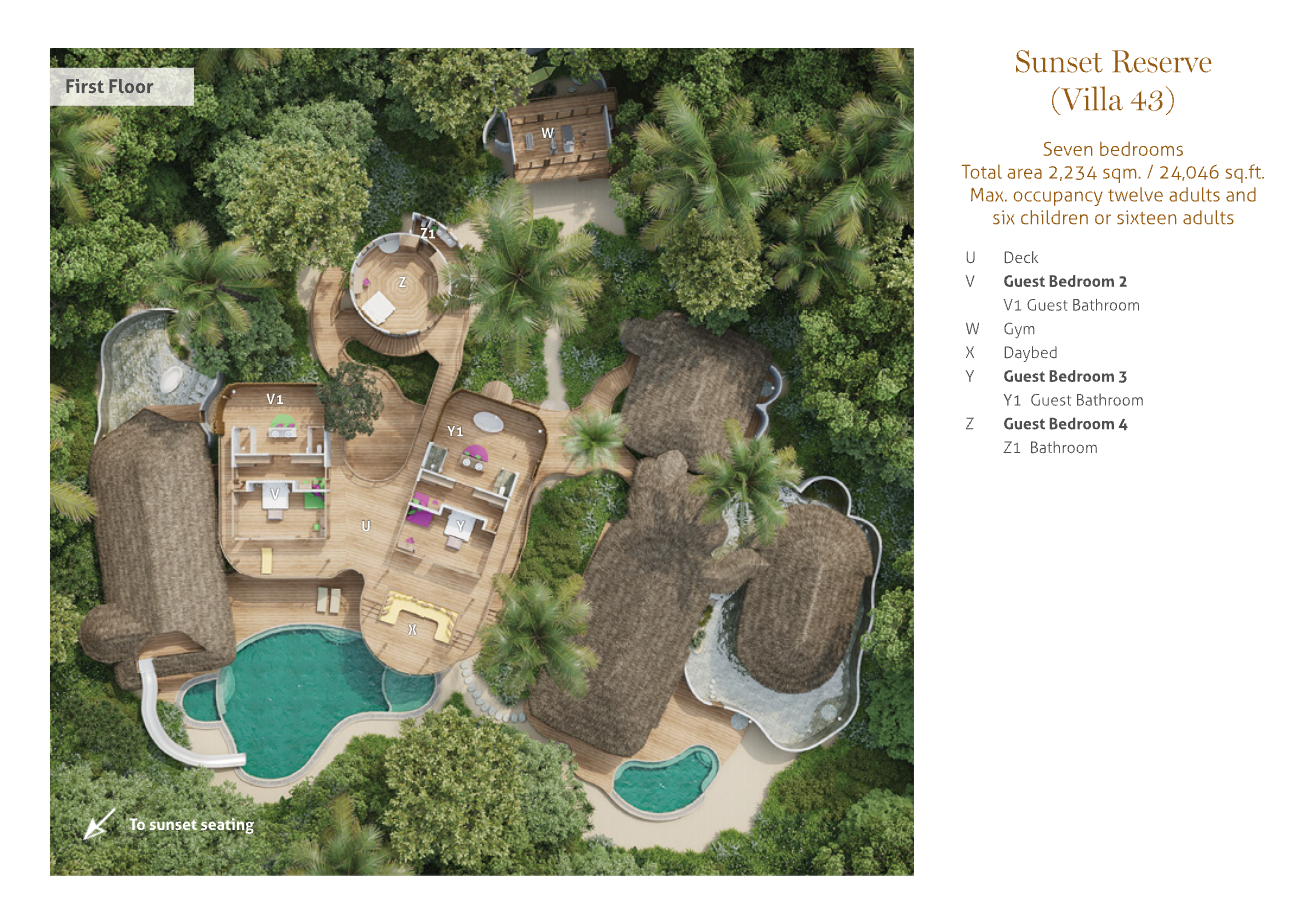 На 1-м этаже: 2 спальни (каждая с кроватью king-size), гостиная, ванная комната на открытом воздухе с ванной и душем, тренажёрный зал, комната для спа-процедур, парная, терраса с бассейном.