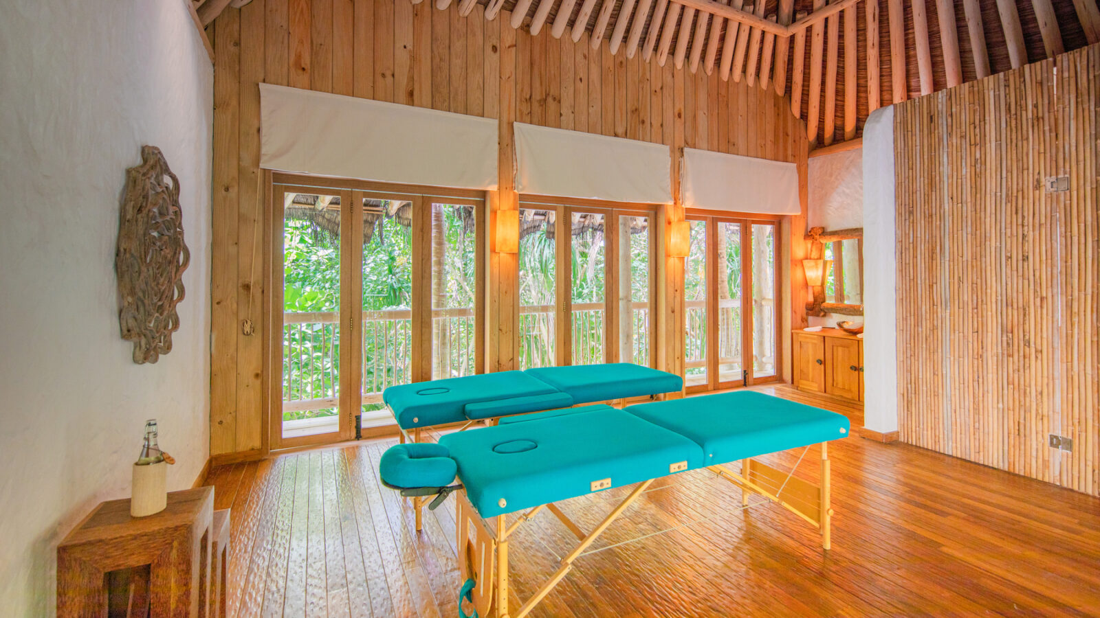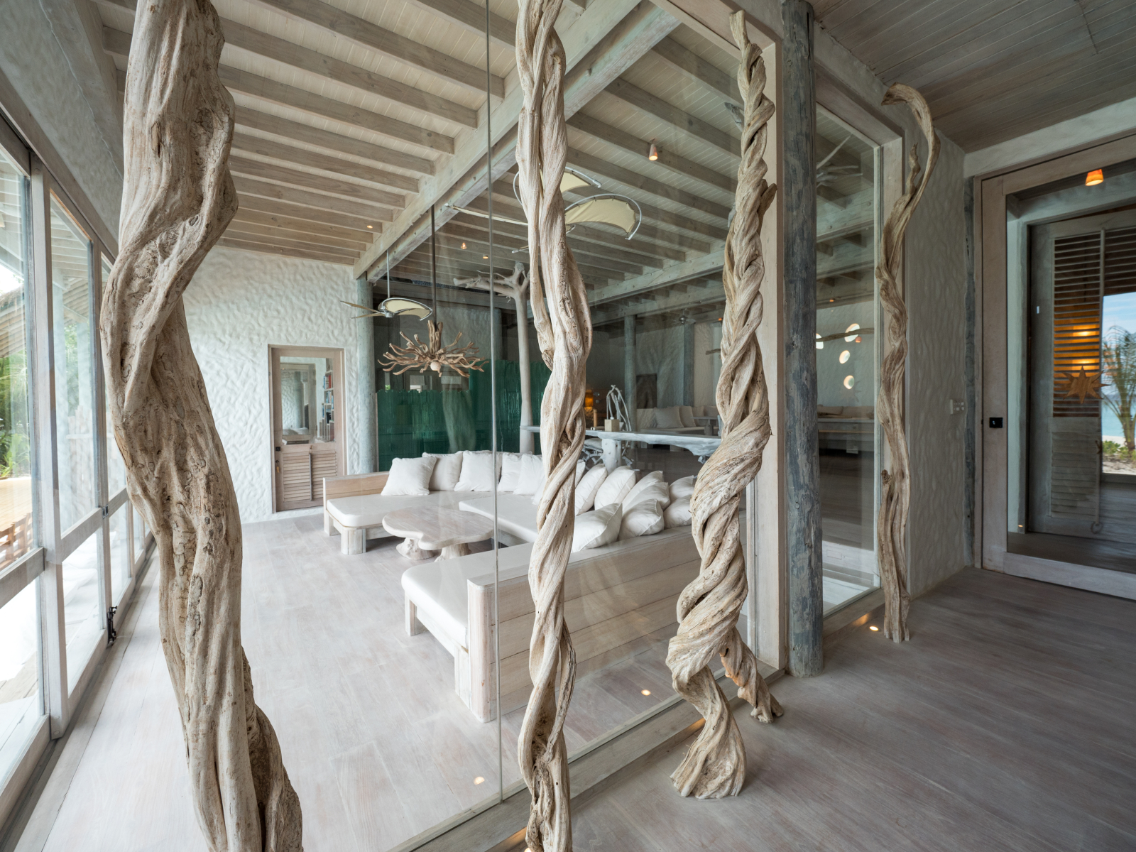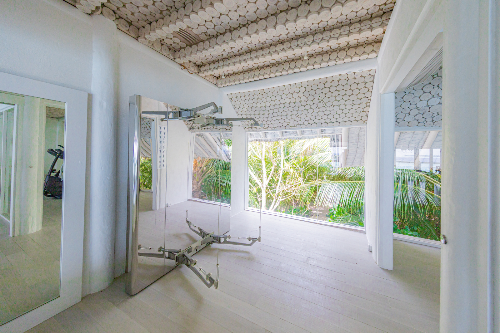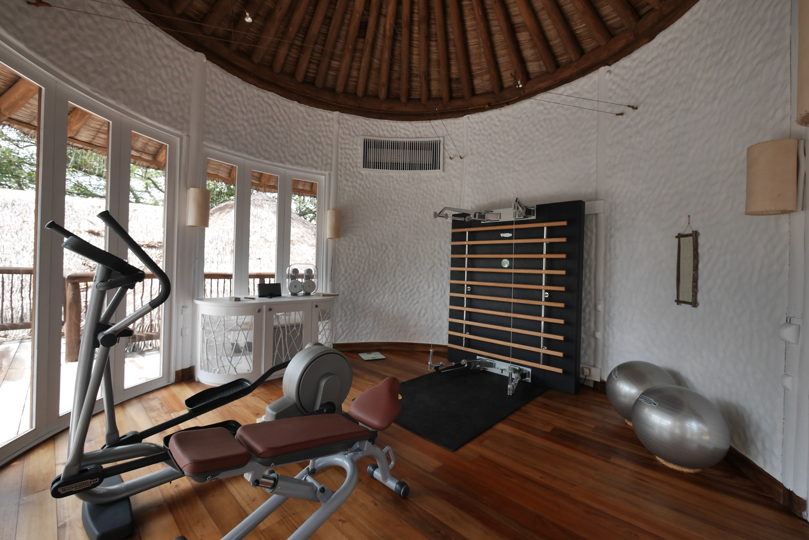 На 1-м этаже: 2 спальни (каждая с кроватью king-size), гостиная, ванная комната на открытом воздухе с ванной и душем, тренажёрный зал, комната для спа-процедур, парная, терраса с бассейном.