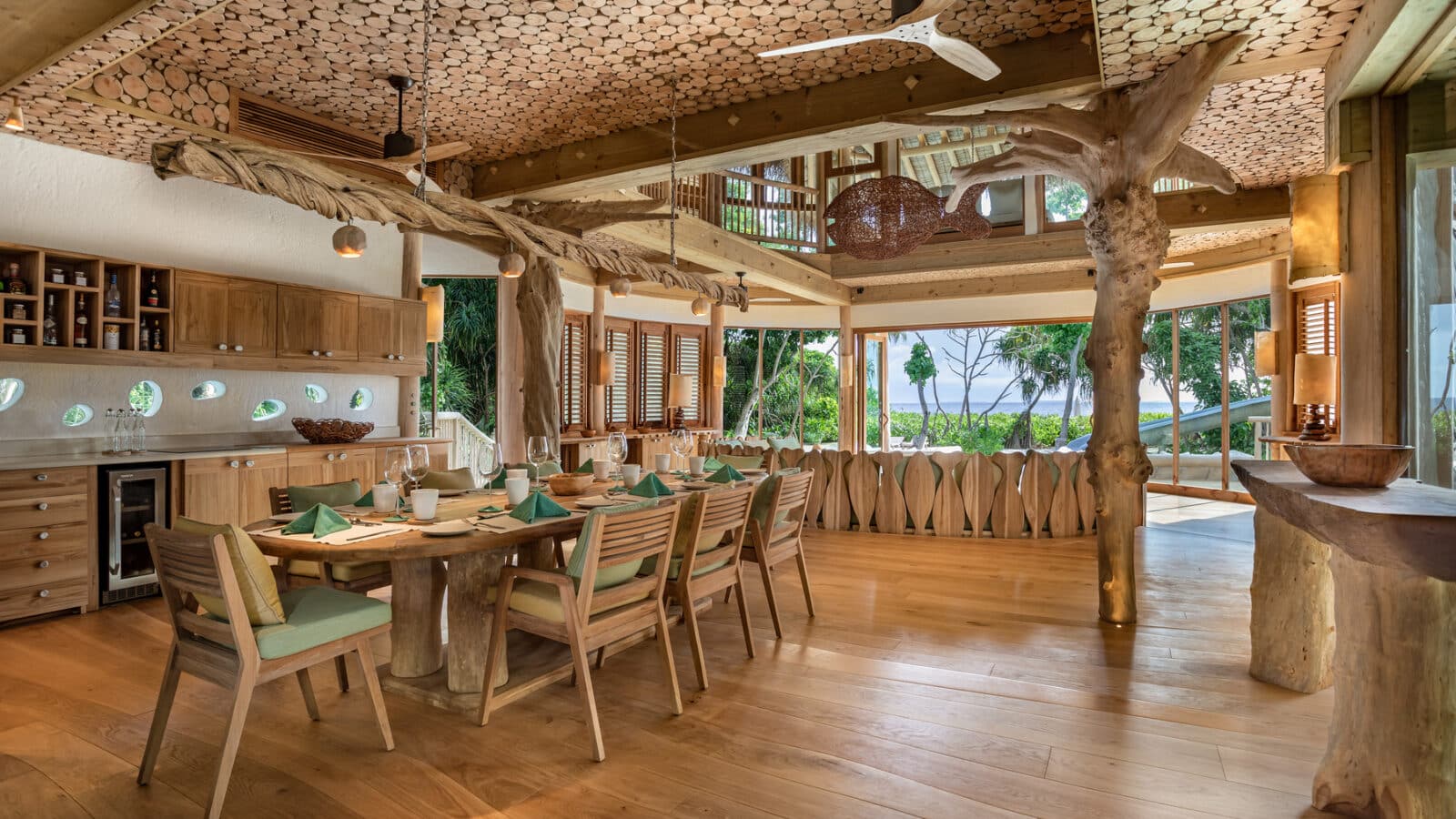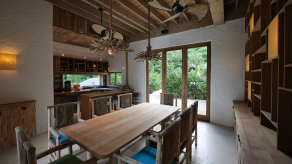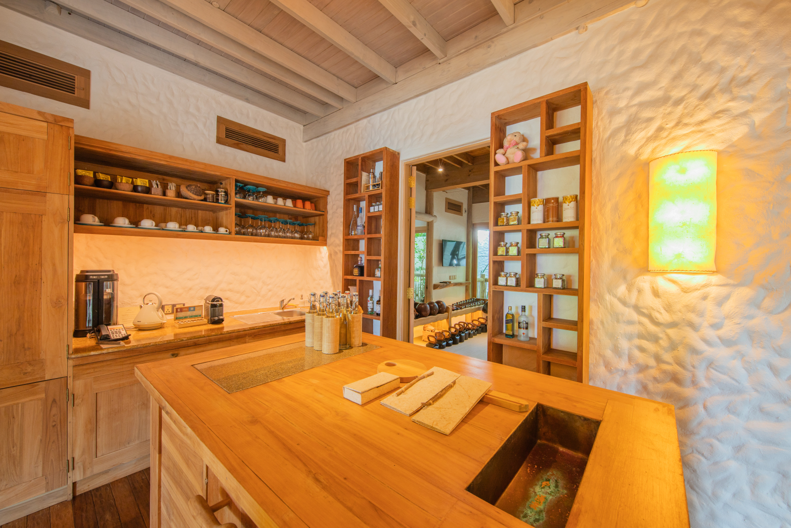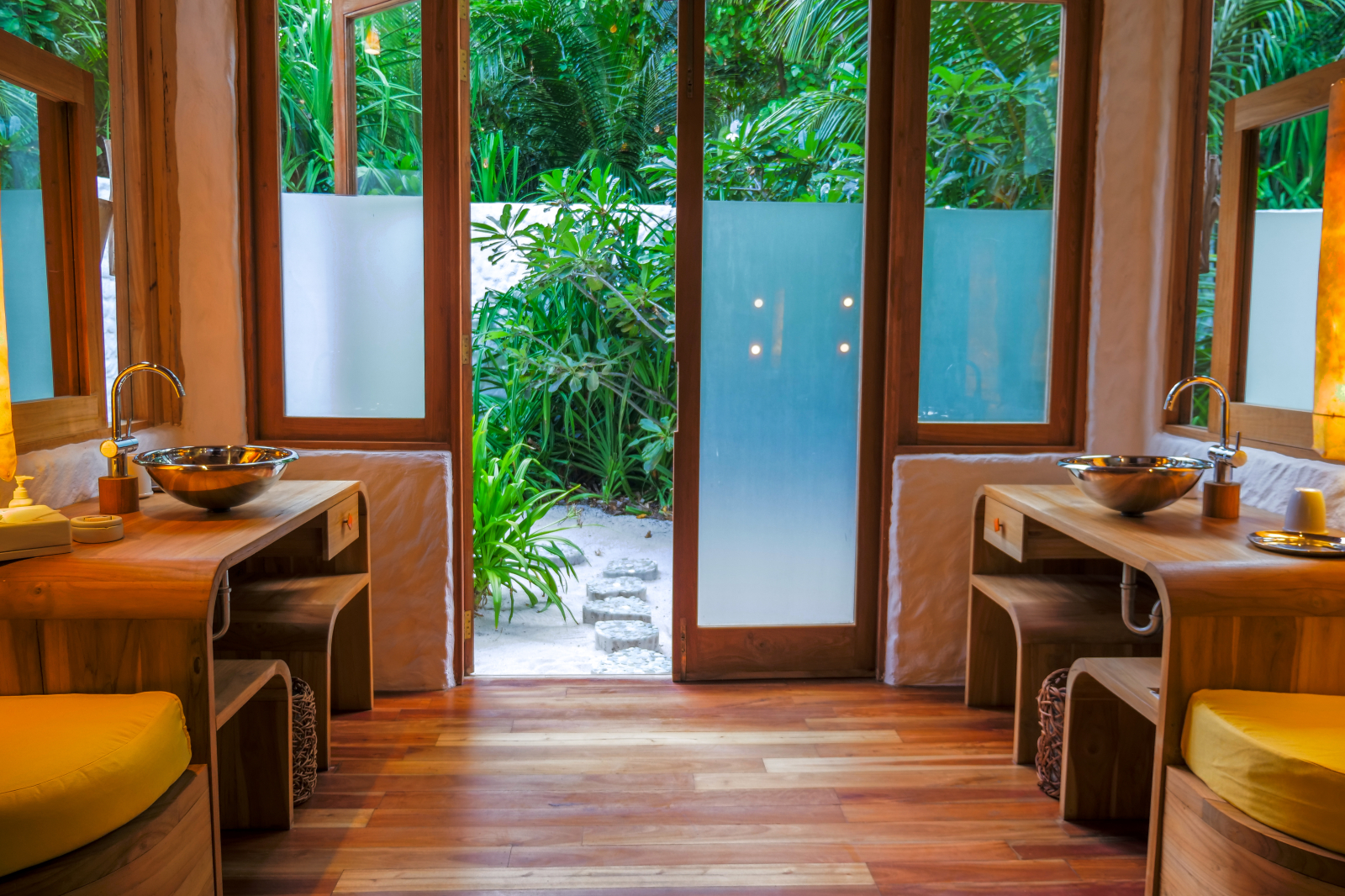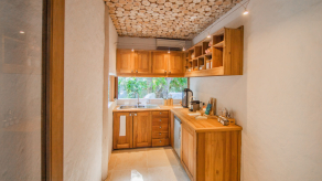 На 1-м этаже: 2 спальни (каждая с кроватью king-size или кроватями twin), гостиная, столовая с кухней, гардеробная, 2 ванные комнаты (одна – с душем, другая – с ванной и душем на открытом воздухе), терраса с бассейном. Гостиная и спальни разделены дверями.