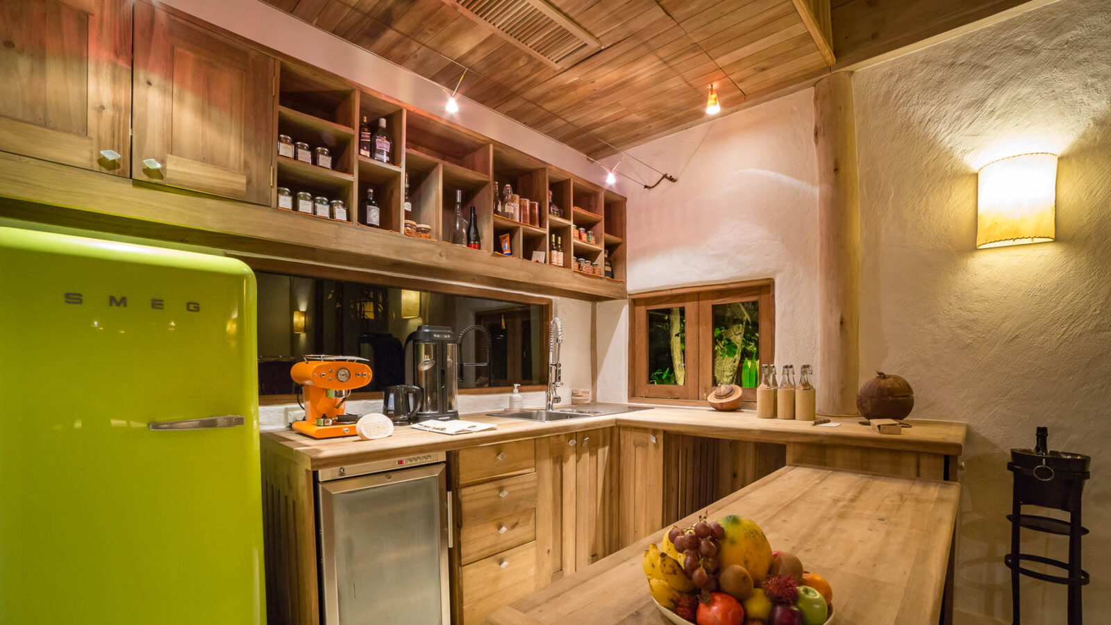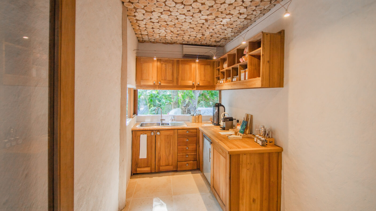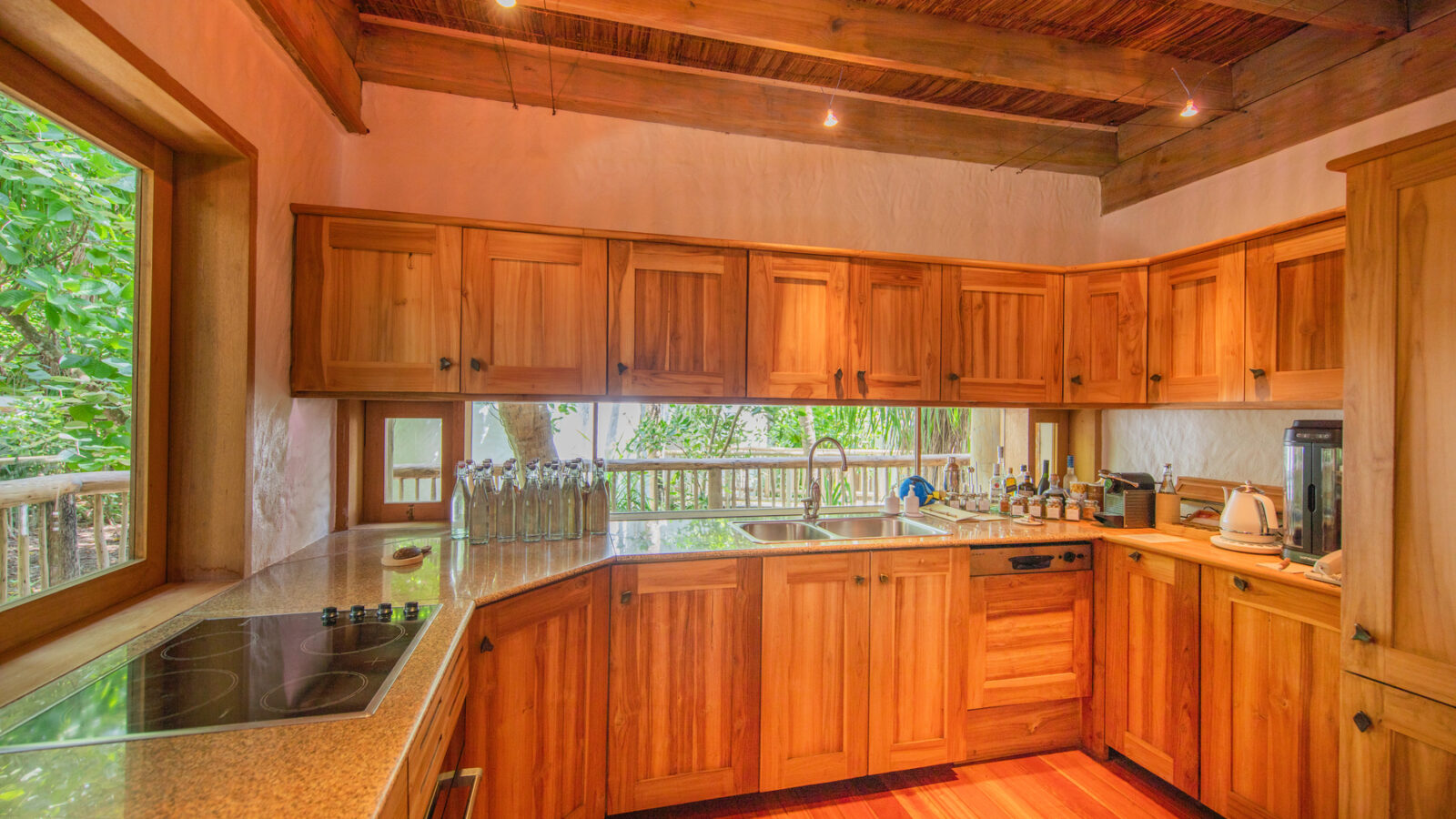 На 1-м этаже: 2 спальни (каждая с кроватью king-size или кроватями twin), гостиная, столовая с кухней, гардеробная, 2 ванные комнаты (одна – с душем, другая – с ванной и душем на открытом воздухе), терраса с бассейном. Гостиная и спальни разделены дверями.