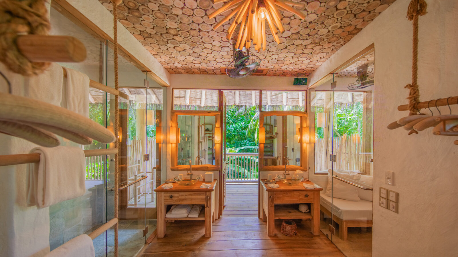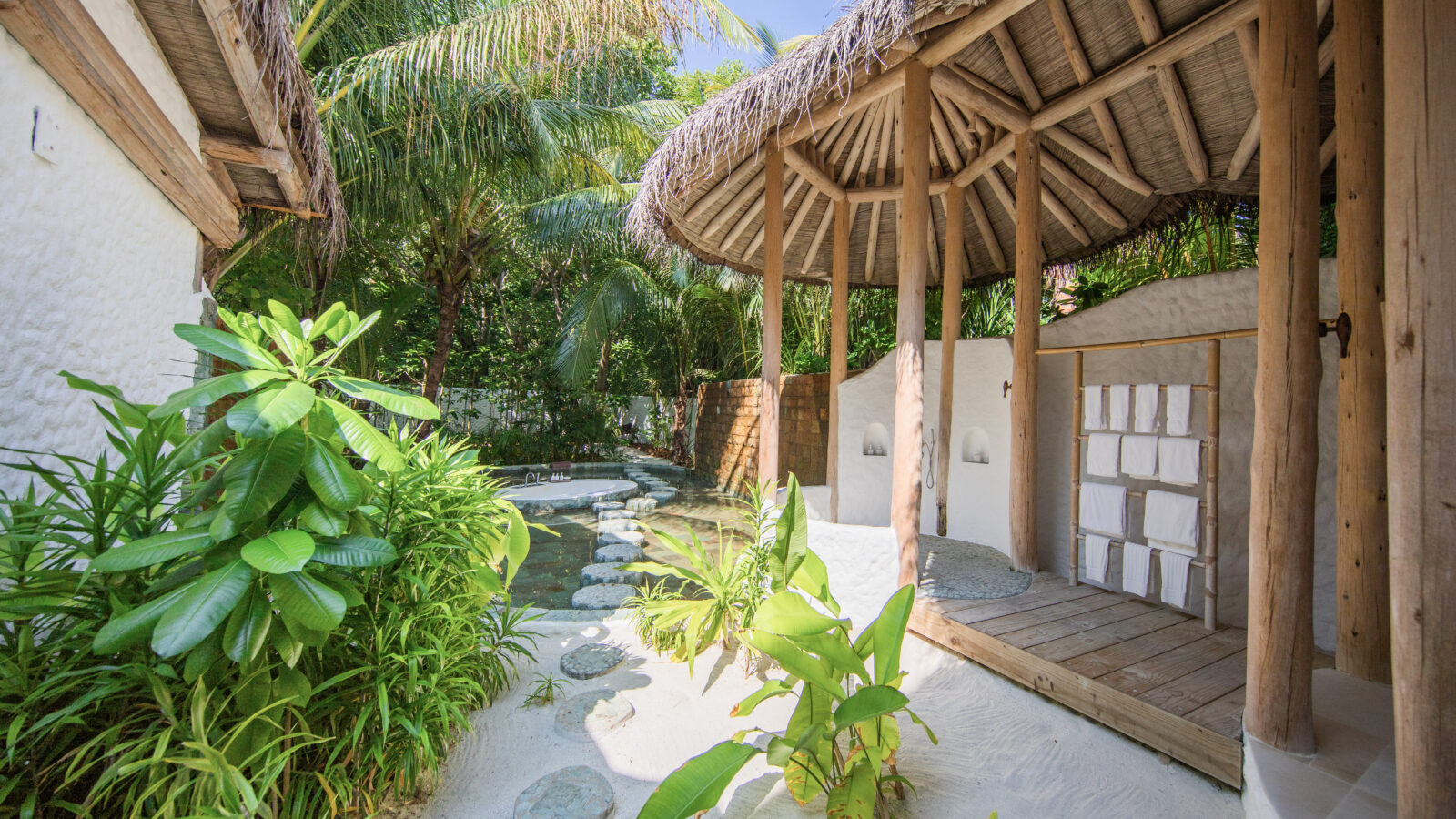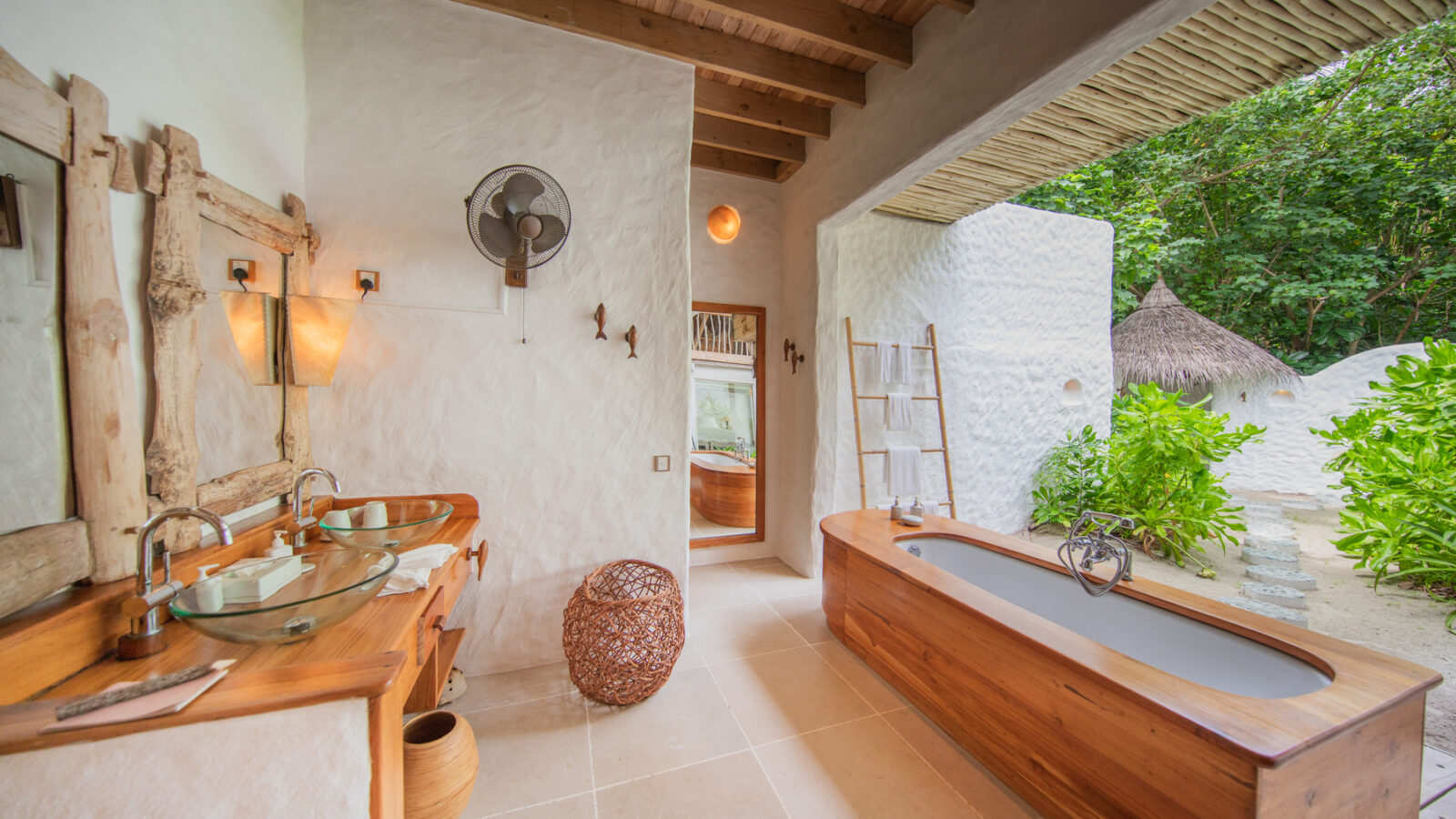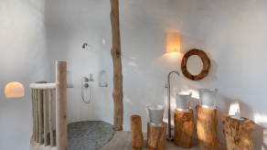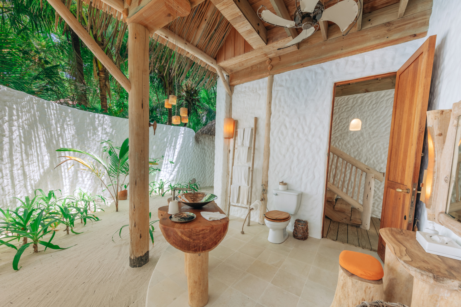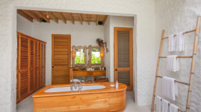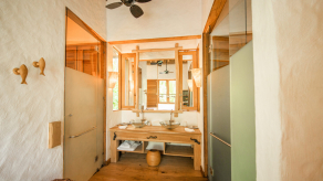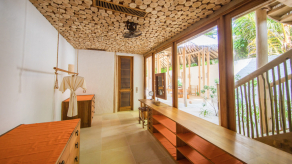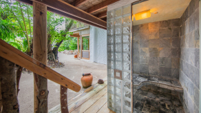 На 2-й вилле: на 1-м этаже: гардеробная, ванная комната на открытом воздухе с ванной и душем; на 2-м этаже: спальня с кроватью king-size, туалет, балкон.