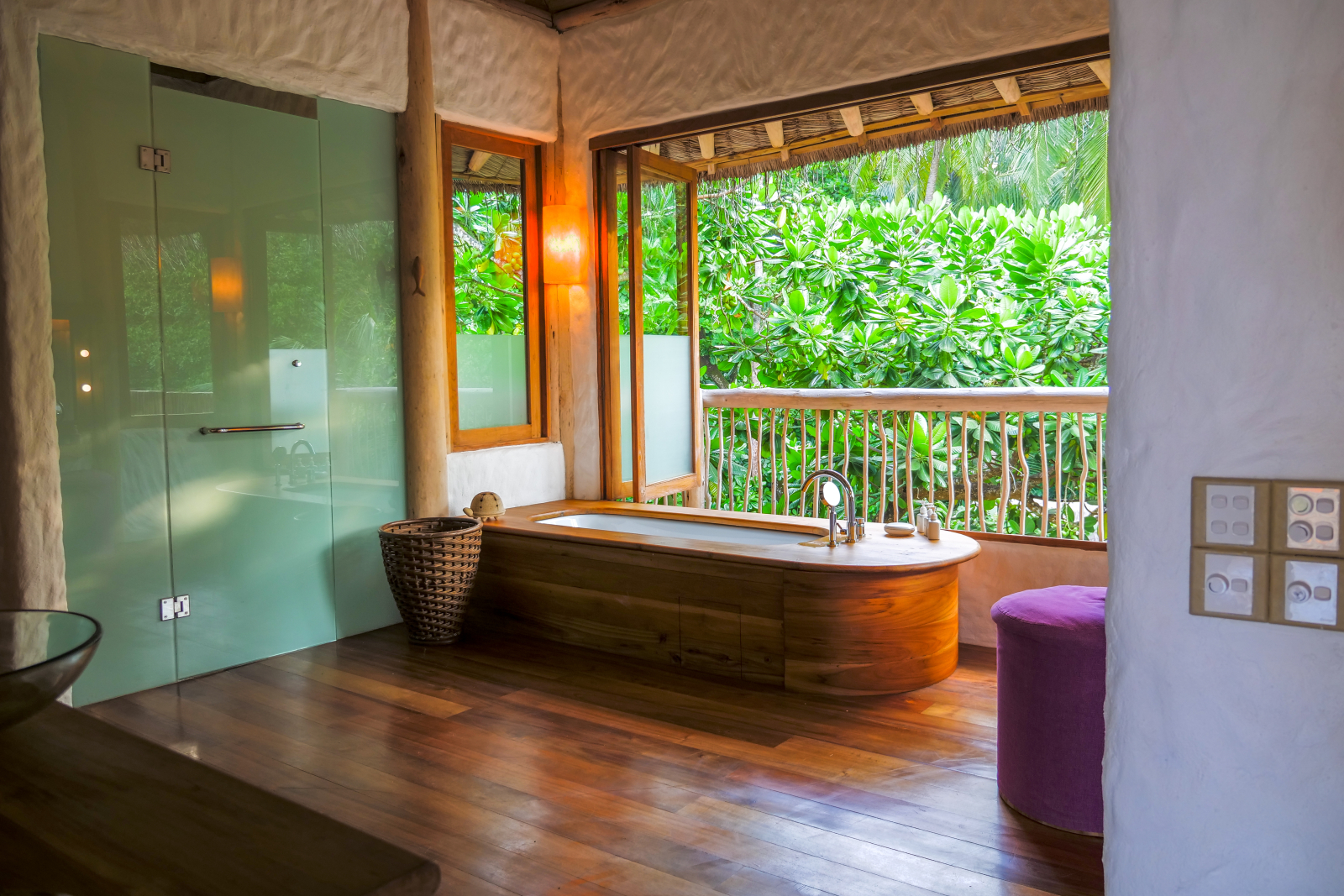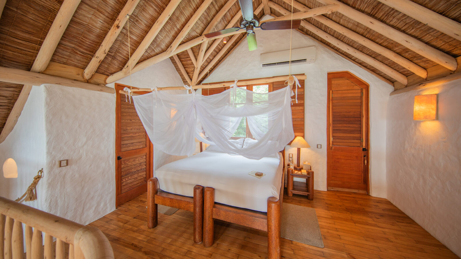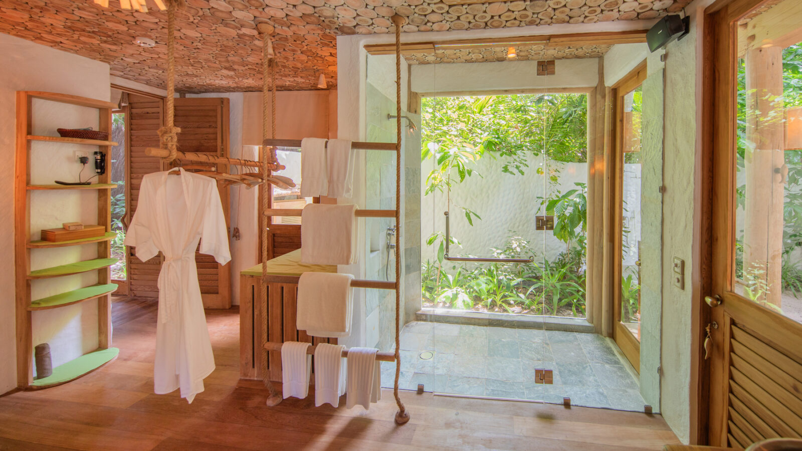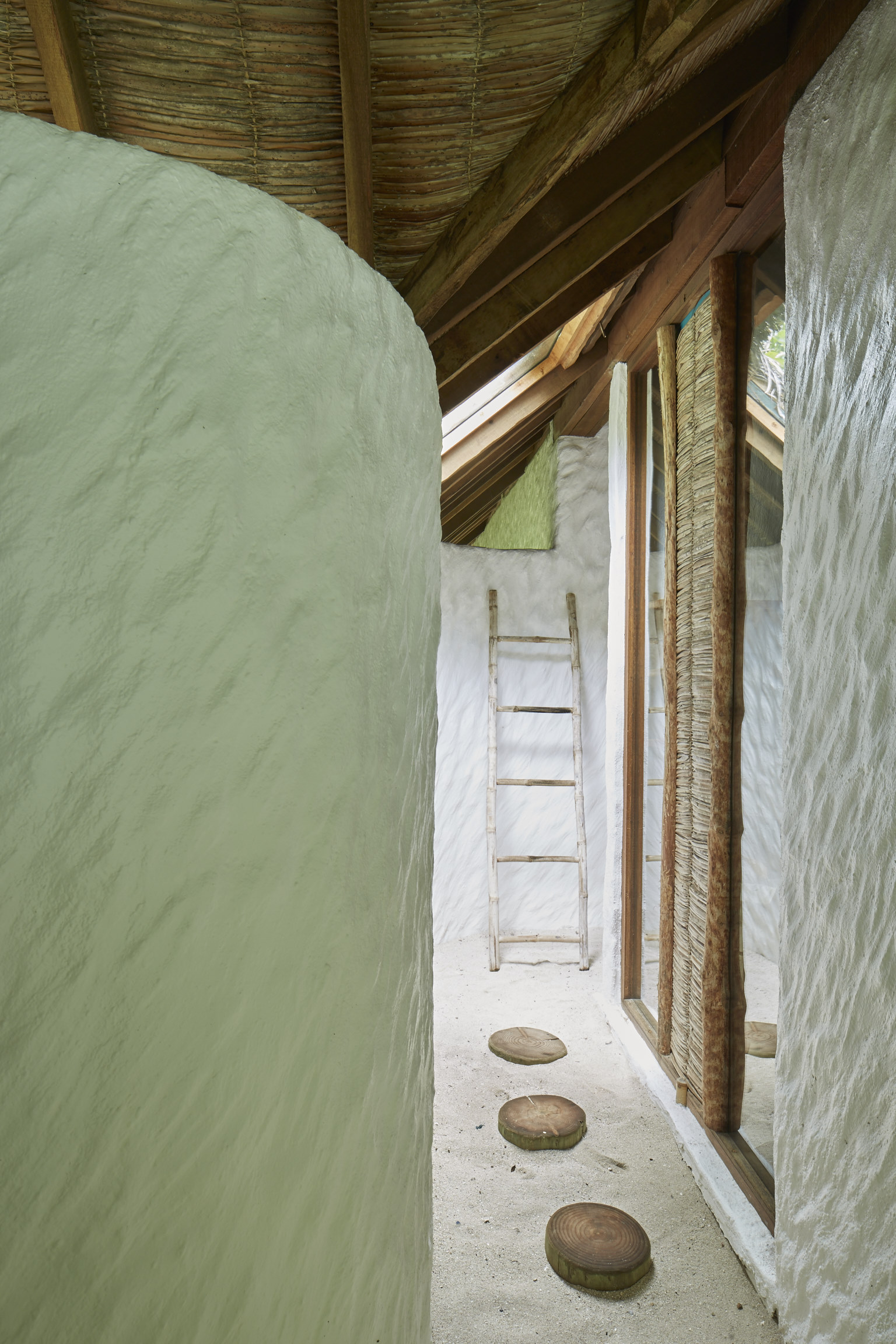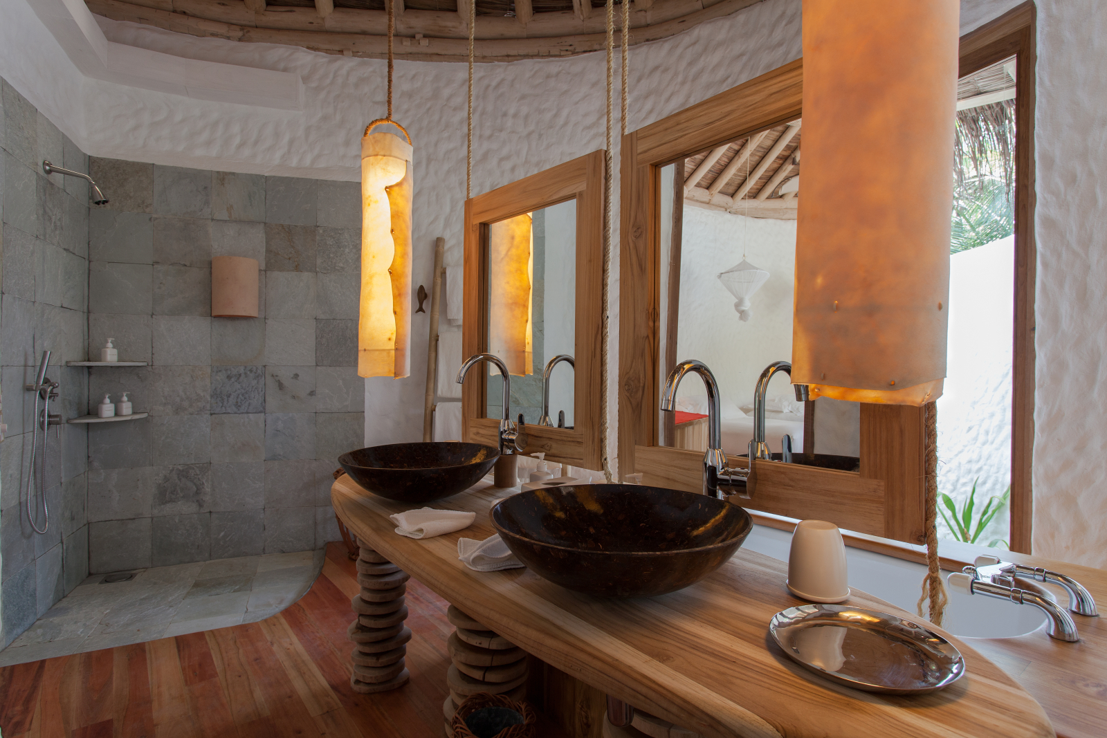 На 2-й вилле: на 1-м этаже: гардеробная, ванная комната на открытом воздухе с ванной и душем; на 2-м этаже: спальня с кроватью king-size, туалет, балкон.