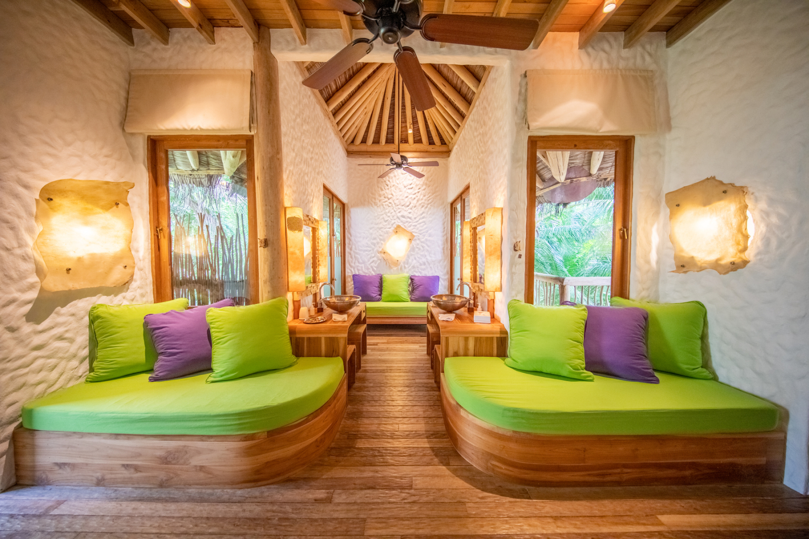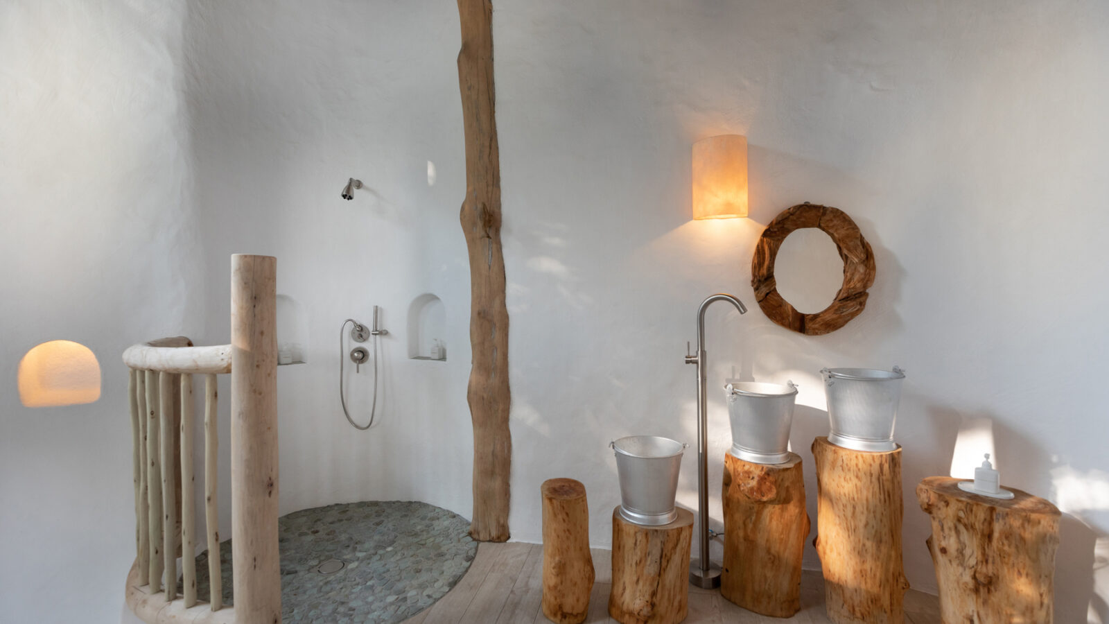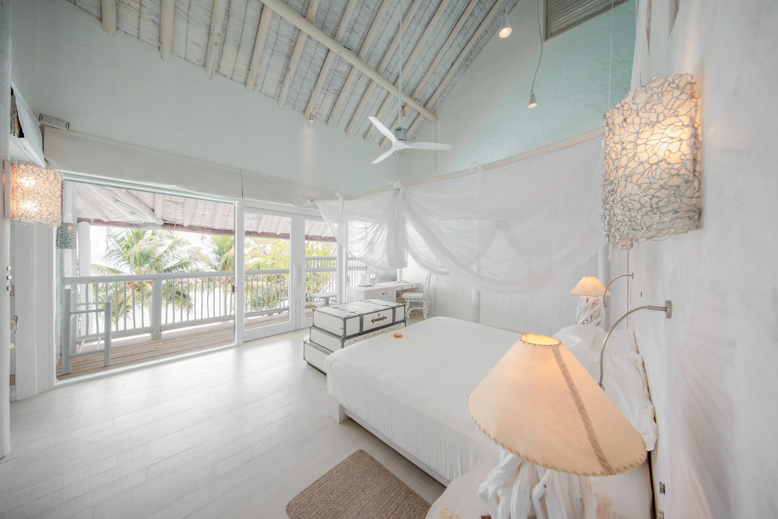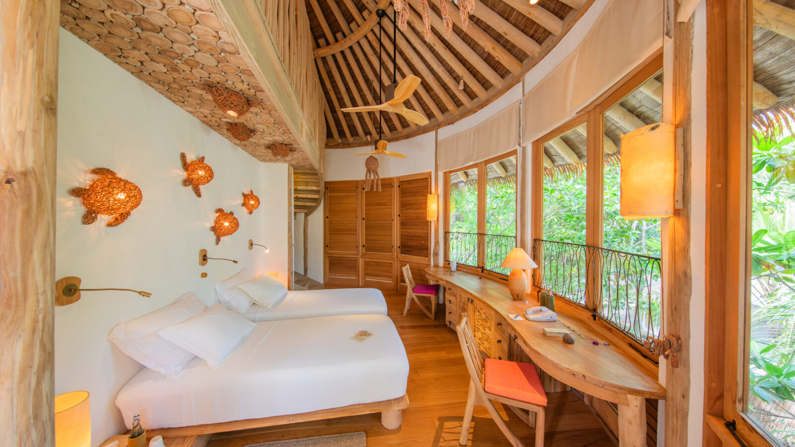 На 2-й вилле: на 1-м этаже: гардеробная, ванная комната на открытом воздухе с ванной и душем; на 2-м этаже: спальня с кроватью king-size, туалет, балкон.
