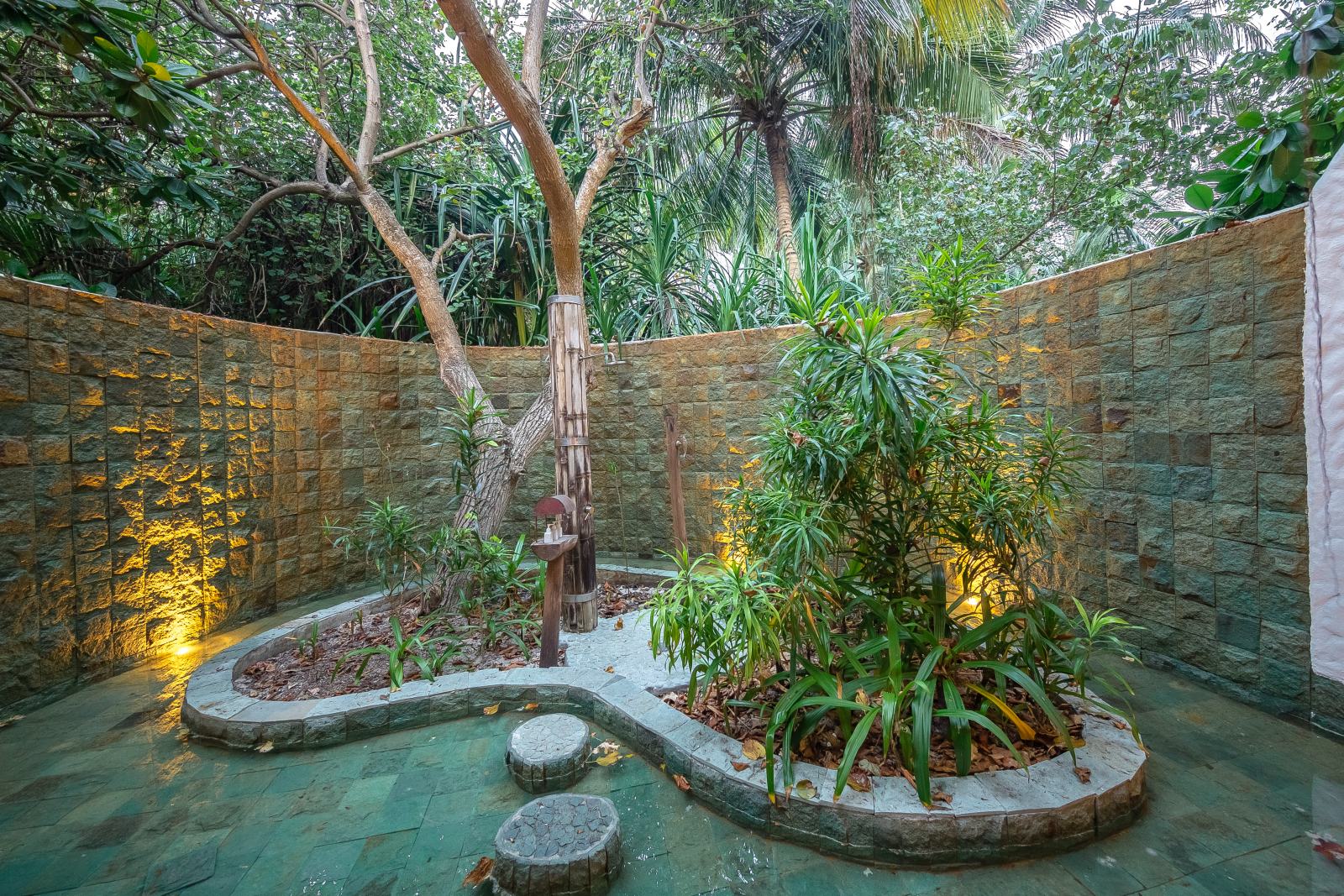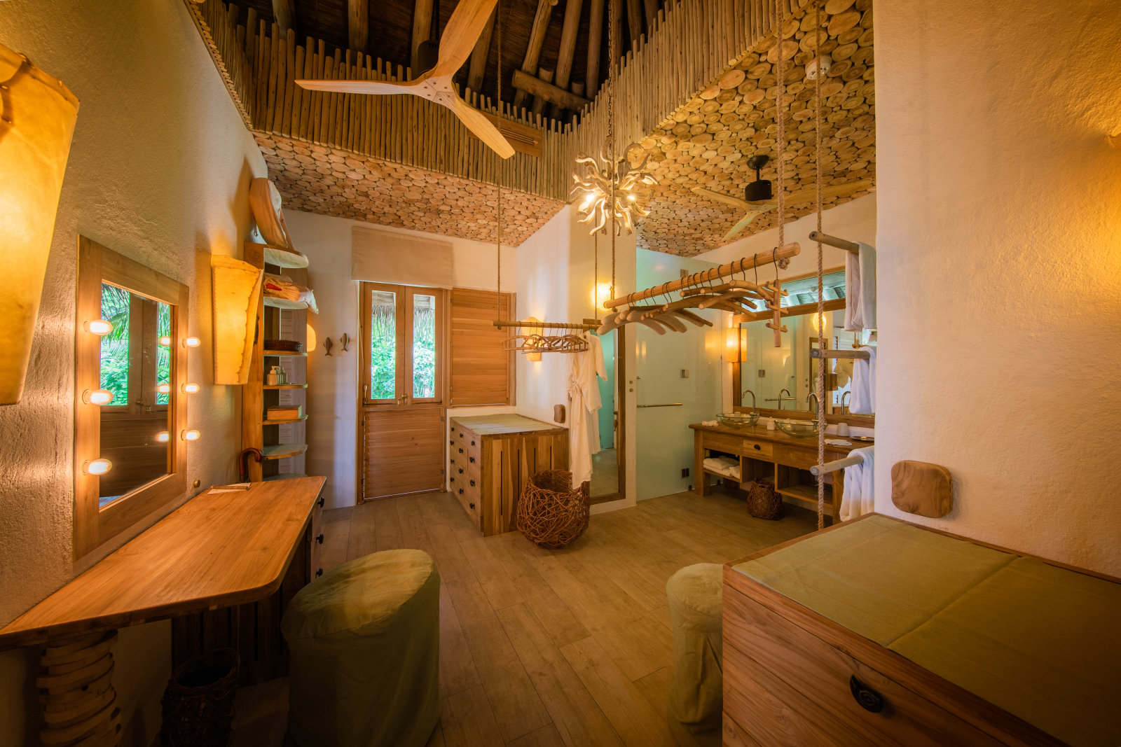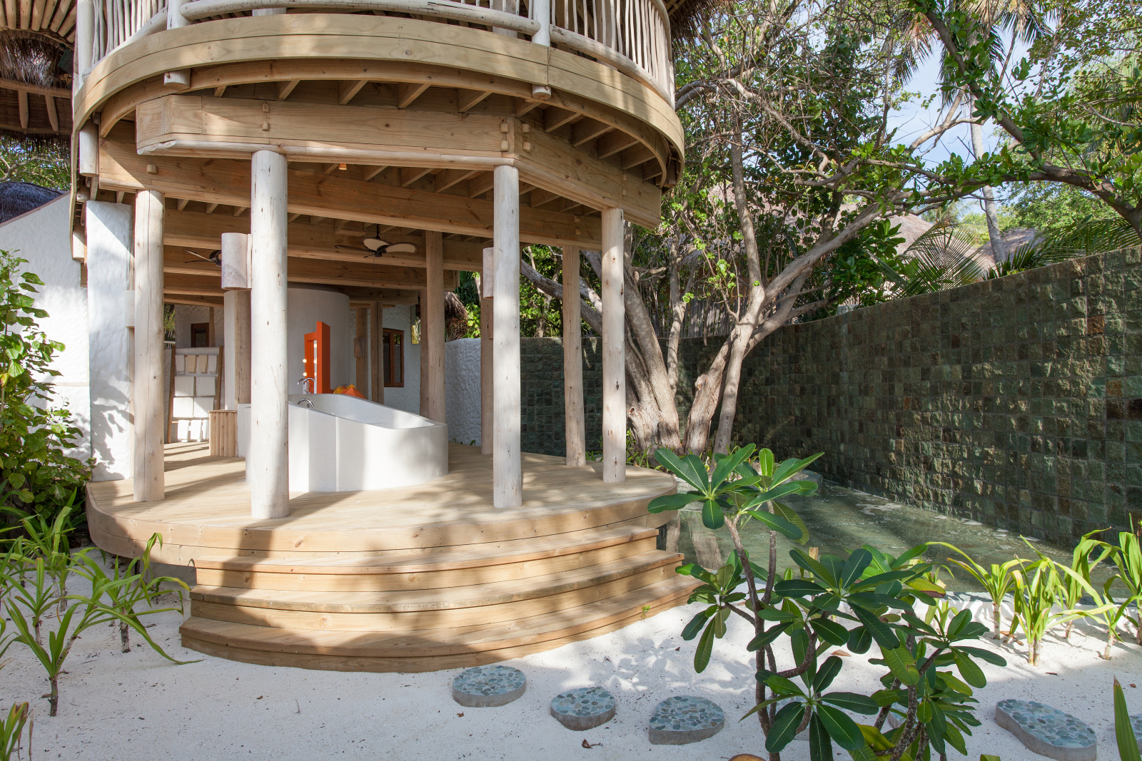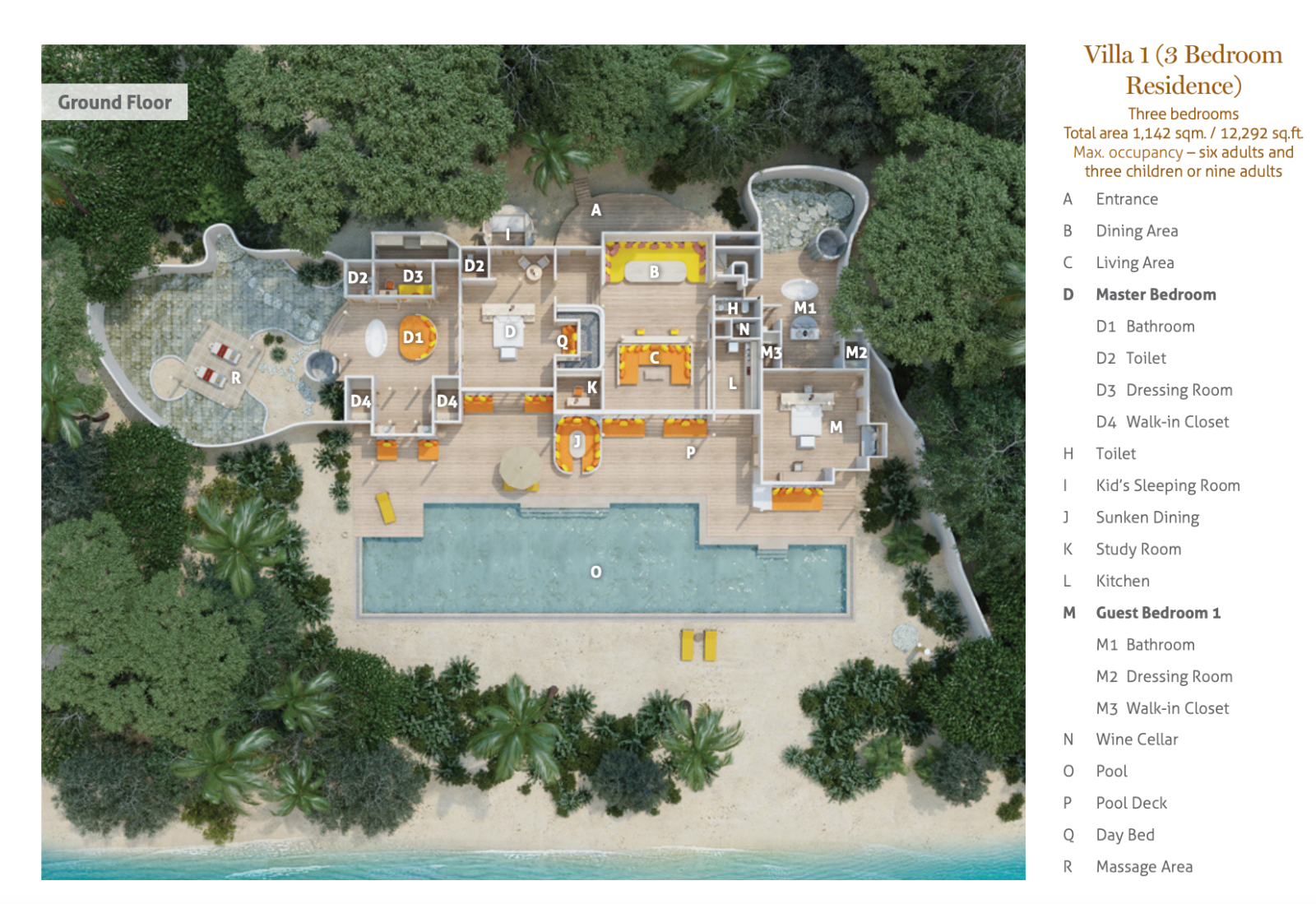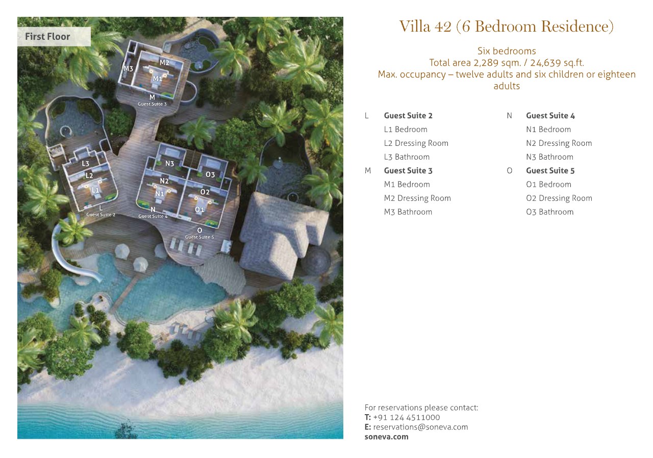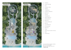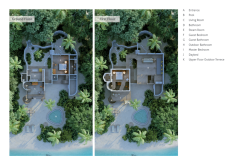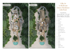 На 1-м этаже: спальня с кроватью king-size, гостиная, гардеробная, ванная комната с ванной и душем на открытом воздухе, терраса с бассейном. Гостиная и спальня разделены дверью. В отдельном павильоне: спальня с кроватью king-size, ванная комната с ванной и душем на открытом воздухе, терраса.