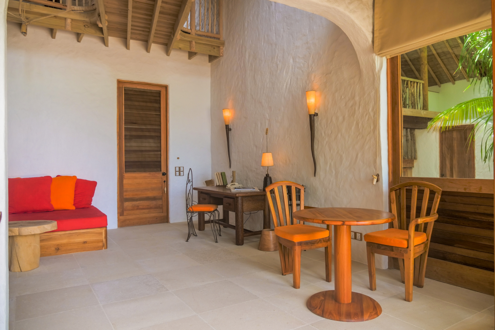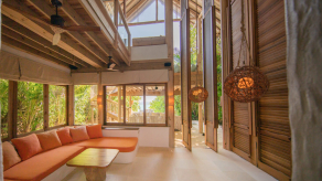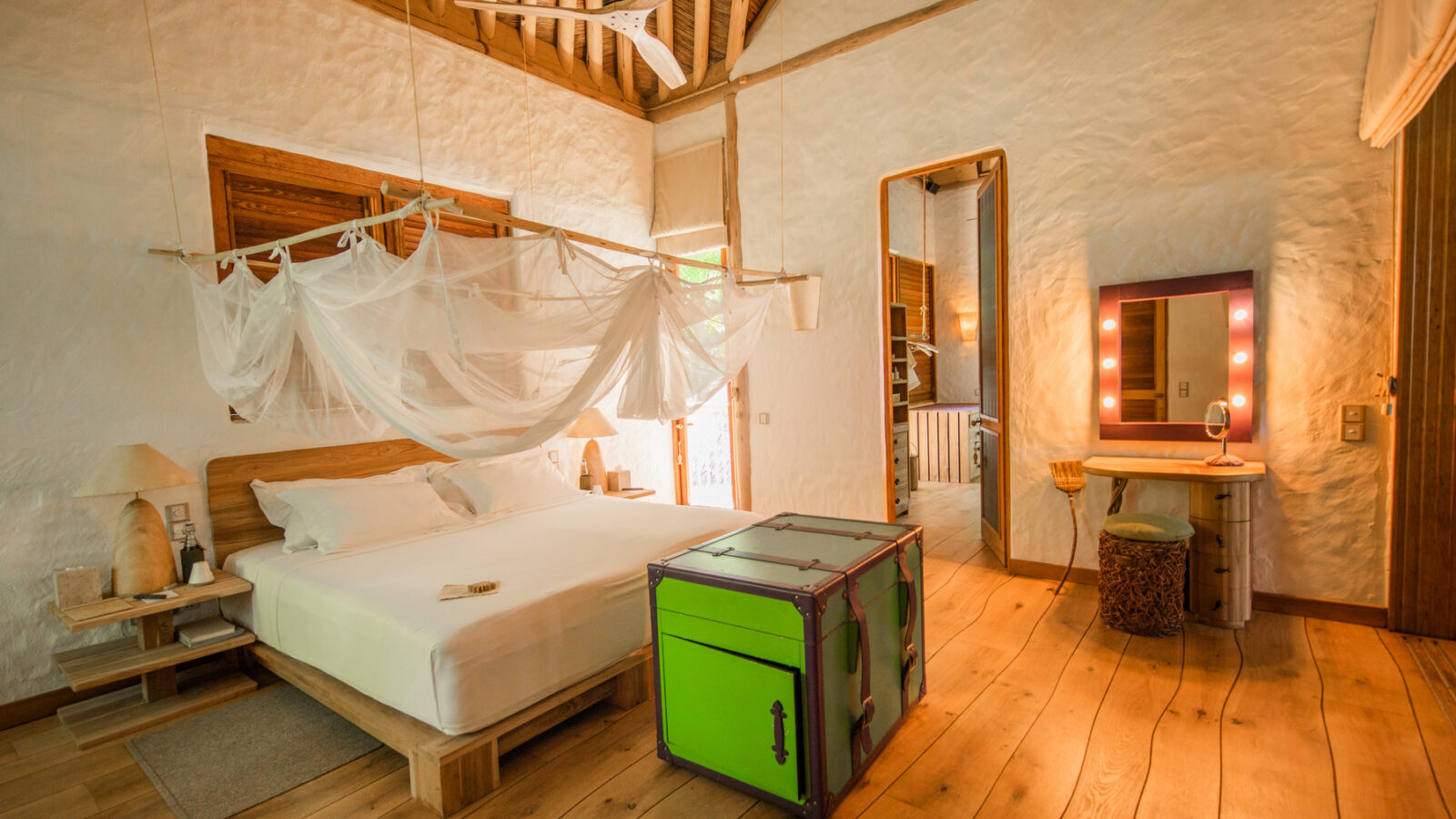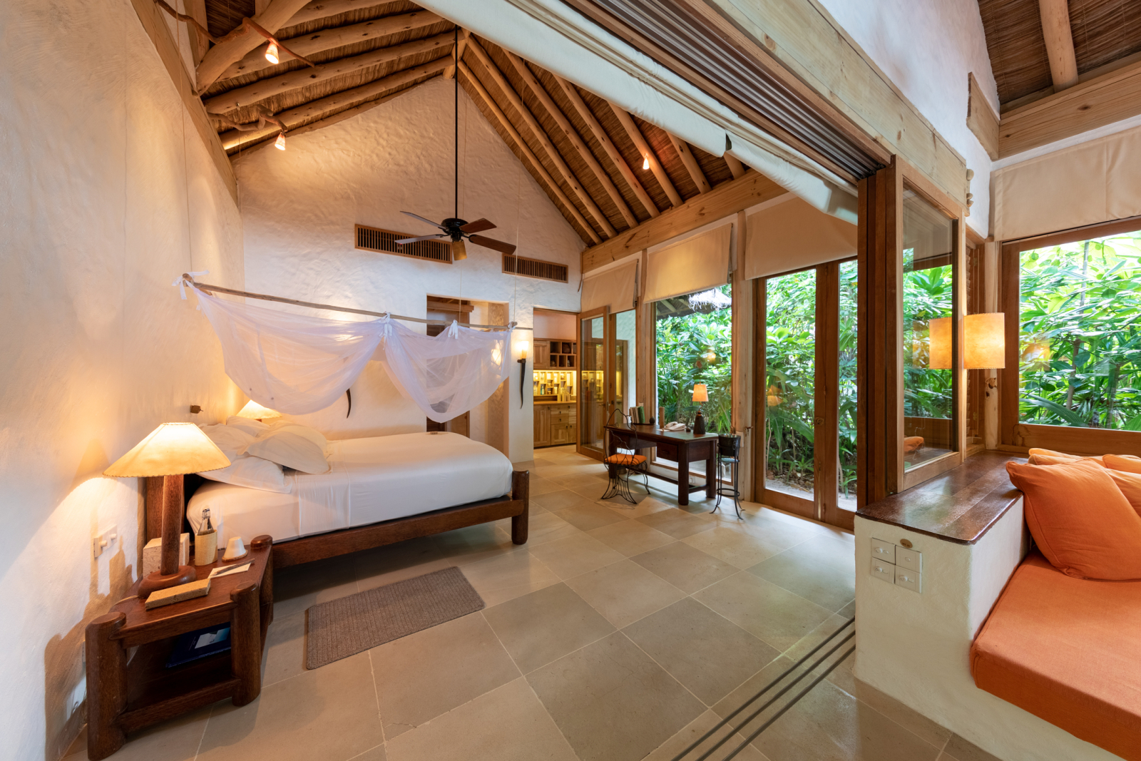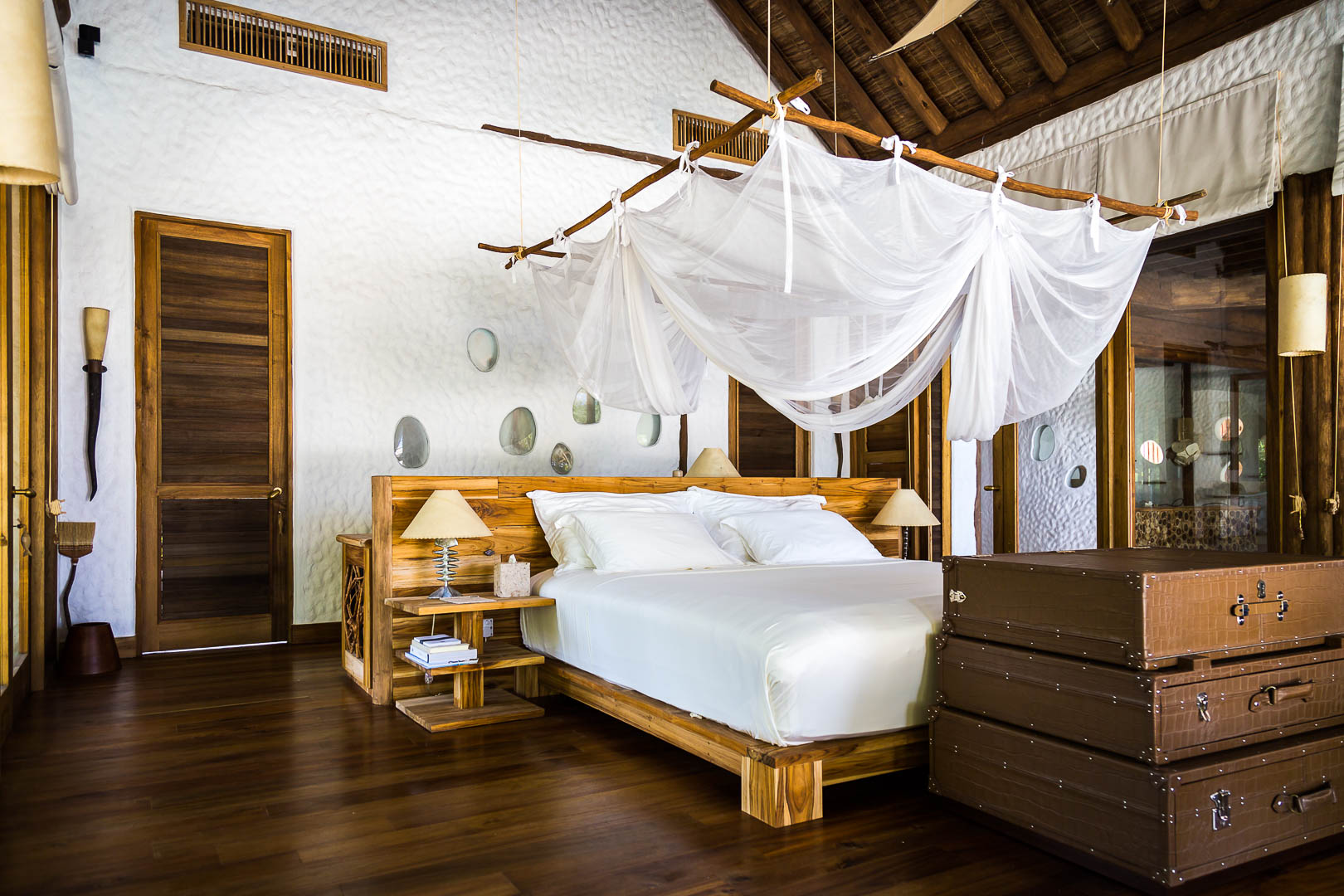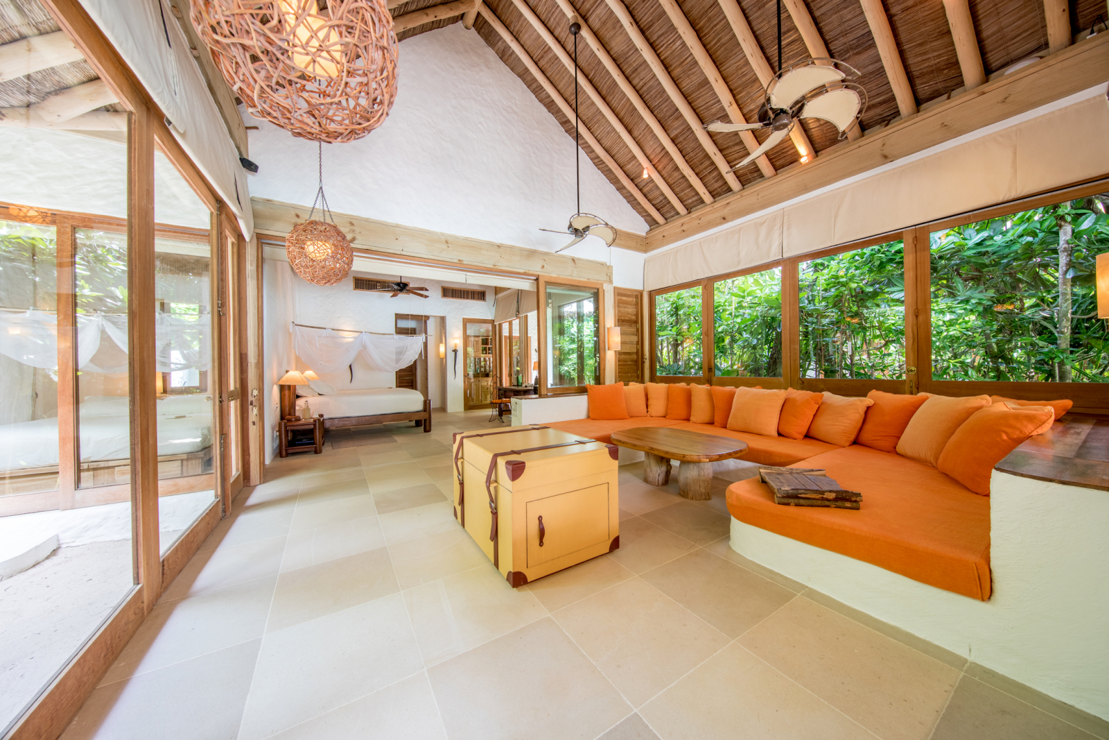На 1-м этаже: спальня с кроватью king-size, гостиная, гардеробная, ванная комната с ванной и душем на открытом воздухе, терраса с бассейном. Гостиная и спальня разделены дверью. В отдельном павильоне: спальня с кроватью king-size, ванная комната с ванной и душем на открытом воздухе, терраса.