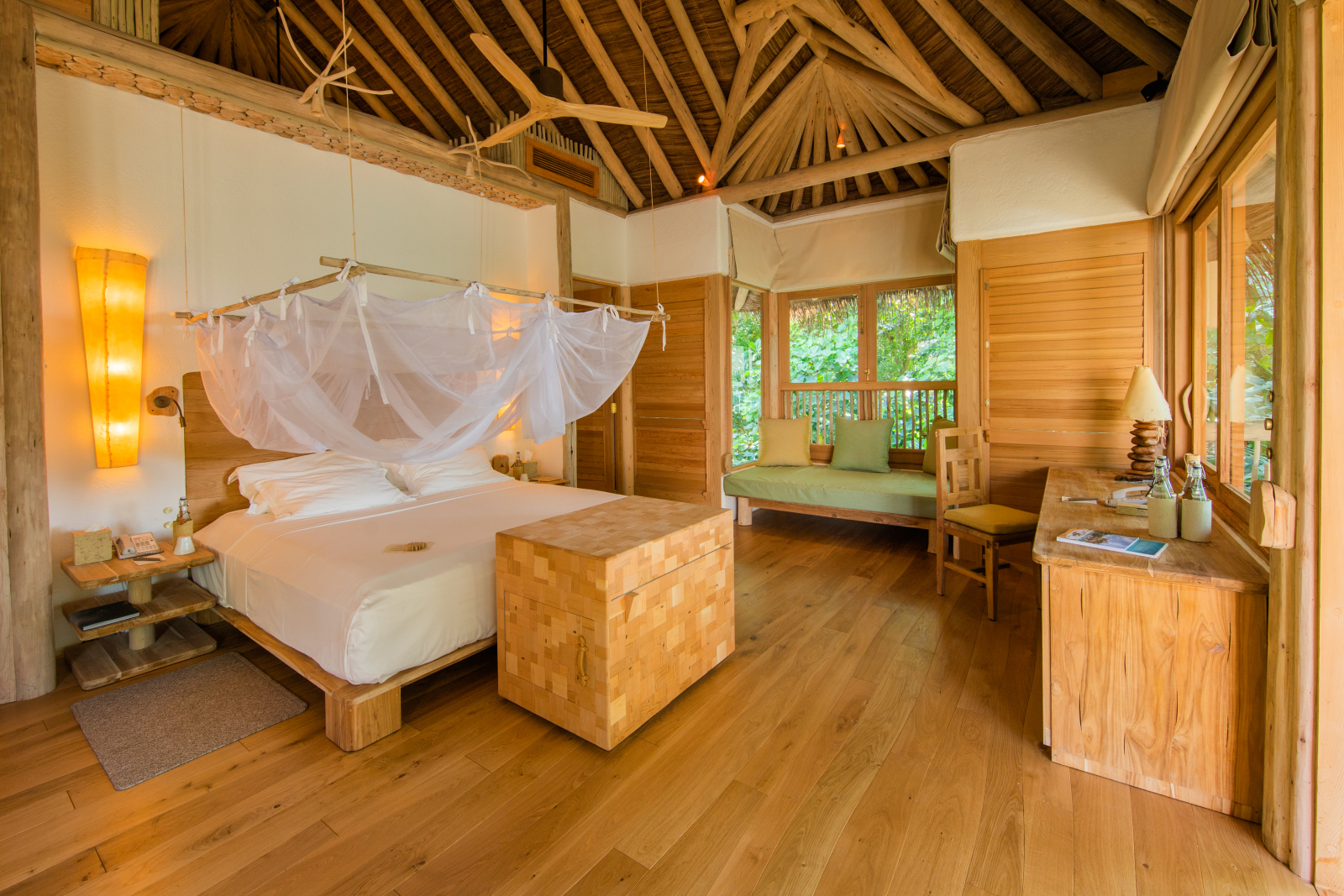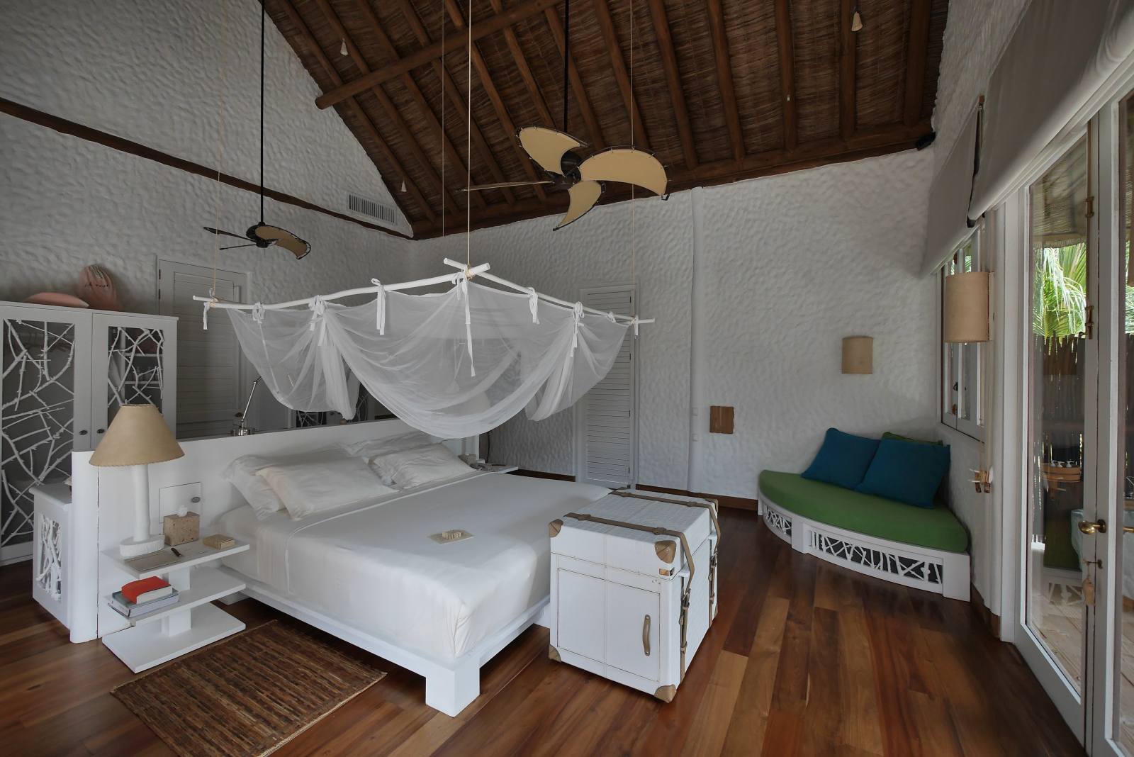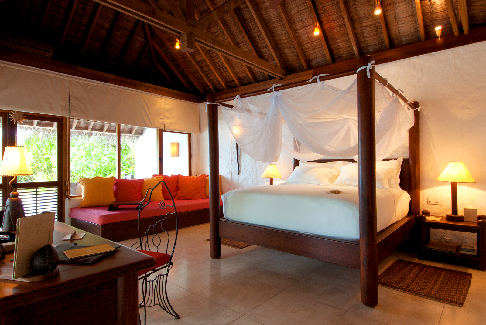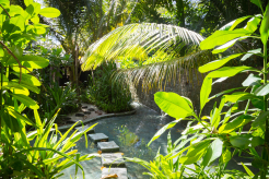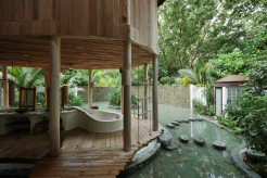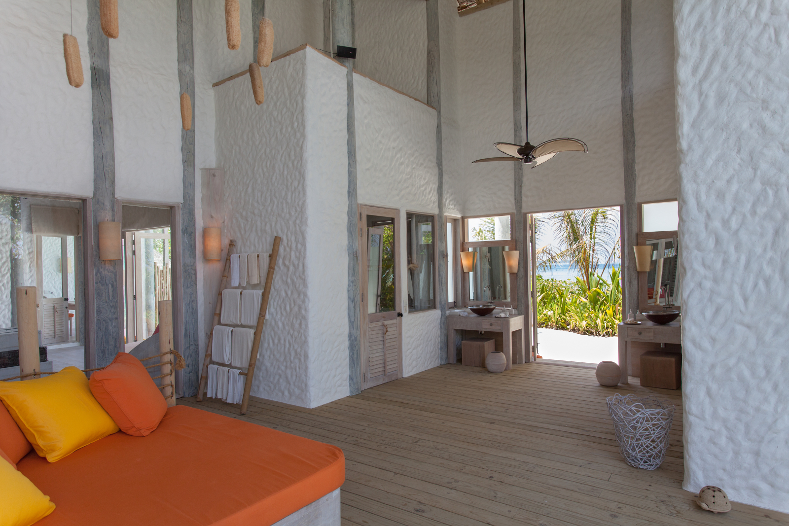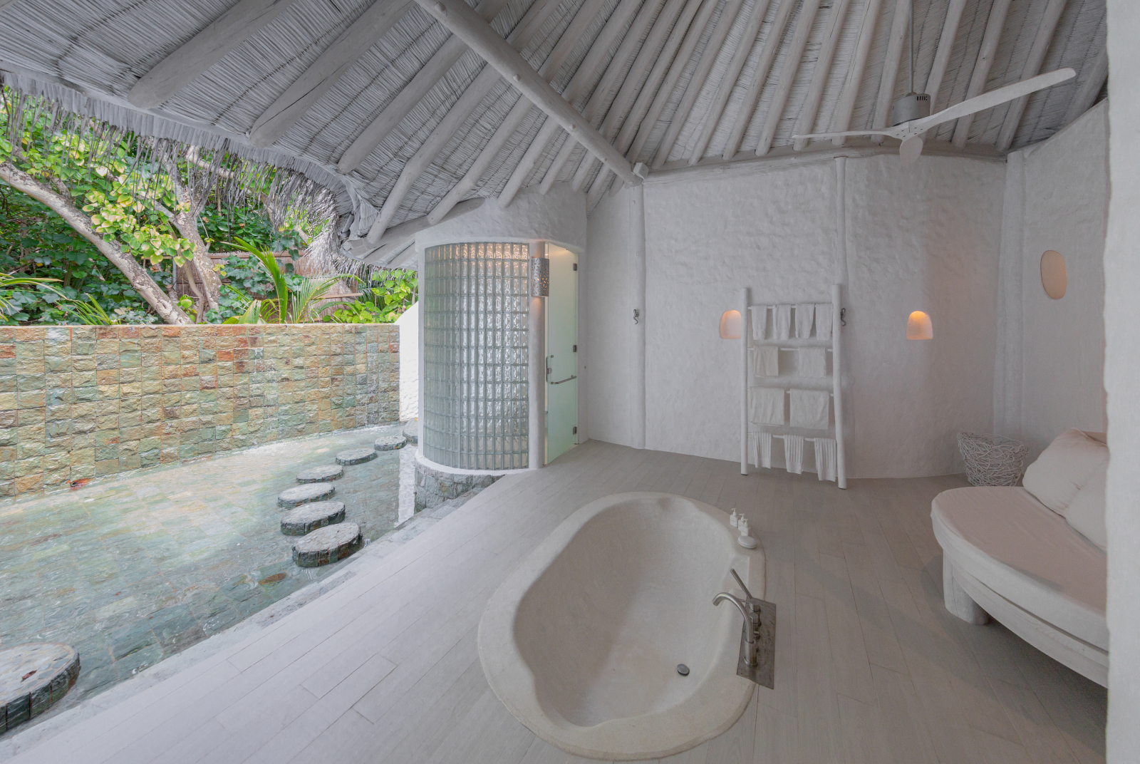 На 1-м этаже: спальня с кроватью king-size, гостиная, гардеробная, ванная комната с ванной и душем на открытом воздухе, терраса с бассейном. Гостиная и спальня разделены дверью. В отдельном павильоне: спальня с кроватью king-size, ванная комната с ванной и душем на открытом воздухе, терраса.