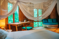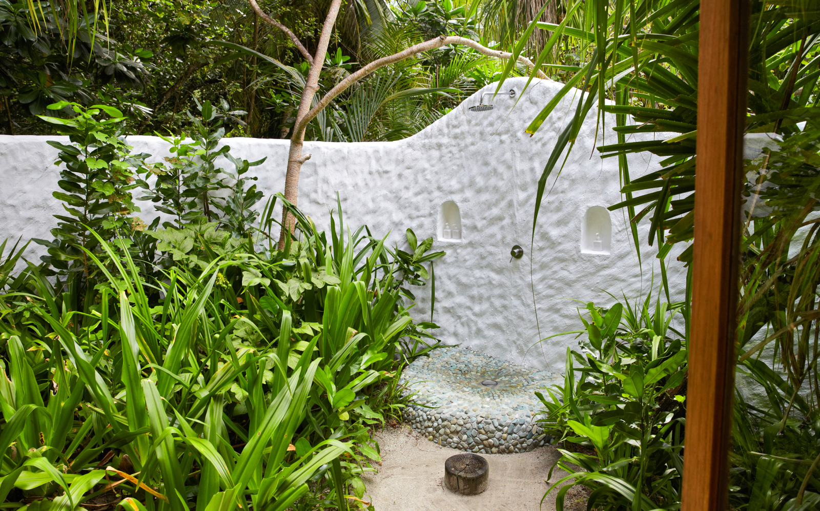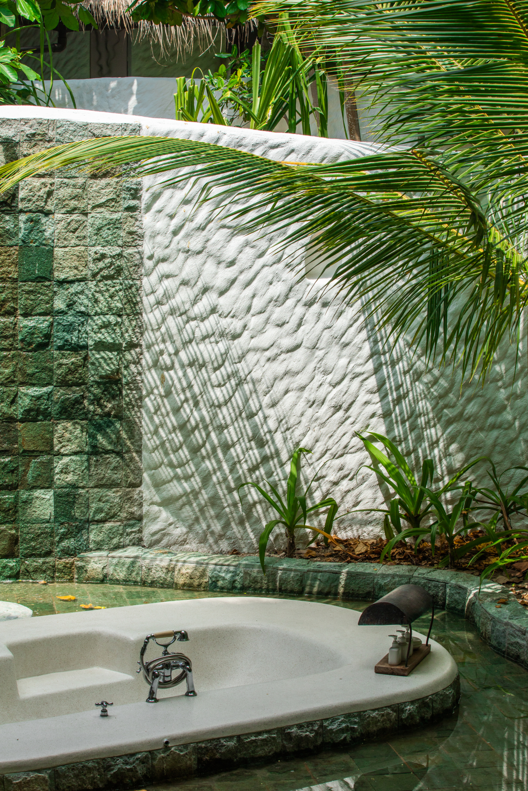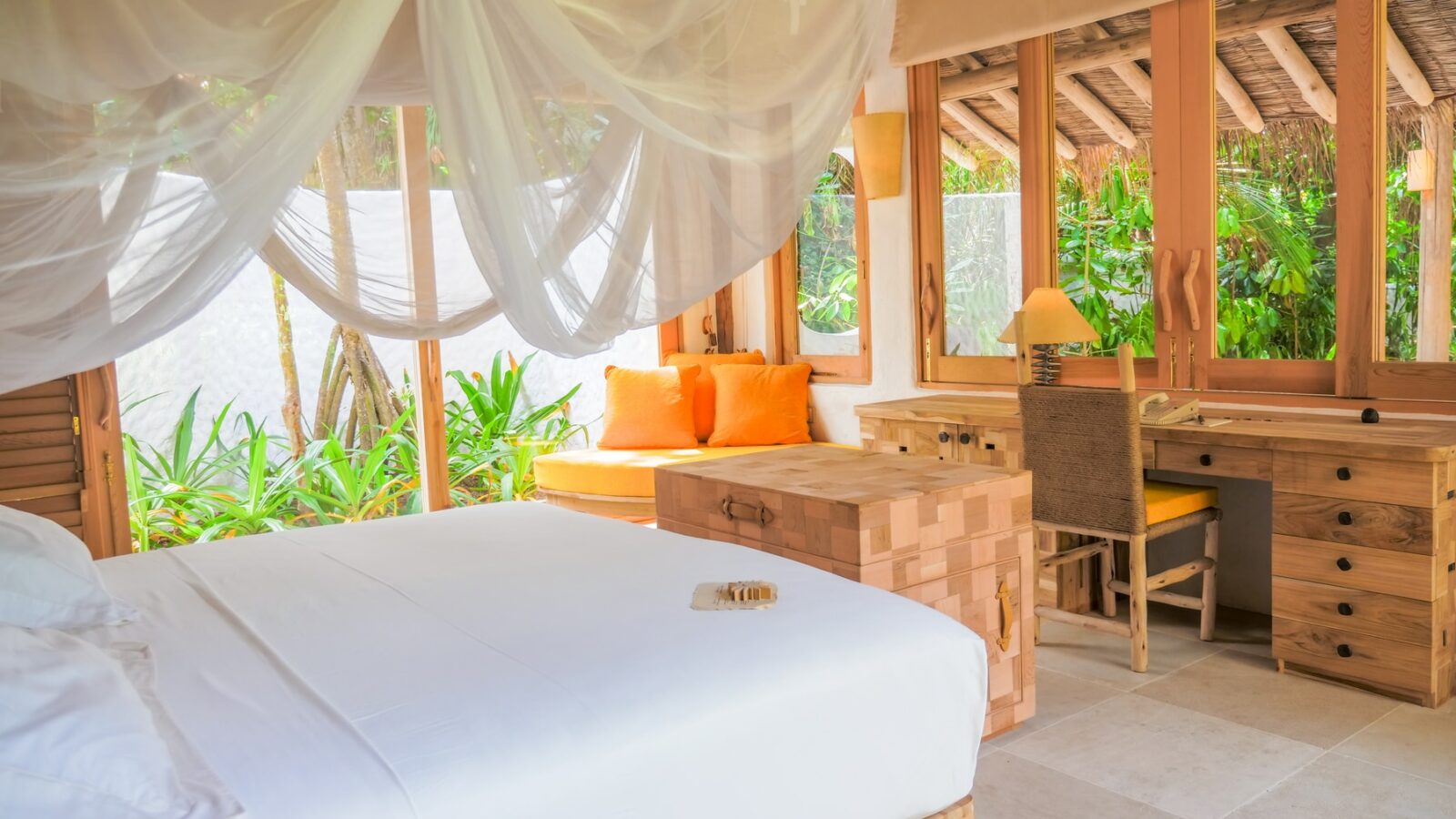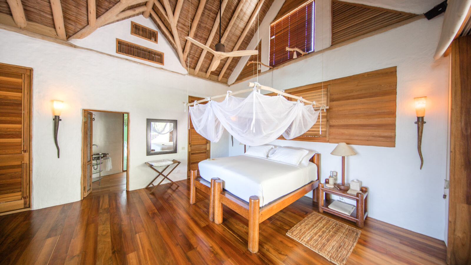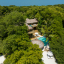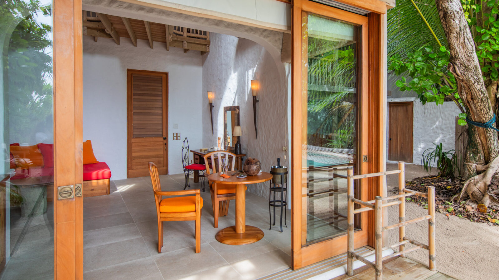 На 1-м этаже: спальня с кроватью king-size, гостиная, гардеробная, ванная комната с ванной и душем на открытом воздухе, терраса с бассейном. Гостиная и спальня разделены дверью. В отдельном павильоне: спальня с кроватью king-size, ванная комната с ванной и душем на открытом воздухе, терраса.