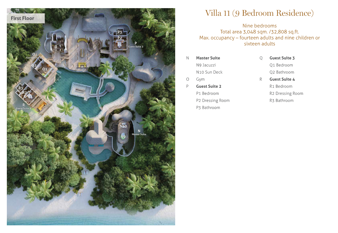 На 1-й вилле: на 1-м этаже: спальня с кроватью king-size, 2 гардеробные, ванная комната с душевой кабиной и с ванной и душем на открытом воздухе, сауна, парная, гостевой туалет; на 2-м этаже: спальня с кроватью king-size, ванная комната с душевой кабиной, тренажёрный зал с ванной комнатой, балкон.