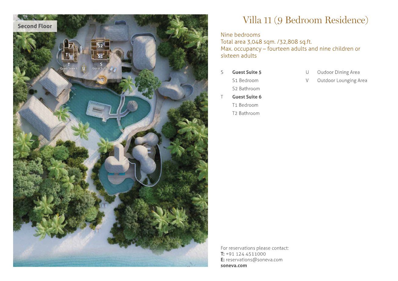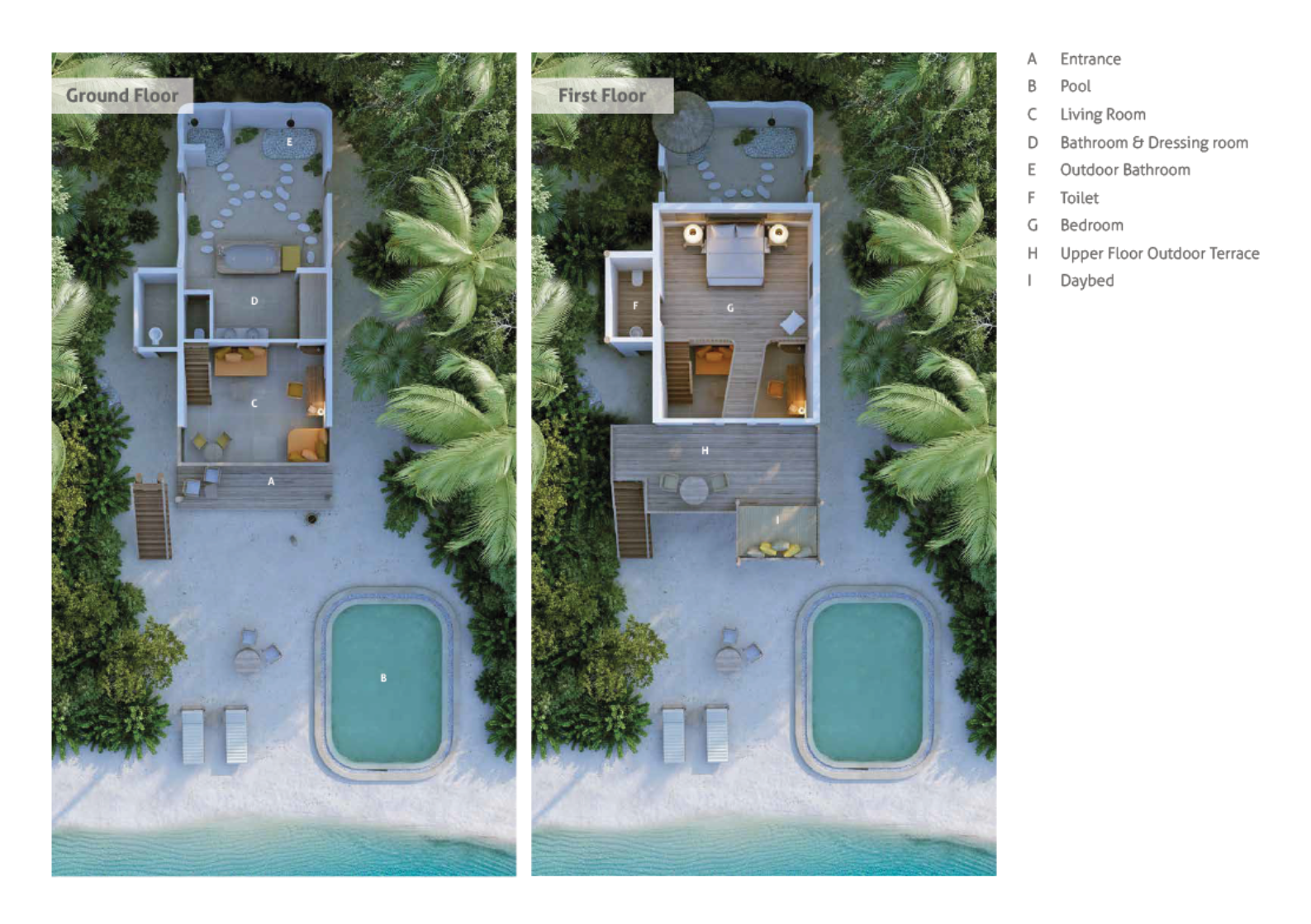 На 2-й вилле: на 1-м этаже: спальня с кроватью king-size, гардеробная, ванная комната с душевой кабиной и с ванной и душем на открытом воздухе, общая терраса с бассейном; на 2-м этаже: спальня с кроватью king-size; гардеробная; ванная комната с ванной и душевой кабиной; терраса, соединяющая двухэтажные виллы, с водной горкой, которая спускается в бассейн.