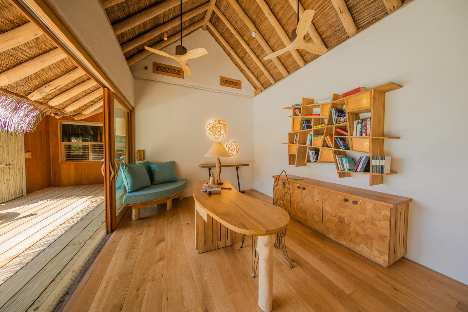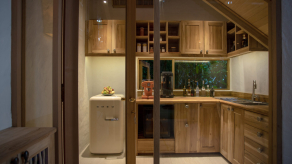 На 1-й вилле: на 1-м этаже: спальня с кроватью king-size, гостиная, ванная комната на открытом воздухе, парная, терраса с бассейном; на 2-м этаже: кухня, обеденная зона, кабинет. Гостиная и спальня разделены дверью.