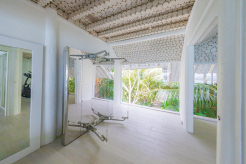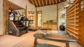 На 1-м этаже: спальня с кроватью king-size или кроватями twin, гостиная, 2 ванные комнаты (одна из них – на открытом воздухе, с ванной и душем), тренажёрный зал, парная (Villa 67), терраса с бассейном. Гостиная и спальня разделены дверью.