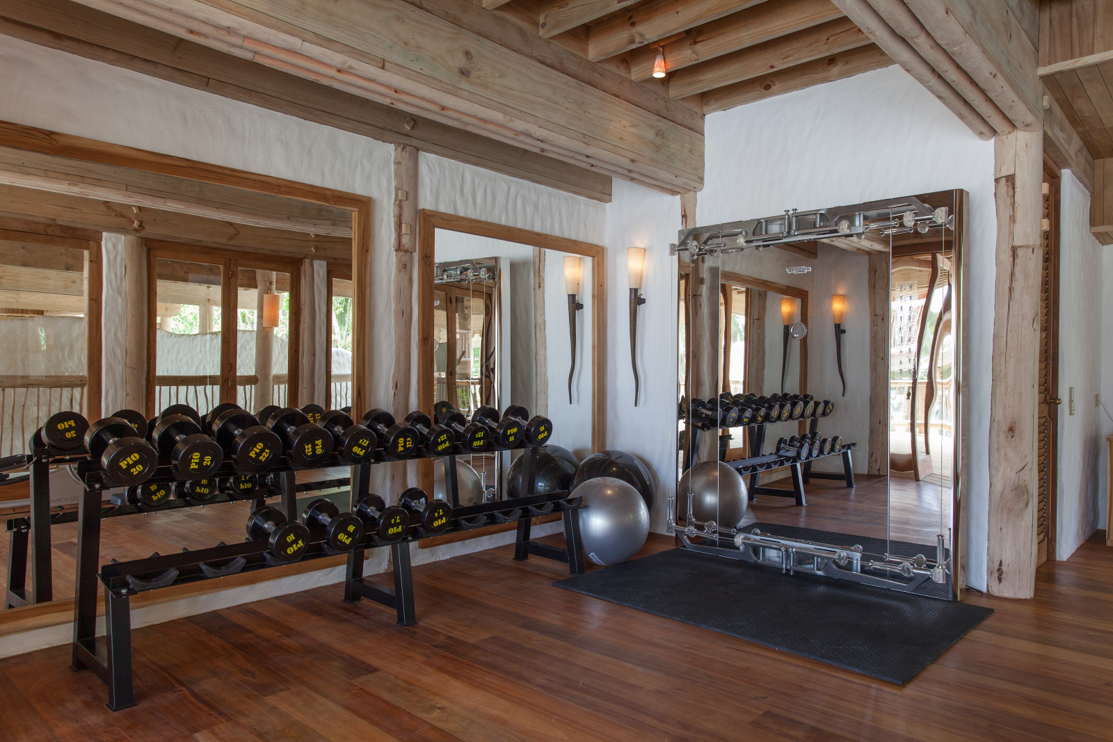 На 1-м этаже: спальня с кроватью king-size, гостиная, столовая с кухней, 2 ванные комнаты (одна из них – с ванной и душем на открытом воздухе), тренажёрный зал, сауна, парная, терраса с бассейном. Гостиная и спальня расположены в разных зданиях.