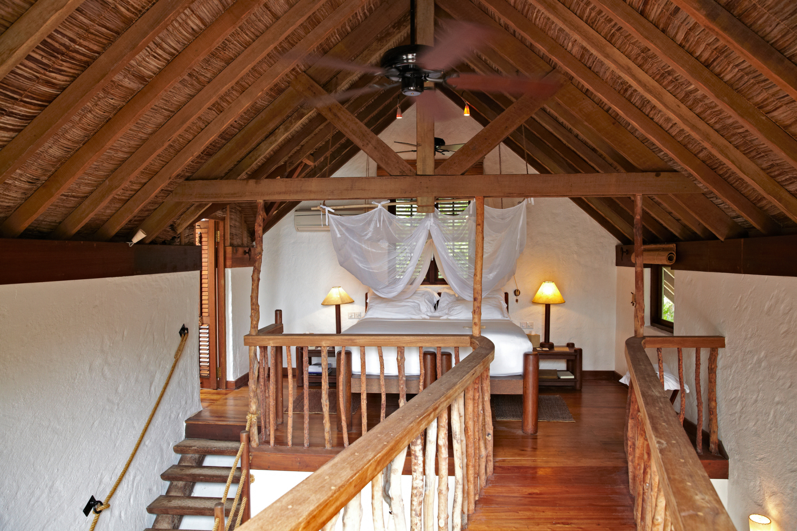 На вилле на сваях, расположенной на уровне 2-го этажа: на 1-м этаже: зона с гамаками над бассейном; на 2-м этаже: спальня, ванная комната с душевой кабиной.