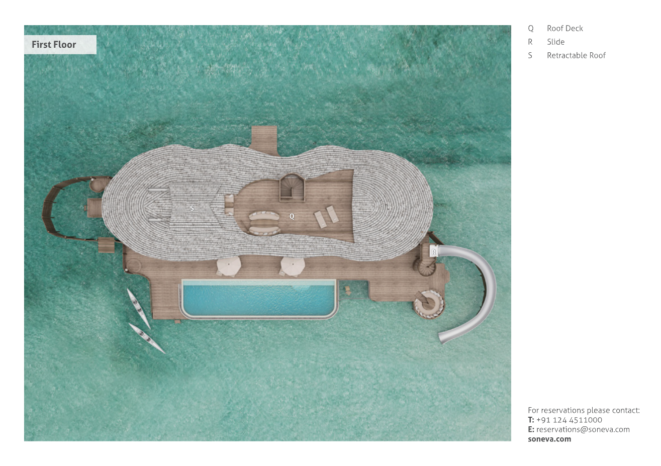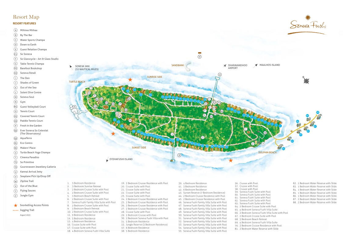 Входит в сеть Soneva Luxury Resorts. Отмечен в The World’s 50 Best Hotels, обладатель спецпремии Art of Hospitality 2025 и титула World’s Best Beach Hotel. Все виллы имеют уникальный дизайн, разработанный Soneva Creative Department. Виллы на воде отличаются раздвижными крышами над спальнями: нажав одну кнопку, можно оказаться под звёздным небом. У каждой – водная горка, которая ведёт в лагуну. Виллы на пляже выделяются большой территорией с ванными комнатами в саду. У всех – частный бассейн, у большинства – терраса на втором этаже. Площадь резиденций достигает 3 тыс. кв. м. У каждой виллы – свой батлер.