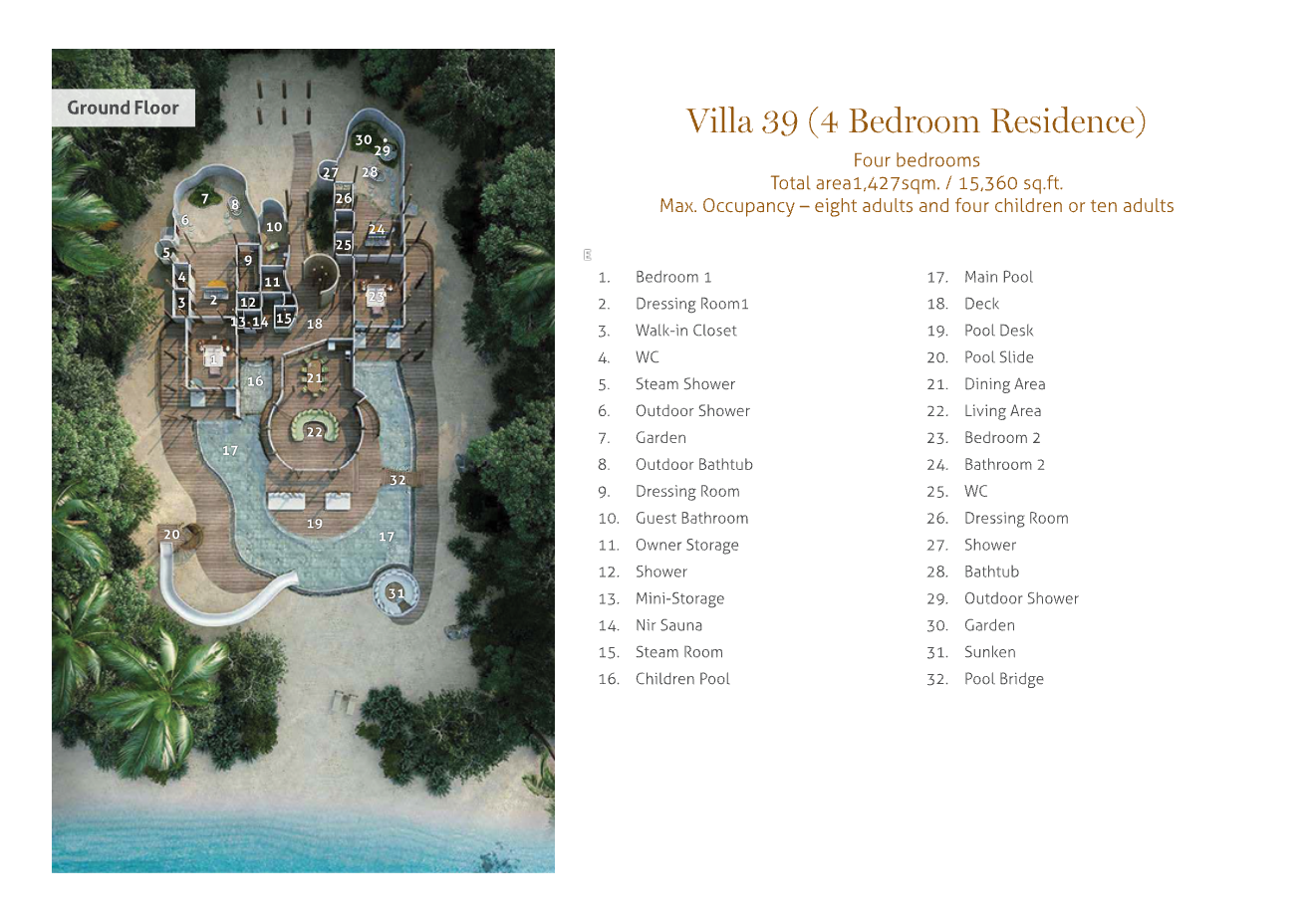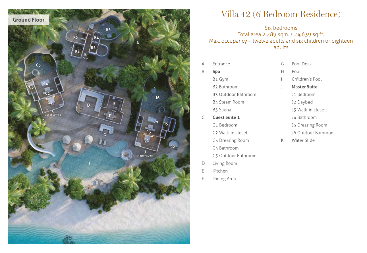 На 1-м этаже: 2 спальни (каждая с кроватью king-size), гостиная, кухня, 2 гардеробные, 2 ванные комнаты (каждая с ванной и душем на открытом воздухе), комната для спа-процедур с сауной, парной и душем с функцией парной, терраса с бассейном.