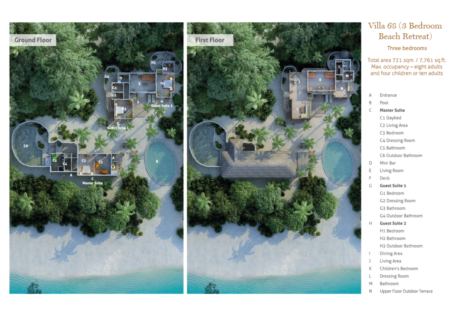 На 1-м этаже: спальня с кроватью king-size или кроватями twin, гостиная, 2 ванные комнаты (одна – на открытом воздухе, с ванной и душем, другая – с душем), парная, терраса с бассейном. Гостиная и спальня разделены дверью.