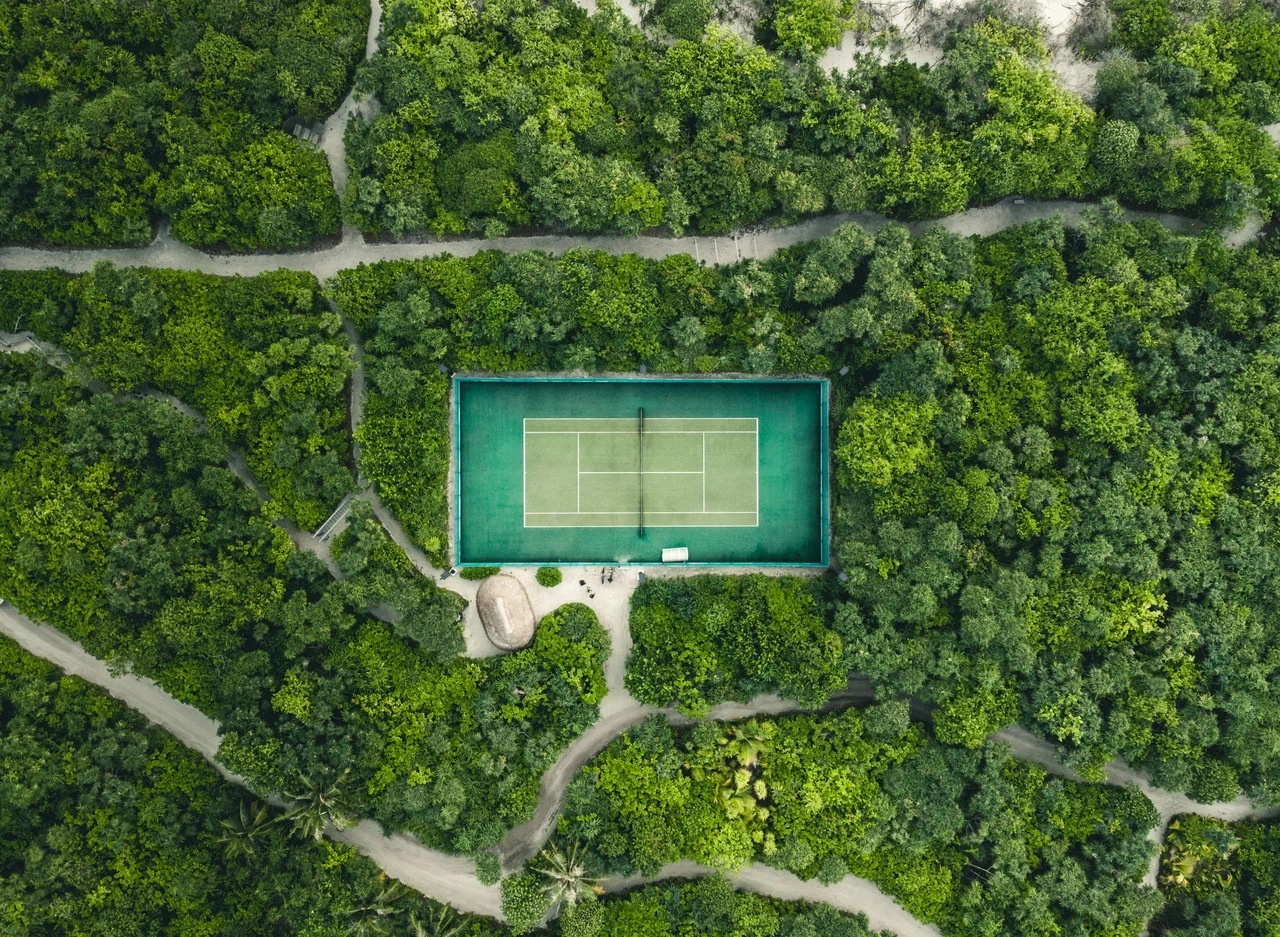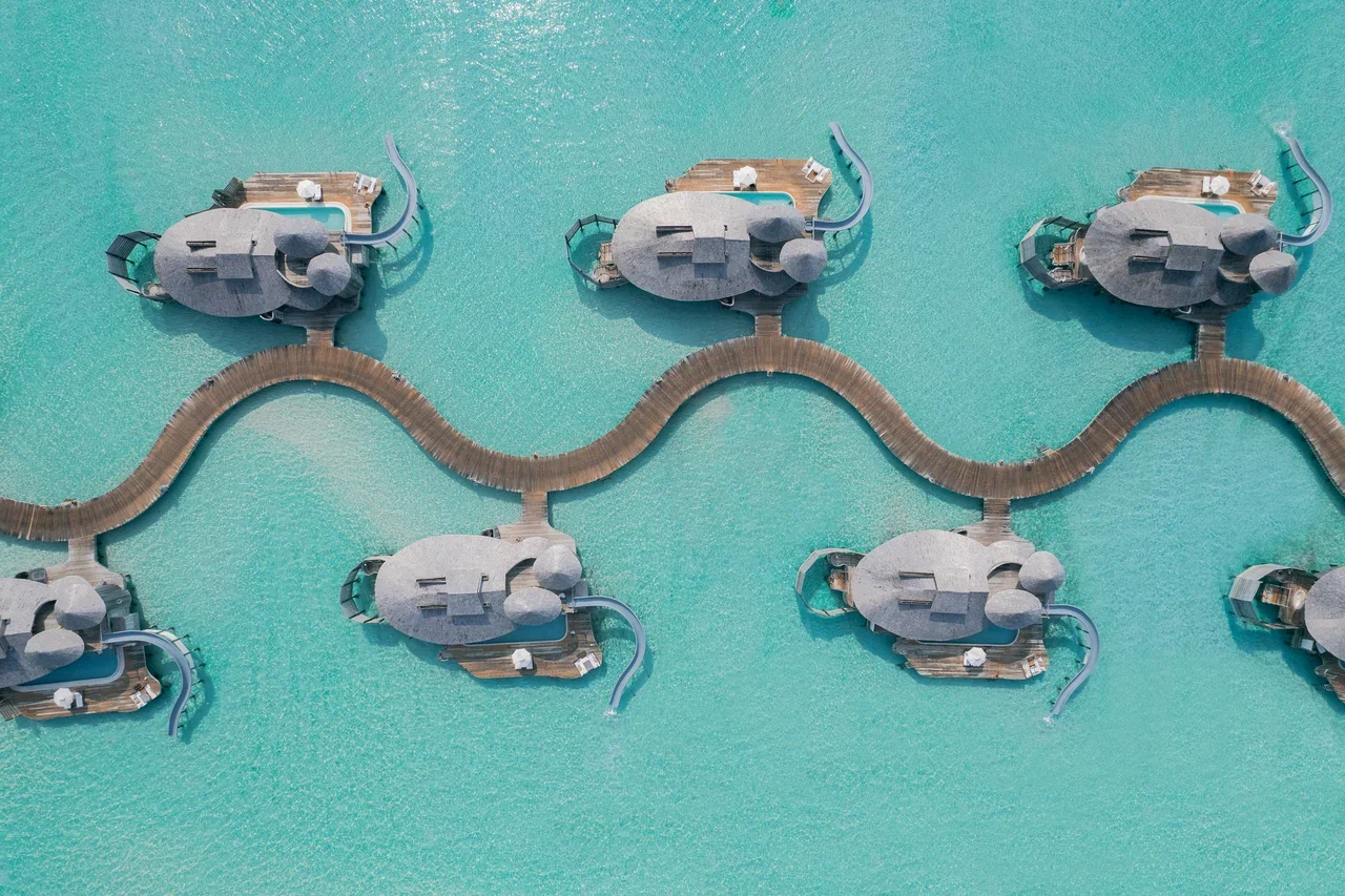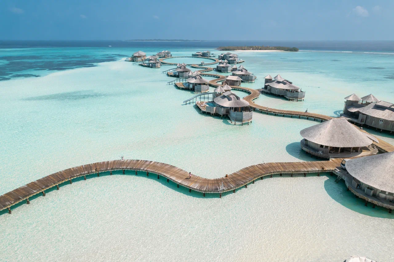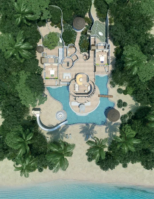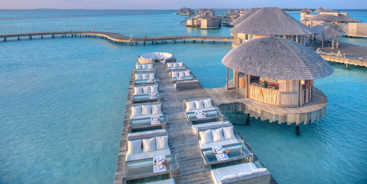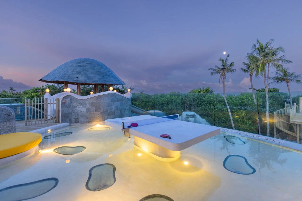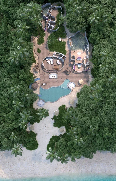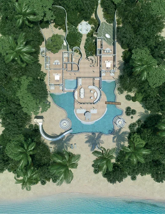 61 вилла, 18 ресторанов, бар, винный погреб, спа-центр, тренажёрный зал, павильон для занятий йогой, центр водных видов спорта, дайвинг-центр, теннисный корт, корт для падел-тенниса, прокат велосипедов, детский клуб, обсерватория на сваях, кинотеатр под открытым небом, библиотека, арт-студия (мастер-классы).