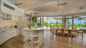 На 1-м этаже: спальня с кроватью king-size, гостиная, кухня, 2 ванные комнаты (одна – с душевой кабиной, другая – с 2 раковинами), гостевой туалет, ванна и душ на открытом воздухе, терраса с бассейном, прямой спуск к воде. Гостиная и спальня разделены дверью.
