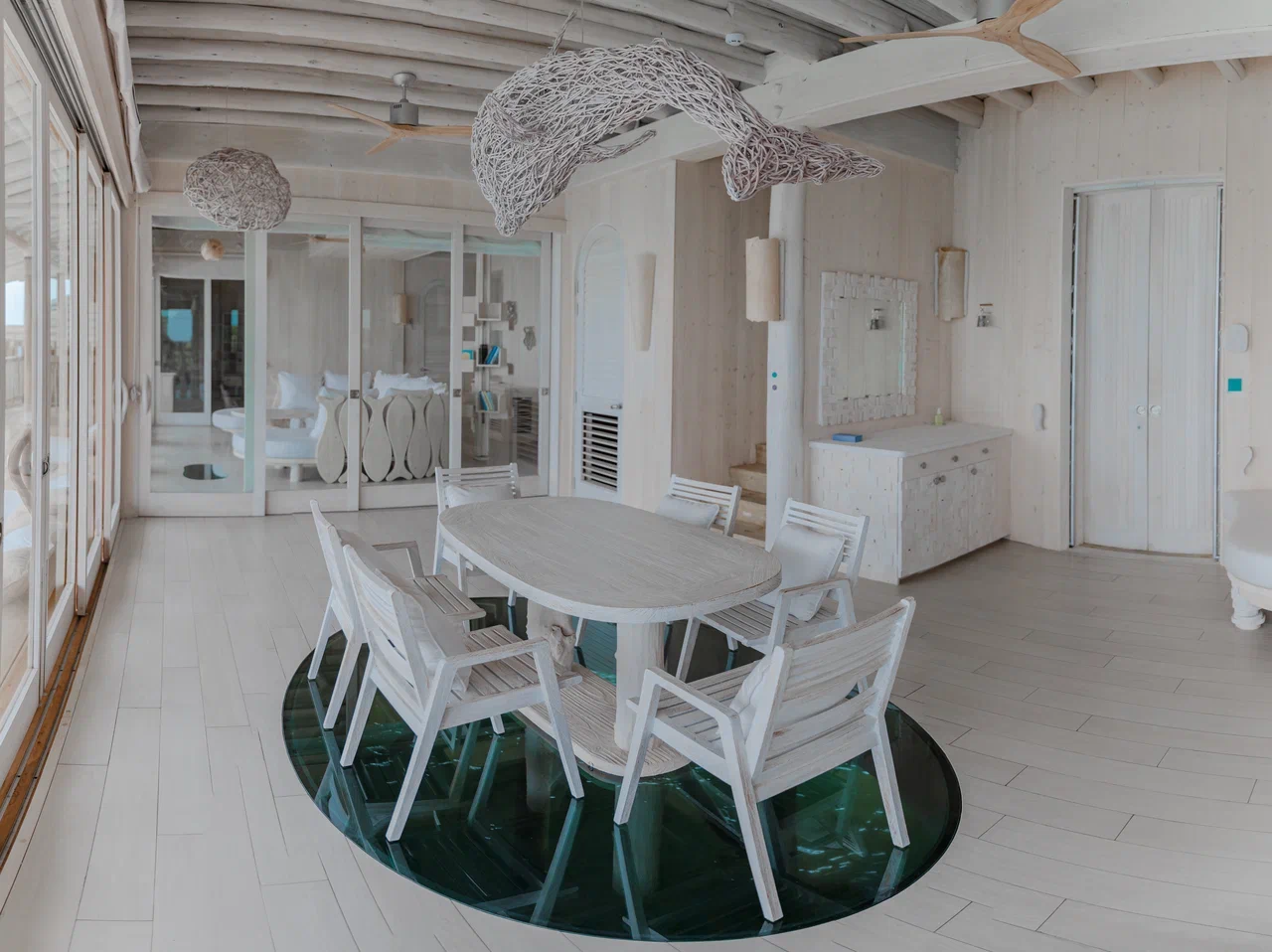 На 1-м этаже: 2 спальни с кроватями king-size, детская спальня, гостиная с обеденной зоной, кабинет, 2 ванные комнаты, гостевой туалет, 2 ванны на открытом воздухе, терраса с бассейном и прямым спуском к воде. Гостиная и спальни разделены дверями.