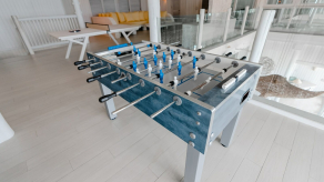 На 2-м этаже: 2 спальни с кроватями king-size, детская спальня, гостиная с настольным теннисом и настольным футболом, тренажёрный зал, 2 ванные комнаты, водная горка. Гостиная и спальни разделены дверями.