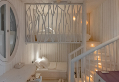 На 2-м этаже: спальня с кроватью king-size, ванная комната с душевой кабиной, терраса с водной горкой, которая спускается в бассейн.
