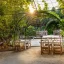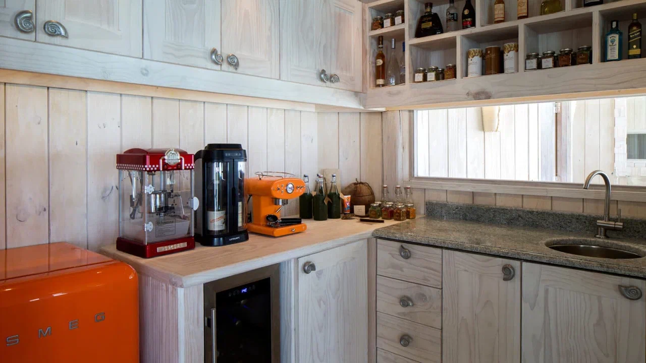 На 1-м этаже: спальня с кроватью king-size, гостиная, кухня, ванная комната, гостевой туалет, ванна и душ на открытом воздухе, терраса с бассейном и обеденной зоной на открытом воздухе. Гостиная и спальня разделены дверью.