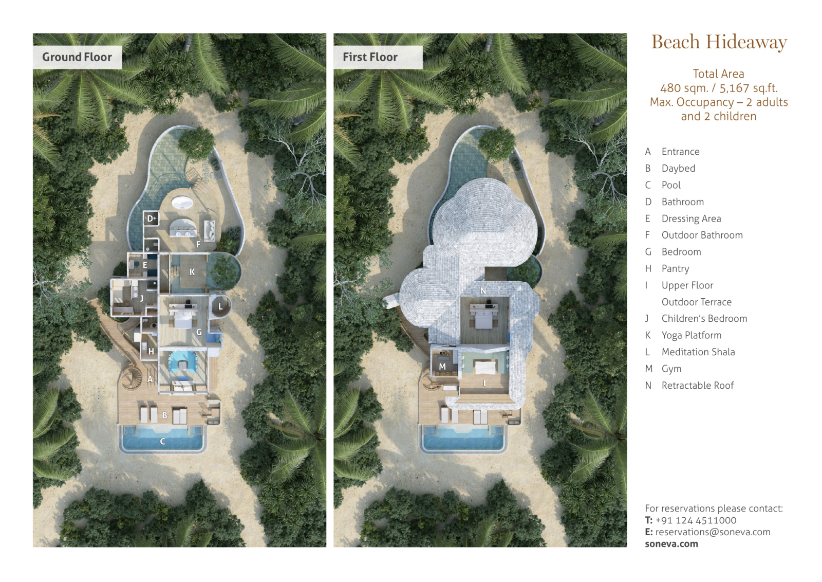 На 1-м этаже: спальня с кроватью king-size, детская спальня, гостиная зона, мини-кухня, комната для медитаций, платформа для занятий йогой, ванная комната с ванной на открытом воздухе, терраса с бассейном.