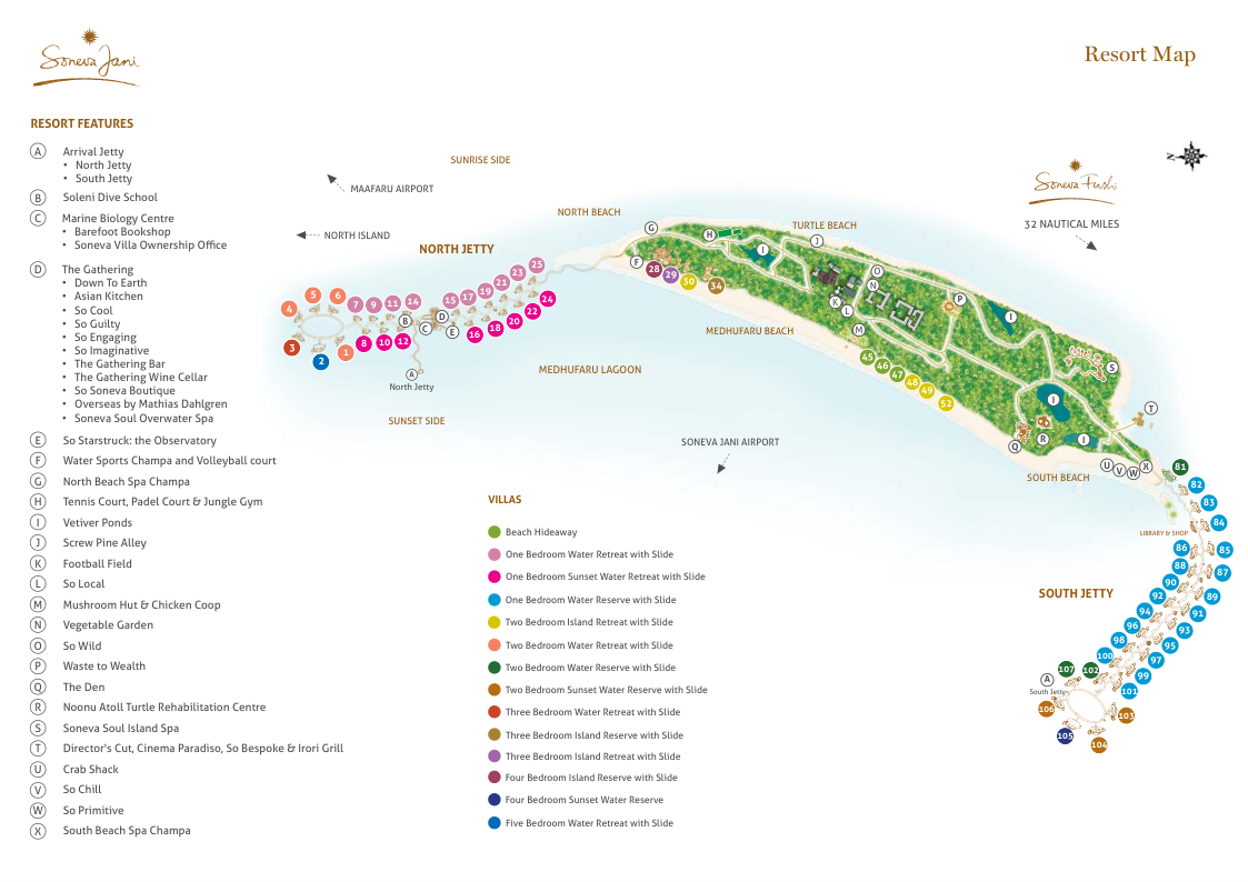 Входит в сеть Soneva Luxury Resorts. Forbes Travel Guide отметил Soneva Jani пятью звёздами. Грандиозные виллы площадью от 400 до 1,8 тыс. кв. м входят в топ самых просторных на Мальдивах. Большинство расположены на воде и оборудованы горкой, ведущей в лагуну. Несколько вилл стоят на острове, уединённо, в окружении тропической зелени. Некоторые резиденции имеют раздвижную крышу в спальне – можно наблюдать за звёздным небом, лёжа в кровати. У каждой виллы – свой батлер и велосипеды.