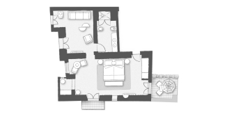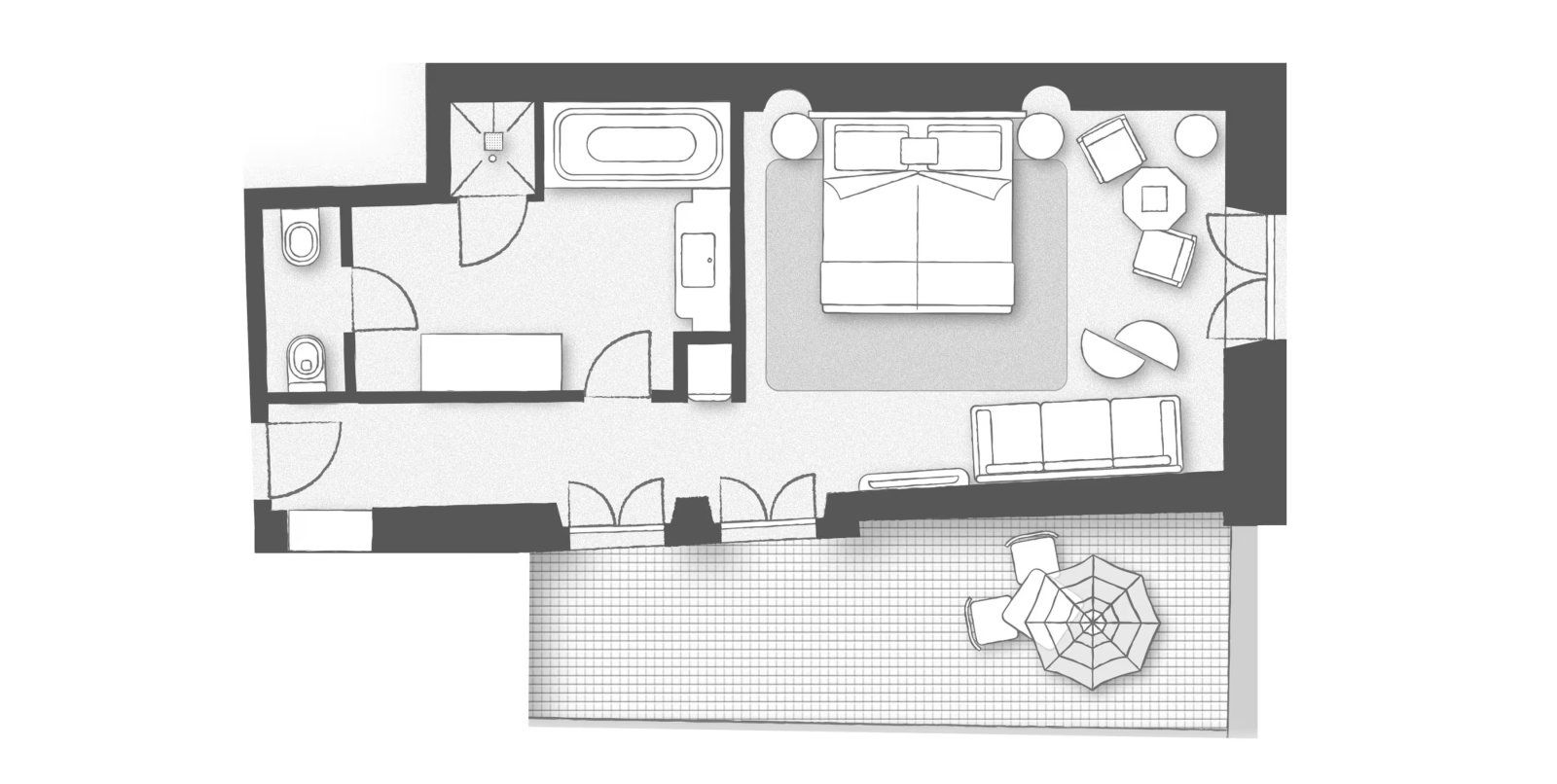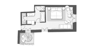 Спальня с кроватью king-size или кроватями twin, гостиная, ванная комната с ванной и/или душевой кабиной, балкон или терраса. Гостиная и спальня разделены дверью.