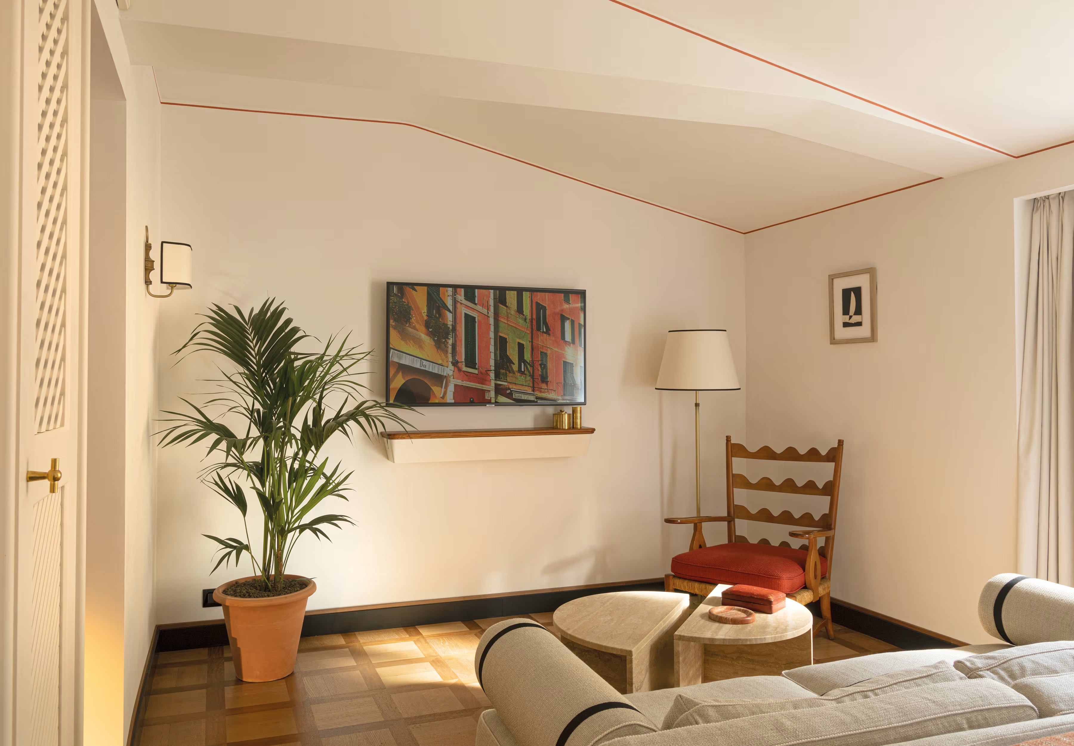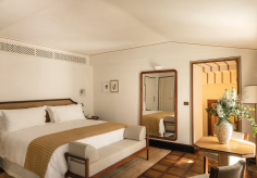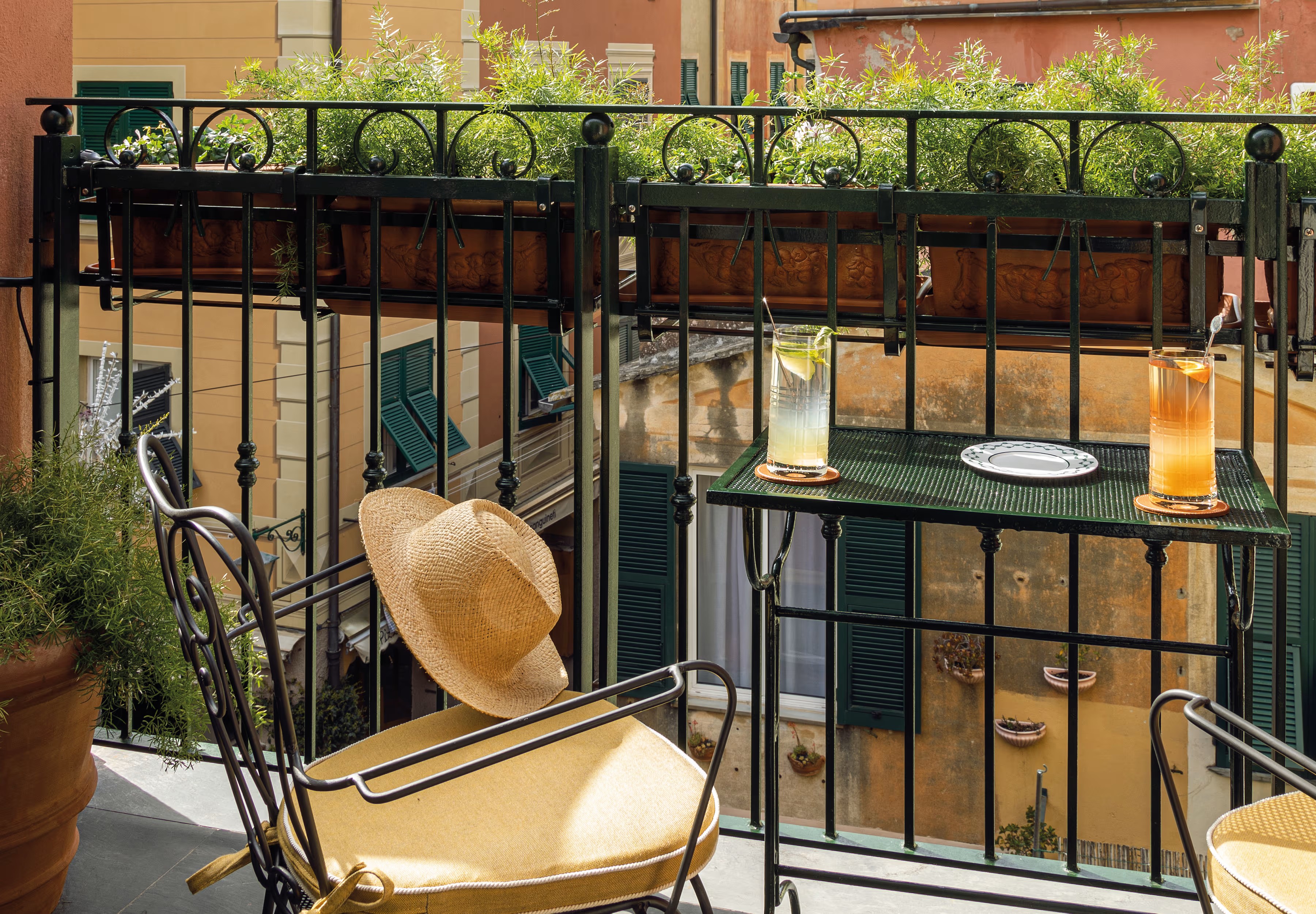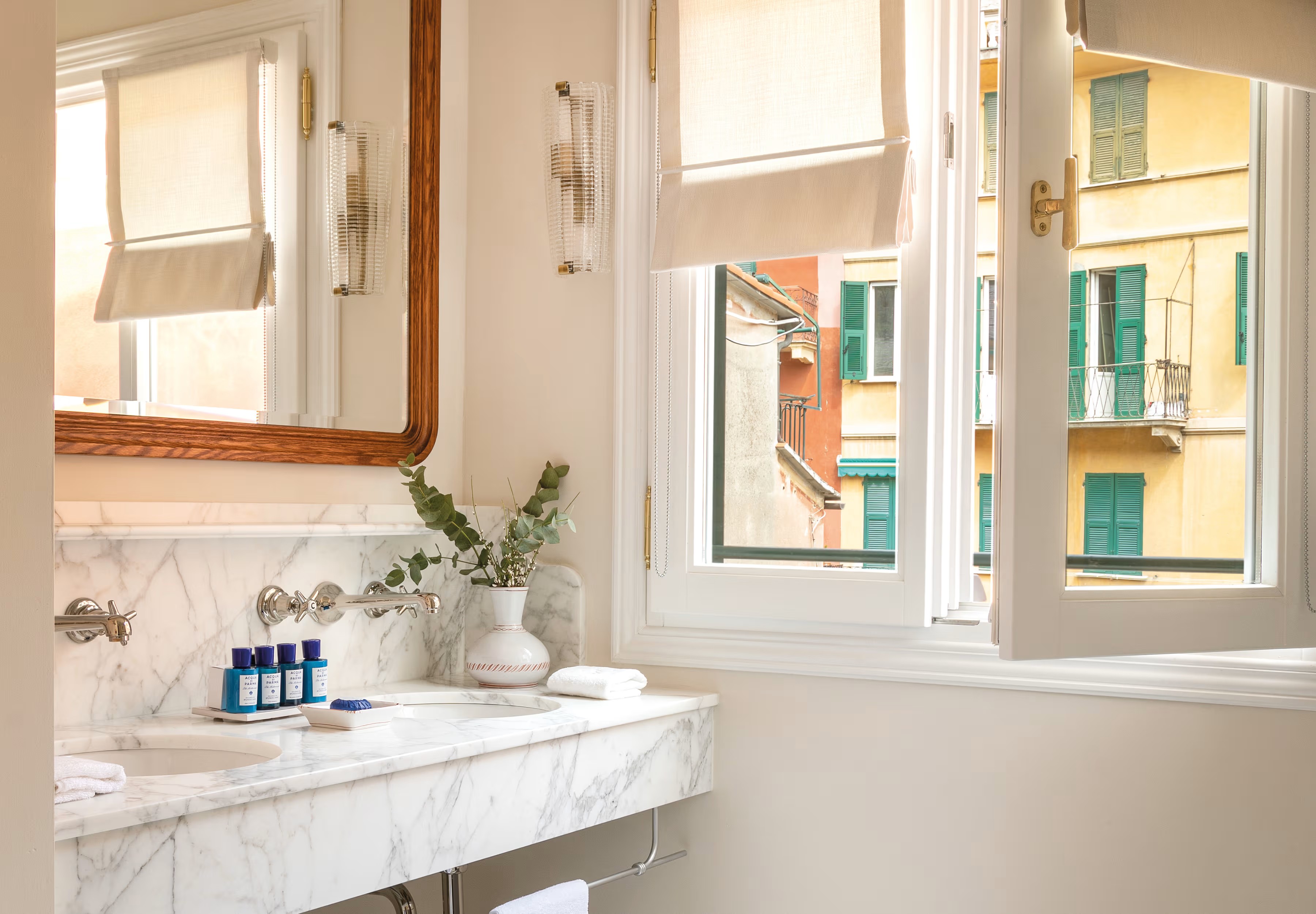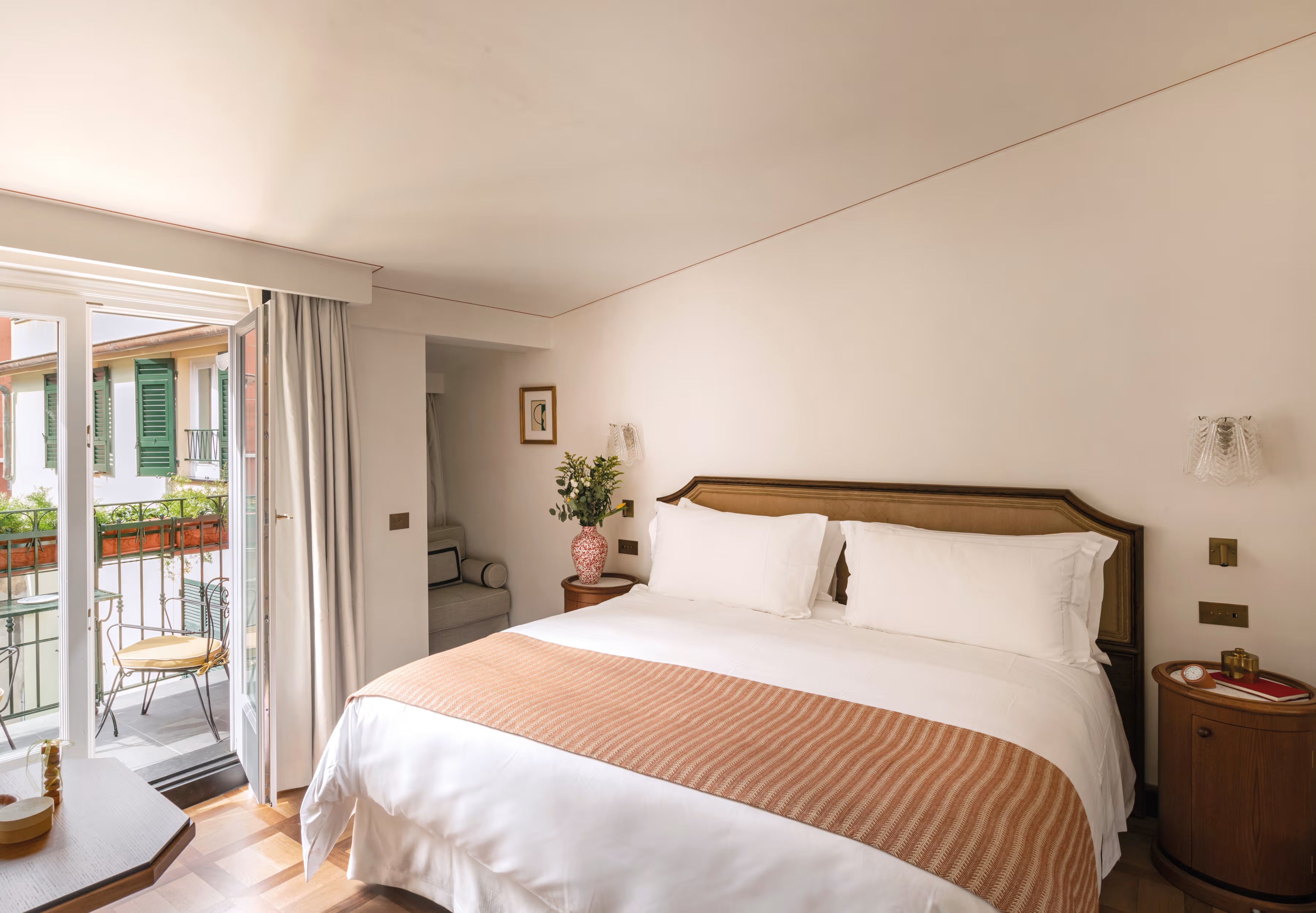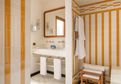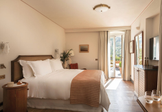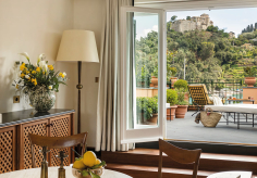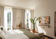 В лобби гостей встречают традиционная терракотовая плитка, повторяющая рисунок волн, детали из каррарского мрамора и местного камня Лаванья, винтажная мебель от прославленных дизайнеров Джо Понти и Паоло Буффы, а также произведения искусства итальянских мастеров. Интерьеры номеров выдержаны в палитре янтаря и шалфея; здесь соседствуют тщательно отобранный антиквариат, светильники из муранского стекла и текстиль от знаменитых домов Loro Piana и Rubelli. Один из номеров носит имя Авы Гарднер – голливудской дивы, останавливавшейся в этом здании в 1954 году, во время съёмок фильма «Босоногая графиня». Ванные комнаты отделаны каррарским мрамором, а изысканные туалетные принадлежности предоставлены парфюмерным брендом Acqua di Parma. Многие номера располагают частными балконами и террасами, откуда открывается захватывающий вид либо на сверкающую гладь гавани, либо на разноцветные фасады домов на склоне берега.