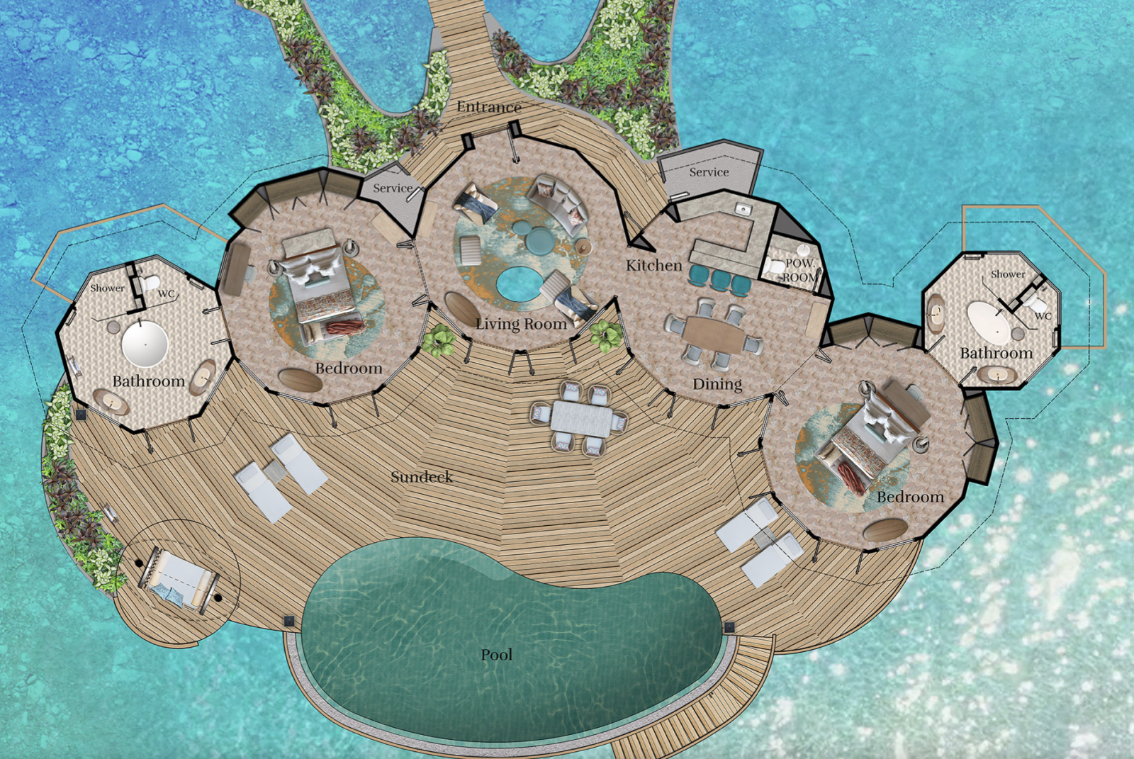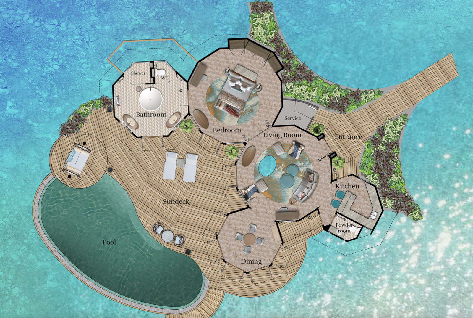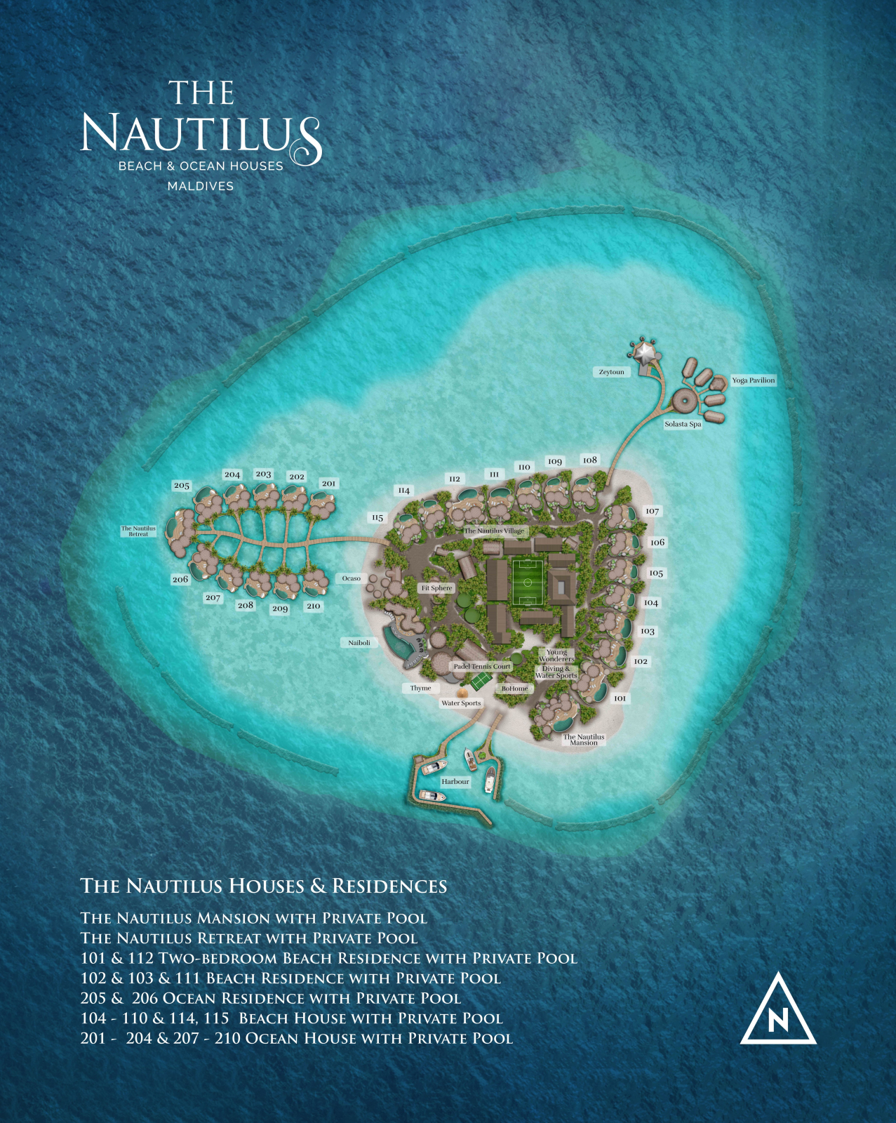 Входит в ассоциацию Relais & Châteaux. На острове всего 26 вилл – на пляже и на воде. Каждая – с собственным бассейном и персональным батлером. Виллы оформлены в стиле бохо-шик, с яркими акцентами и с использованием натуральных материалов. Самая просторная – The Nautilus Mansion with Private Pool площадью 922 кв. м. Она находится в уединённой части пляжа. Мебель для виллы изготовлена по индивидуальным эскизам из отобранных вручную материалов. Пространства украшены произведениями искусства и декором, который отражает богемный шик острова.