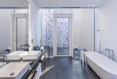 2 спальни (одна – с кроватью king-size, другая – с кроватями twin), гостиная с биокамином и обеденной зоной, кухня, 2 ванные комнаты (каждая с ванной и душевой кабиной), гостевой туалет, терраса. Гостиная и спальни разделены дверями.