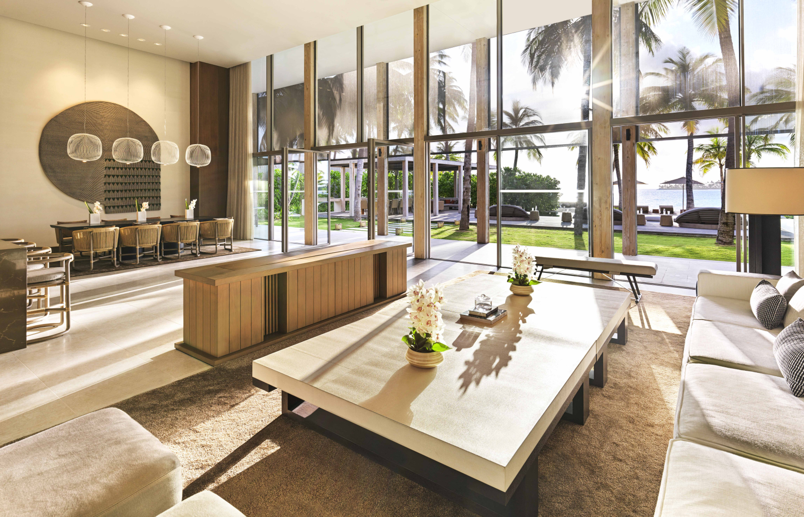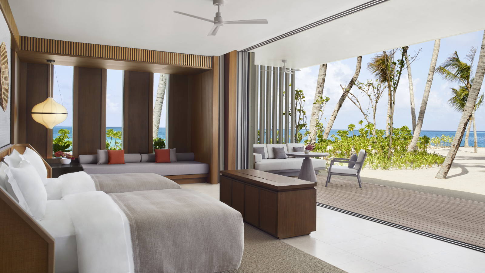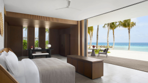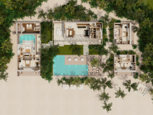 Вилла на берегу. 2 спальни (одна – с кроватью king-size, другая – с 2 кроватями queen-size), гостиная с обеденной зоной, 2 ванные комнаты, терраса с инфинити-бассейном. Гостиная и спальни разделены дверями.