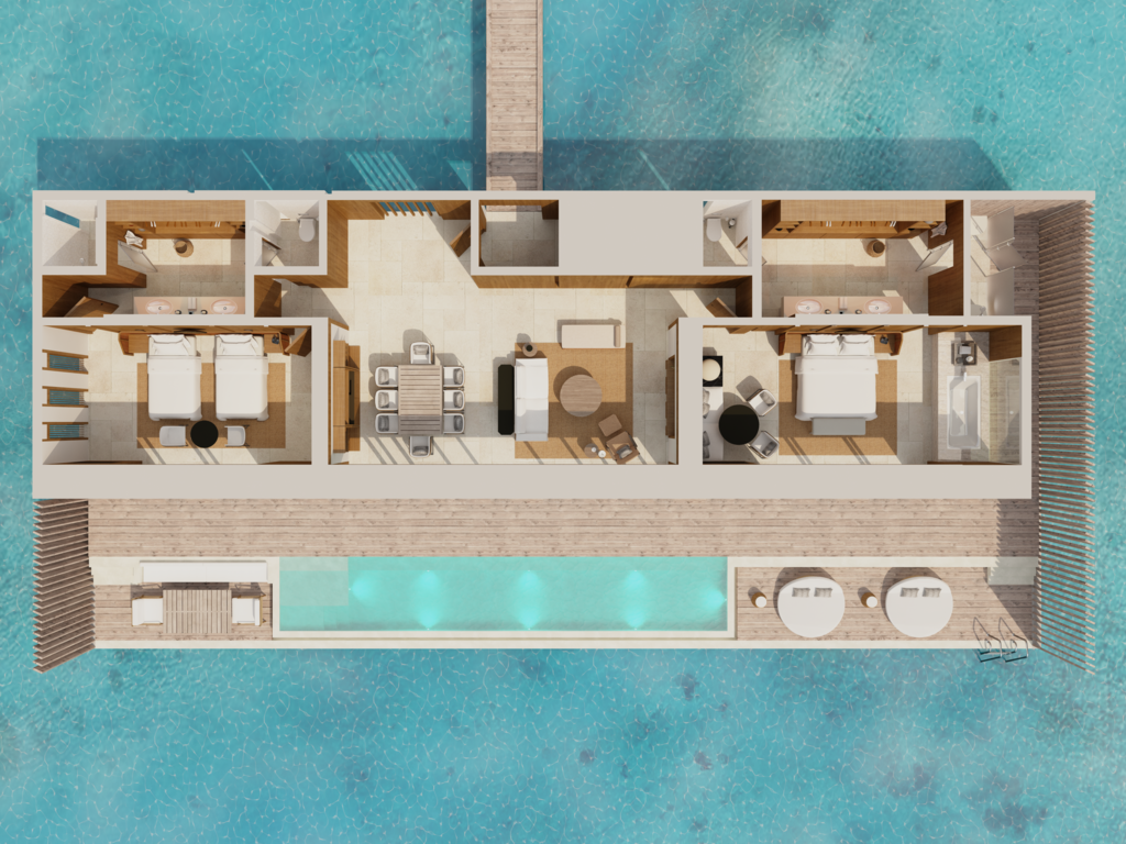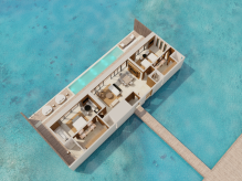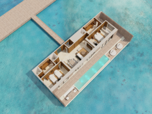 Вилла на воде. 2 спальни (одна – с кроватью king-size, другая – с 2 кроватями queen-size), гостиная с обеденной зоной, 2 ванные комнаты, терраса с инфинити-бассейном и прямым спуском к воде. Гостиная и спальни разделены дверями.