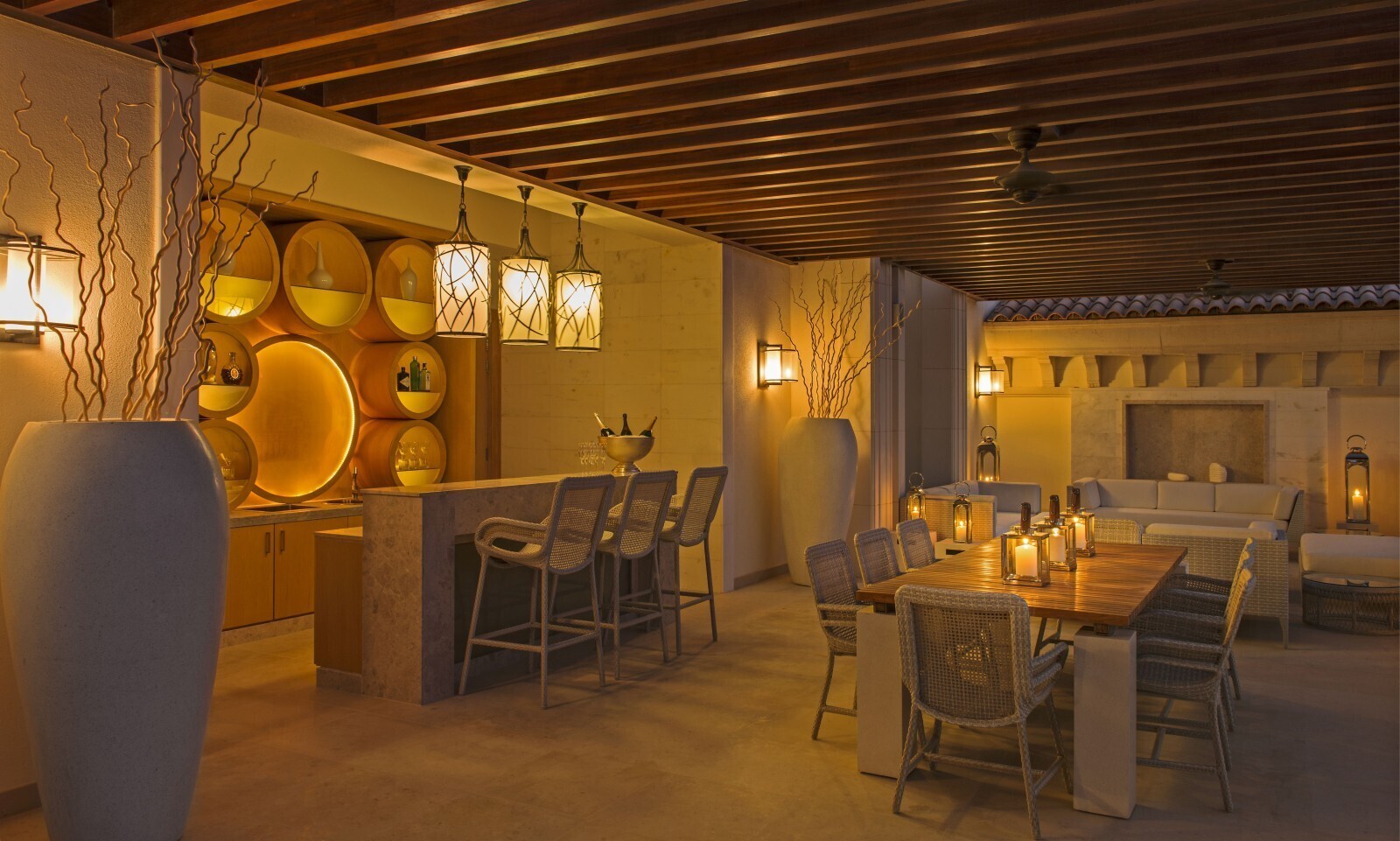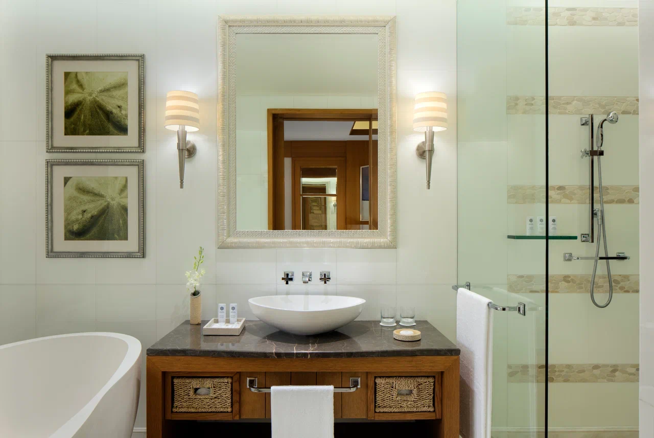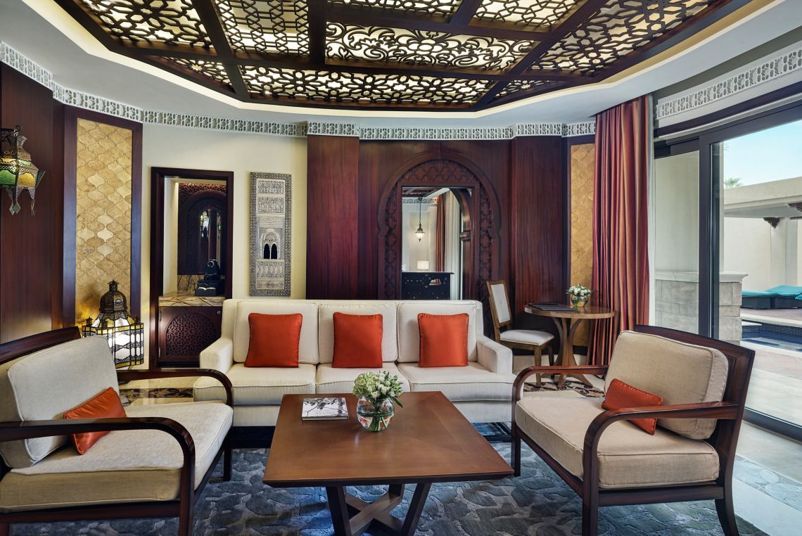 2 спальни (одна – с кроватью king-size, другая – с кроватями twin), гостиная, гардеробная, 2 ванные комнаты (каждая с ванной и душевой кабиной), гостевой туалет, терраса, патио. Гостиная и спальни разделены дверями.