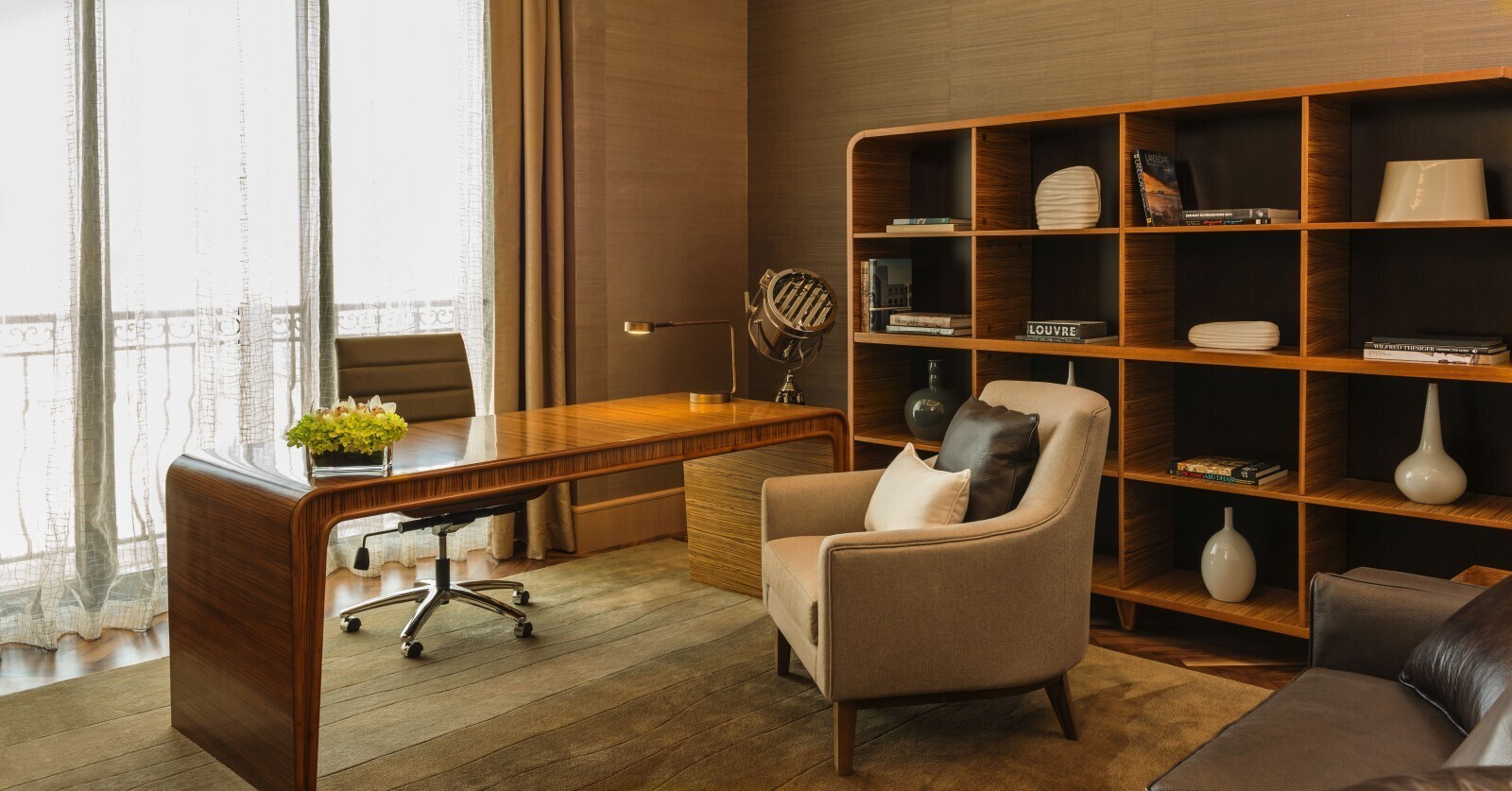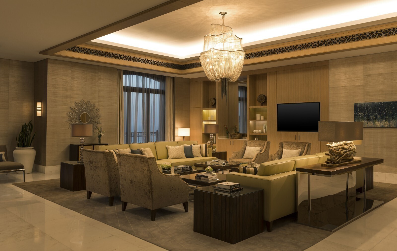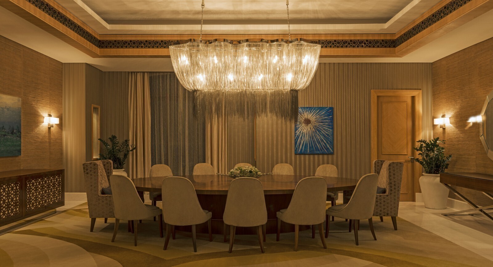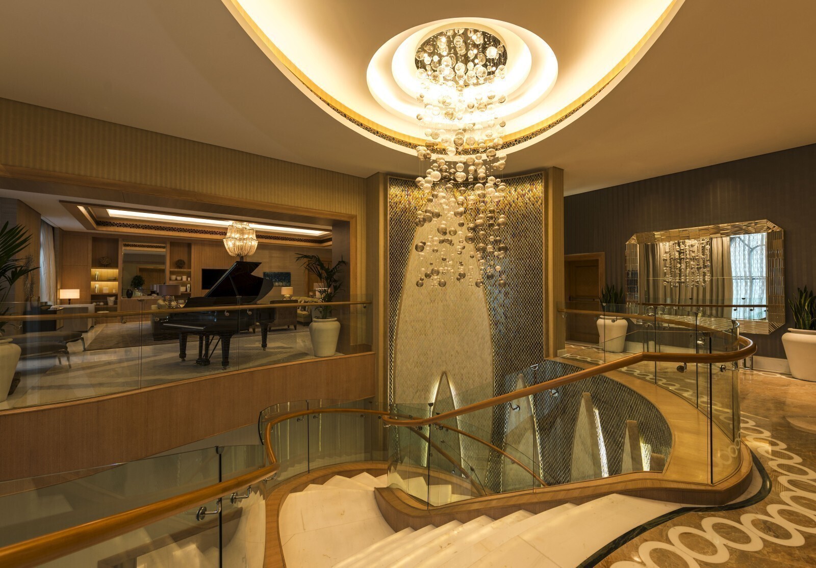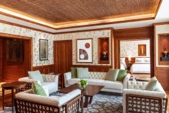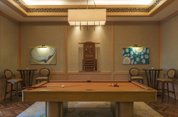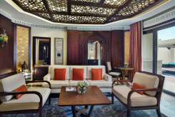 Двухуровневый номер. Спальня с кроватью king-size, гостиная, столовая с роялем Steinway и столом на 12 персон, кабинет, гардеробная, кинозал, игровая комната c бильярдным столом, комната для спа-процедур, сауна, 3 ванные комнаты (каждая с ванной и душевой кабиной), балкон, терраса с бассейном и обеденной зоной под навесом. Гостиная и спальня разделены дверью.