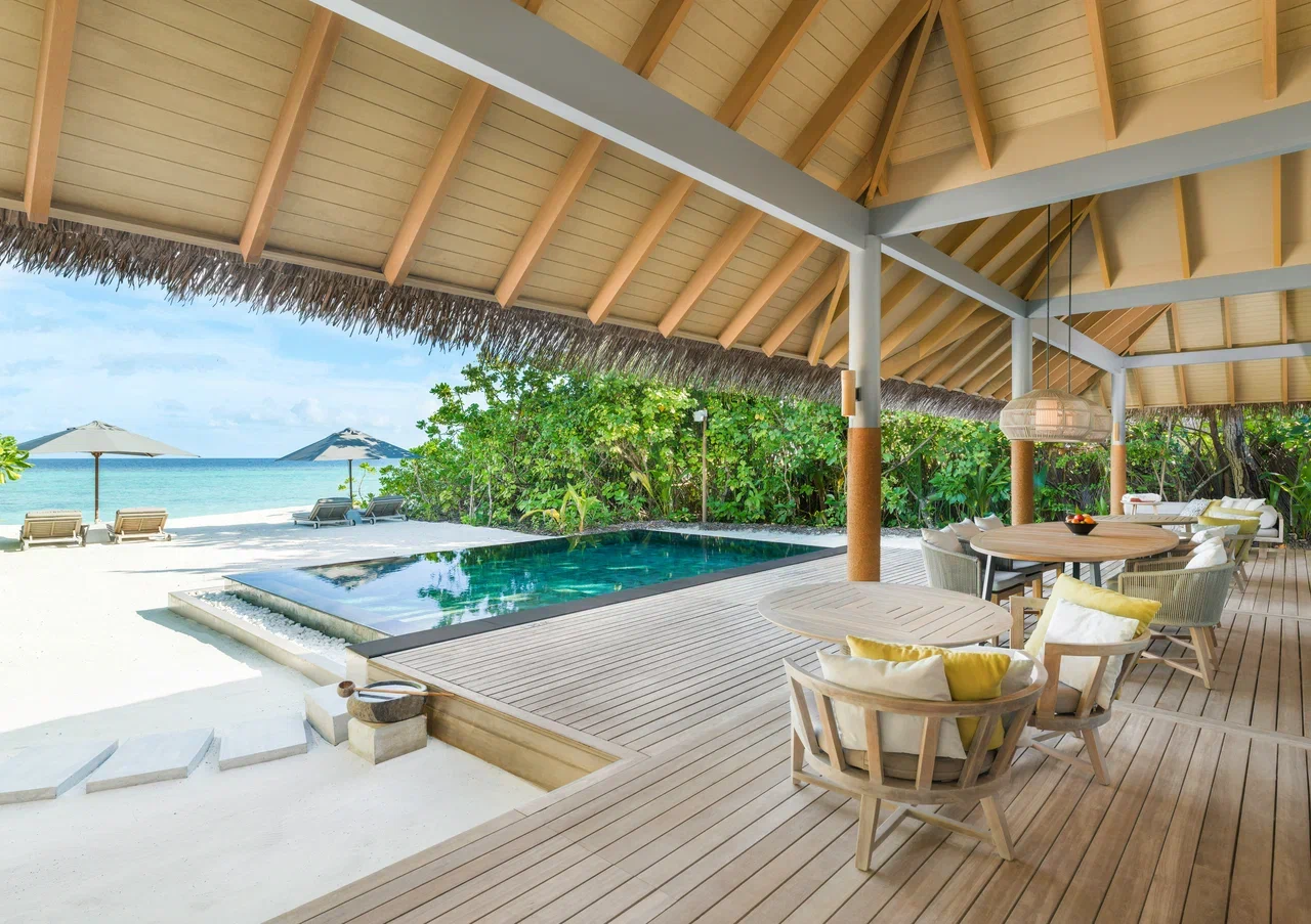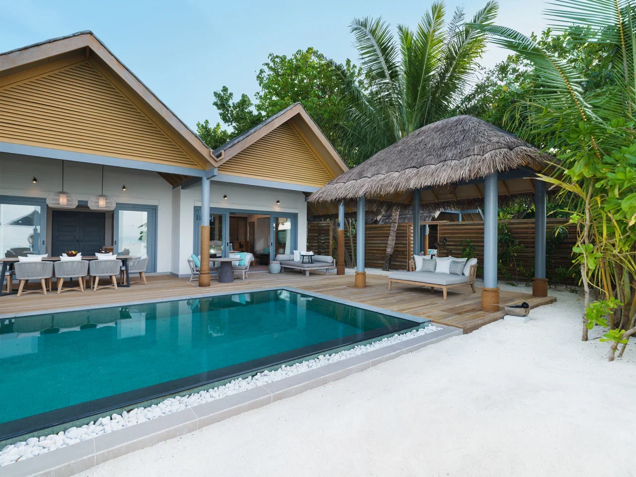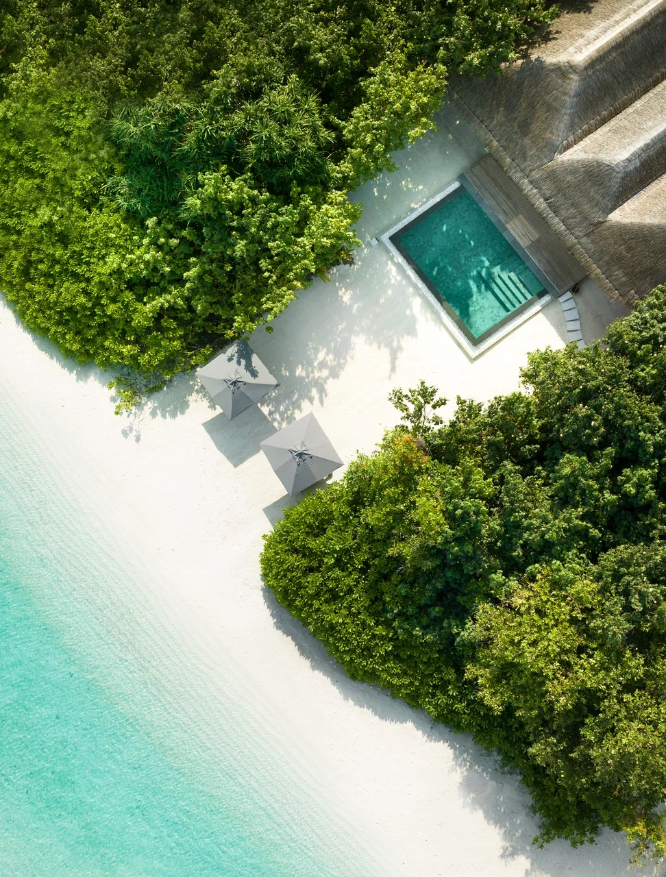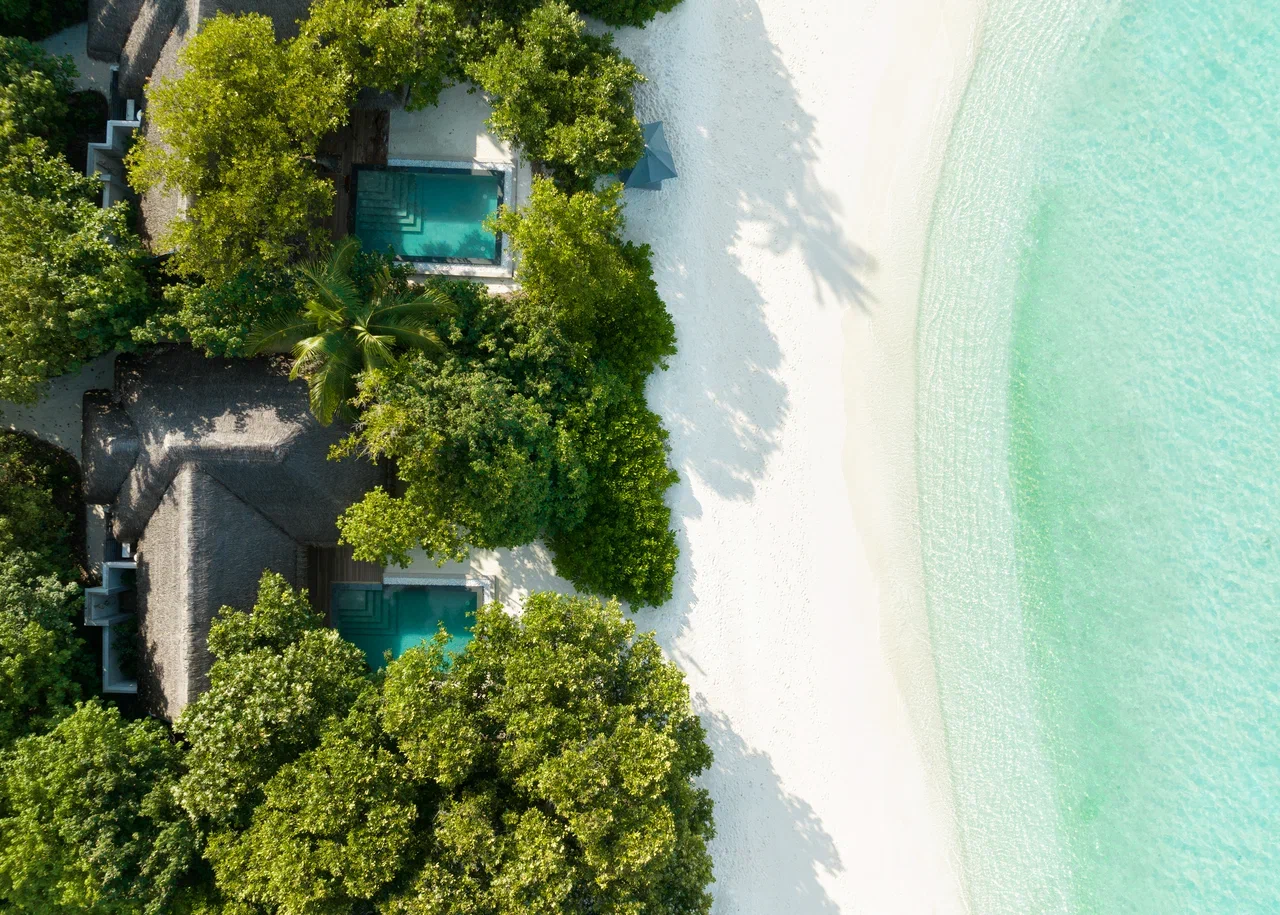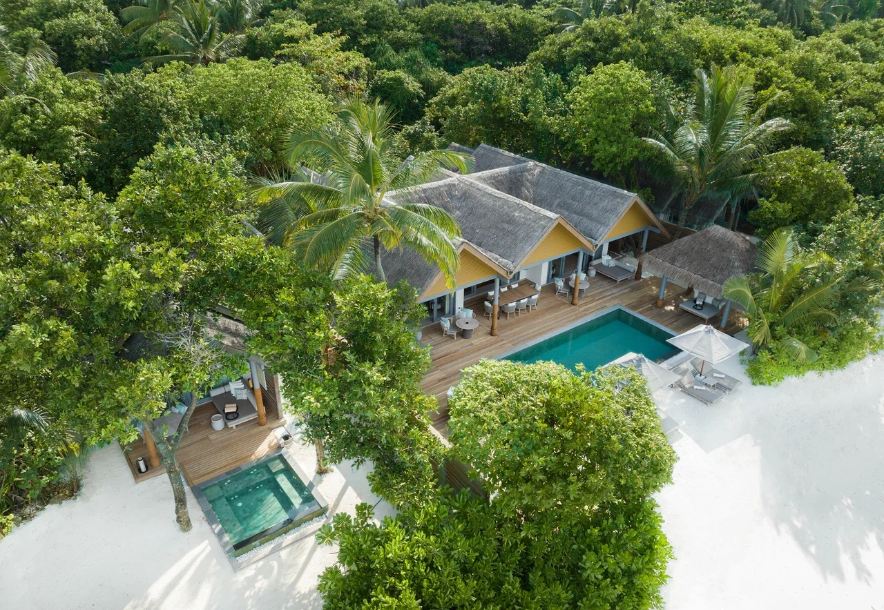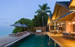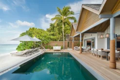 3 виллы на берегу: одна – категории Two Bedroom Beach Pool Residence (улучшенная), две – категории Beach Villa With Plunge Pool. 4 спальни, 4 ванные комнаты, 3 бассейна.