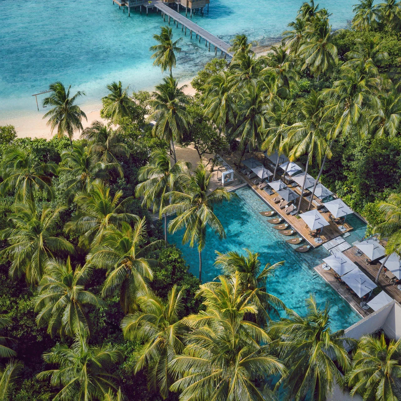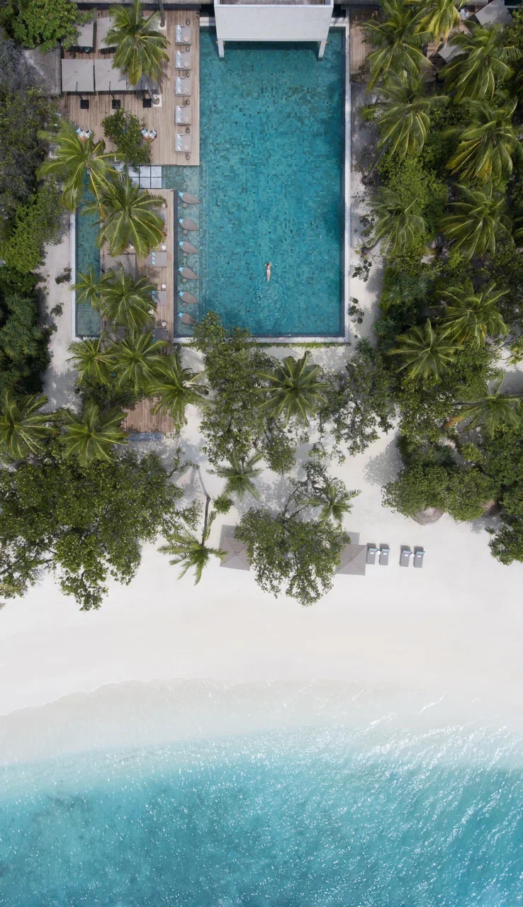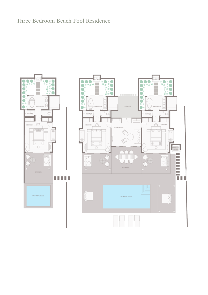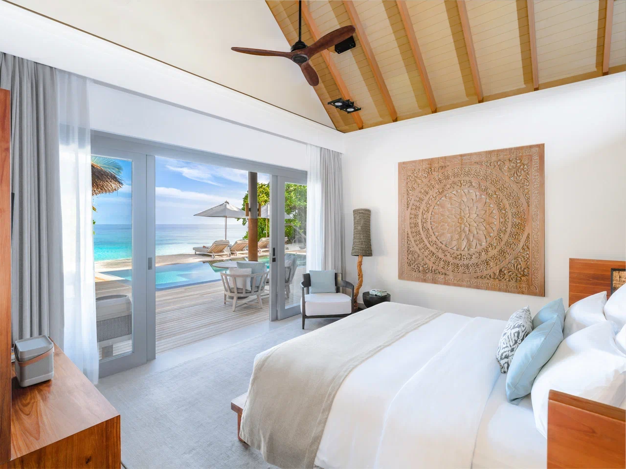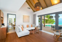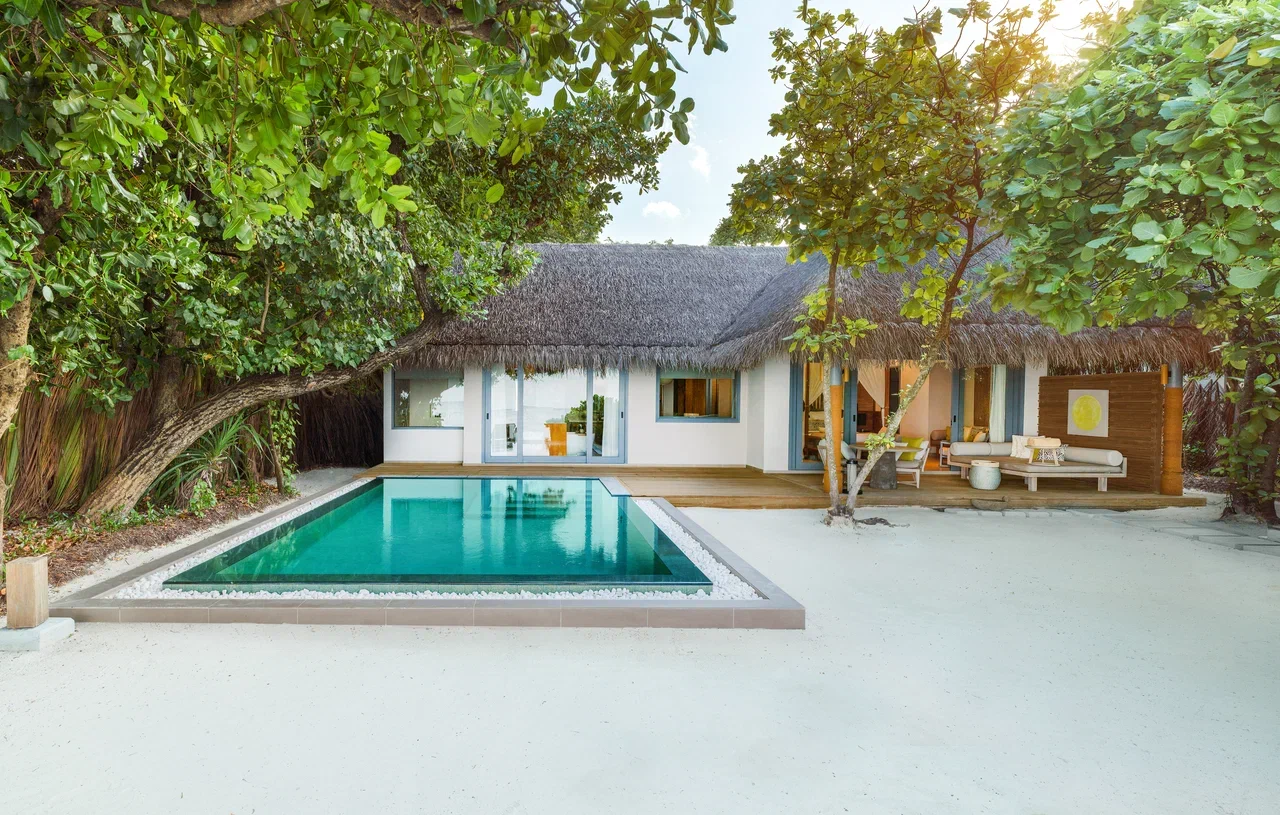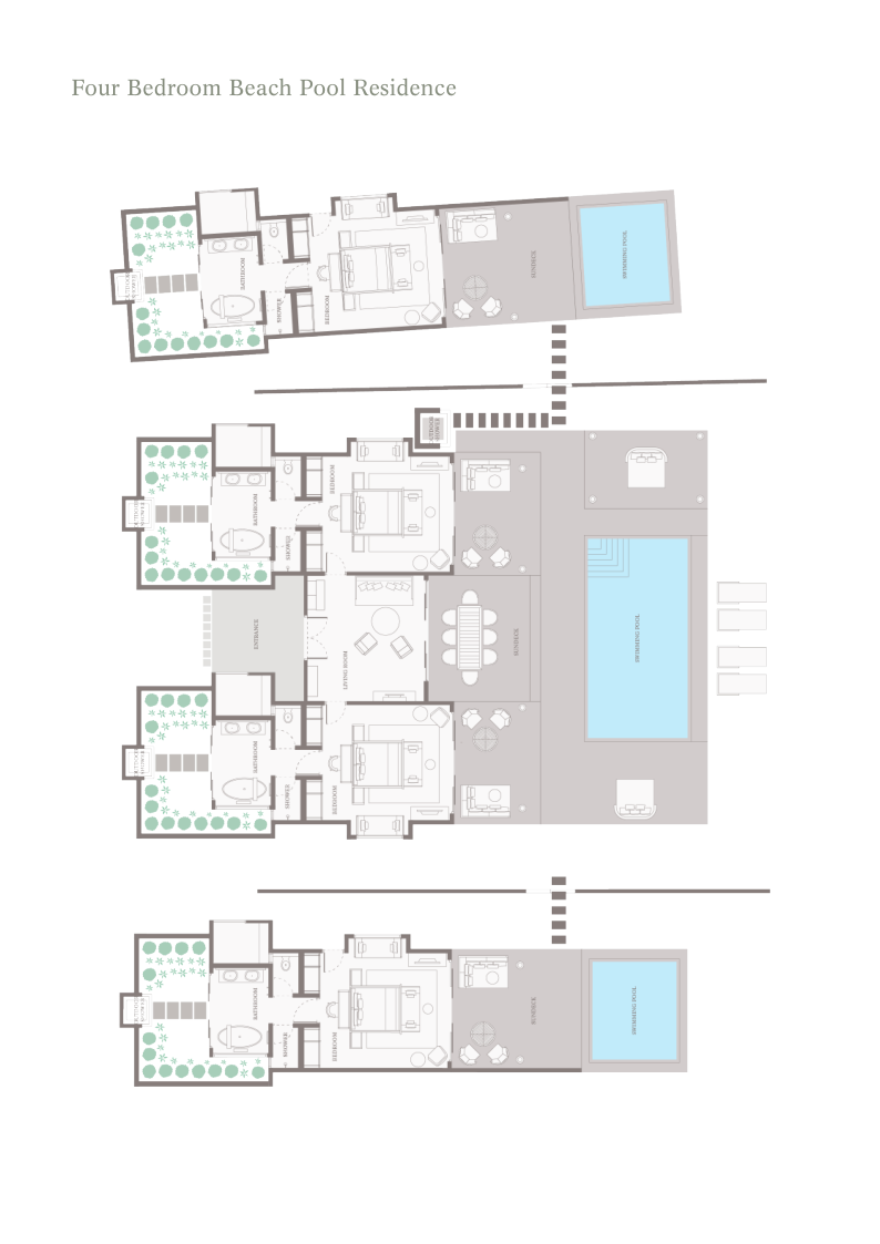 3 виллы на берегу: одна – категории Two Bedroom Beach Pool Residence (улучшенная), две – категории Beach Villa With Plunge Pool. 4 спальни, 4 ванные комнаты, 3 бассейна.
