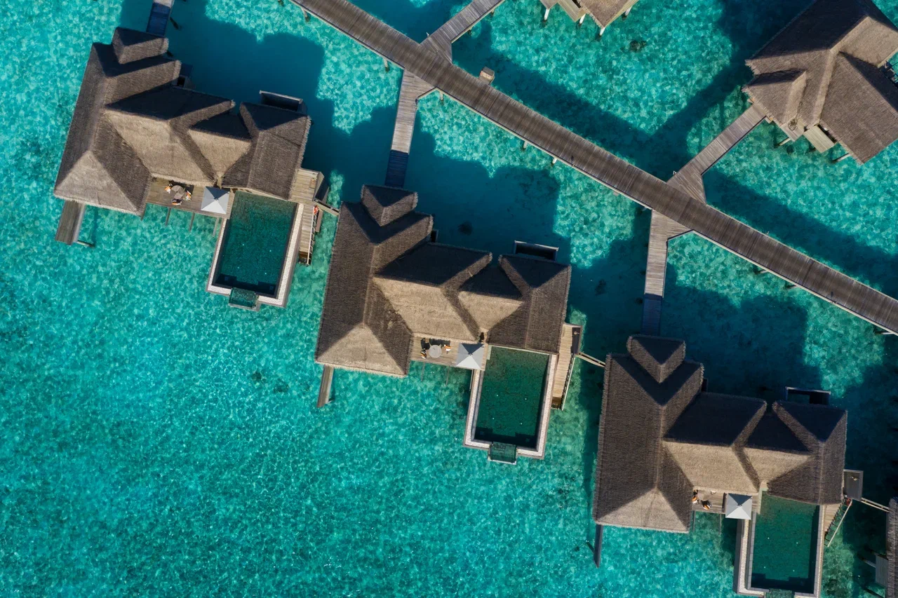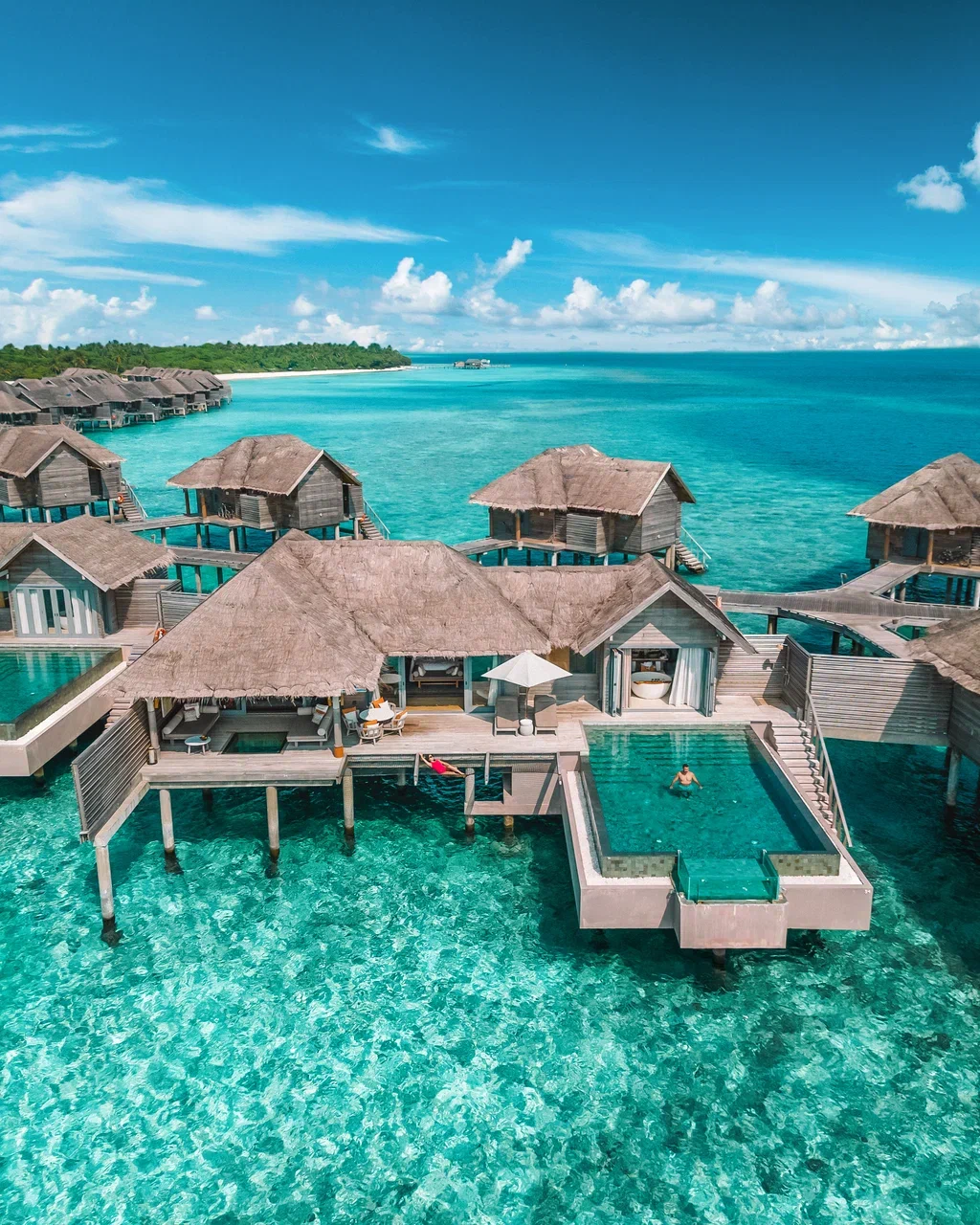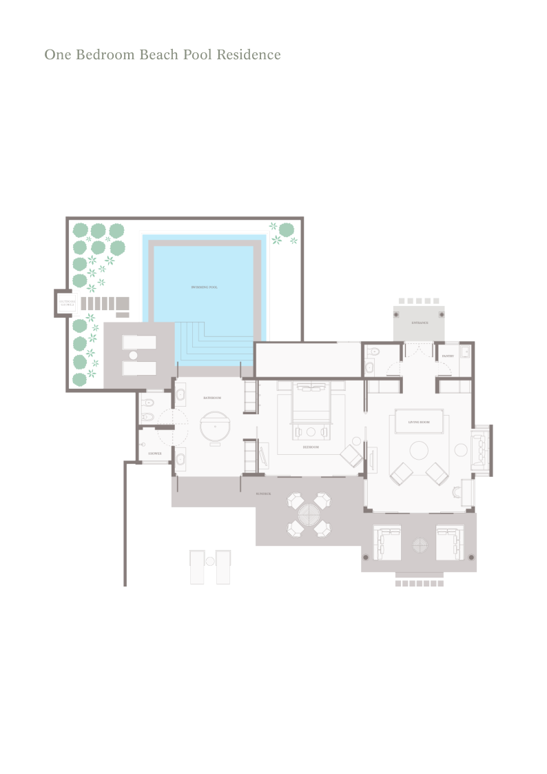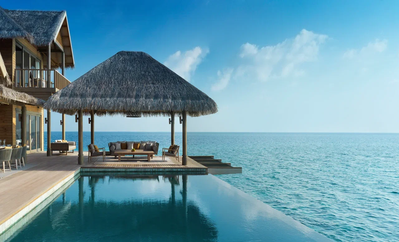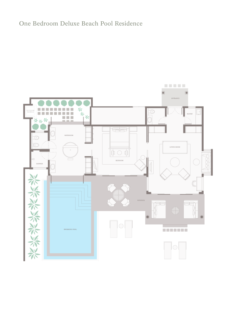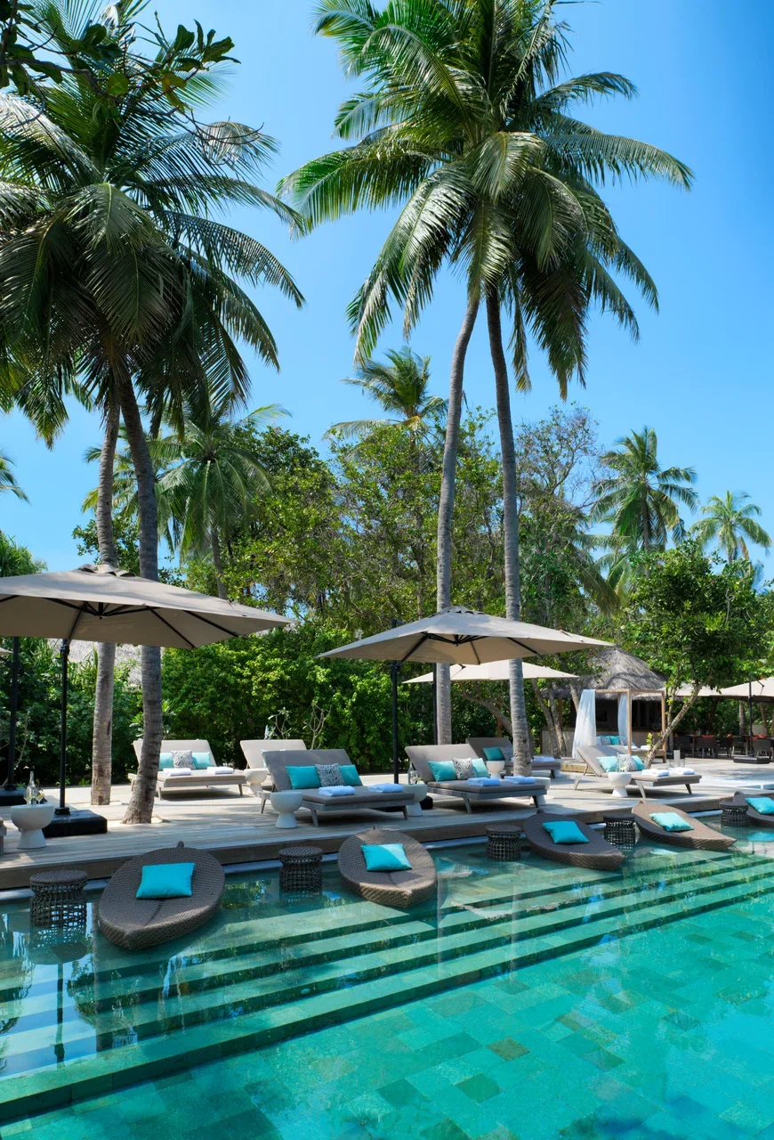 3 виллы на берегу: одна – категории Two Bedroom Beach Pool Residence (улучшенная), две – категории Beach Villa With Plunge Pool. 4 спальни, 4 ванные комнаты, 3 бассейна.