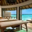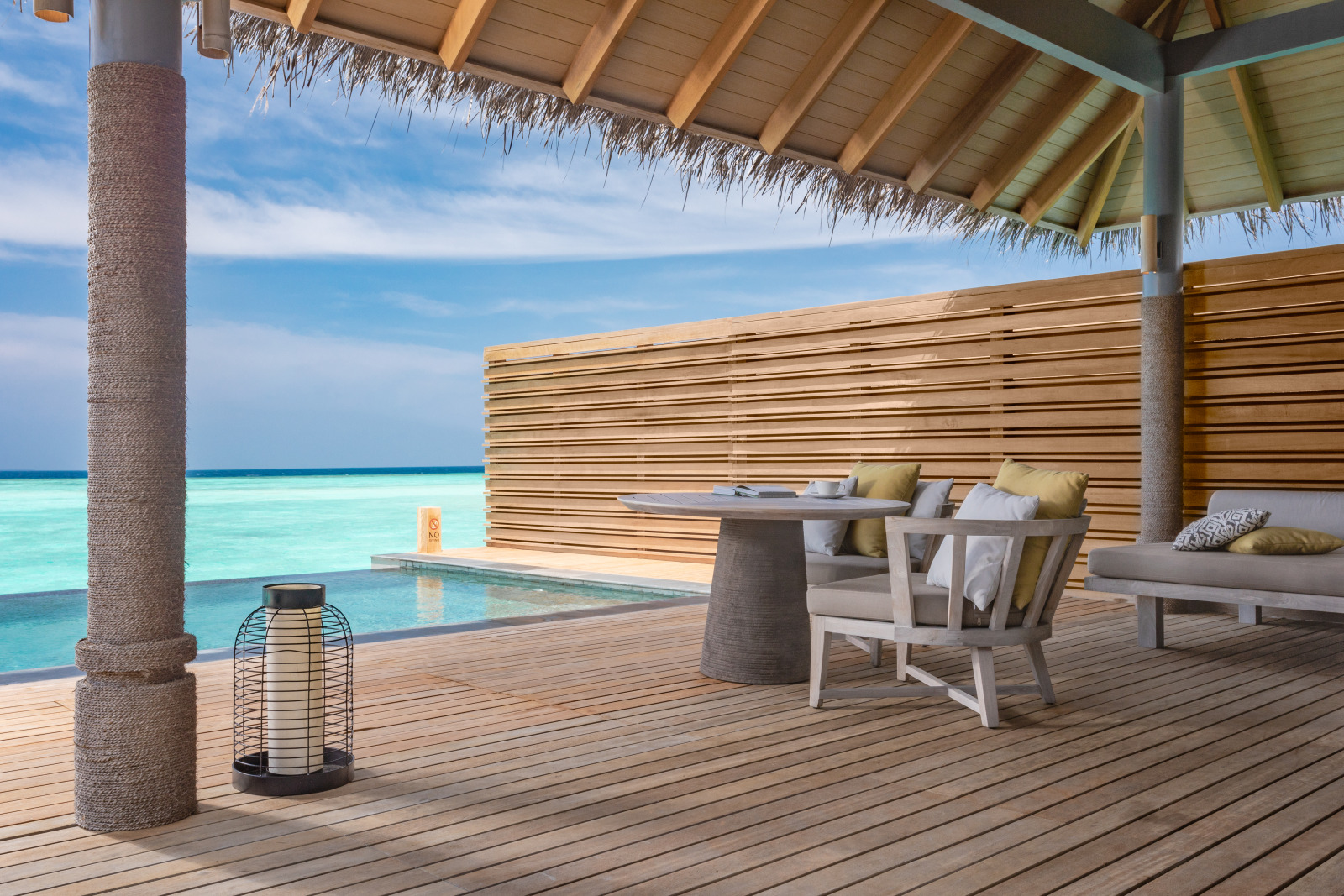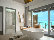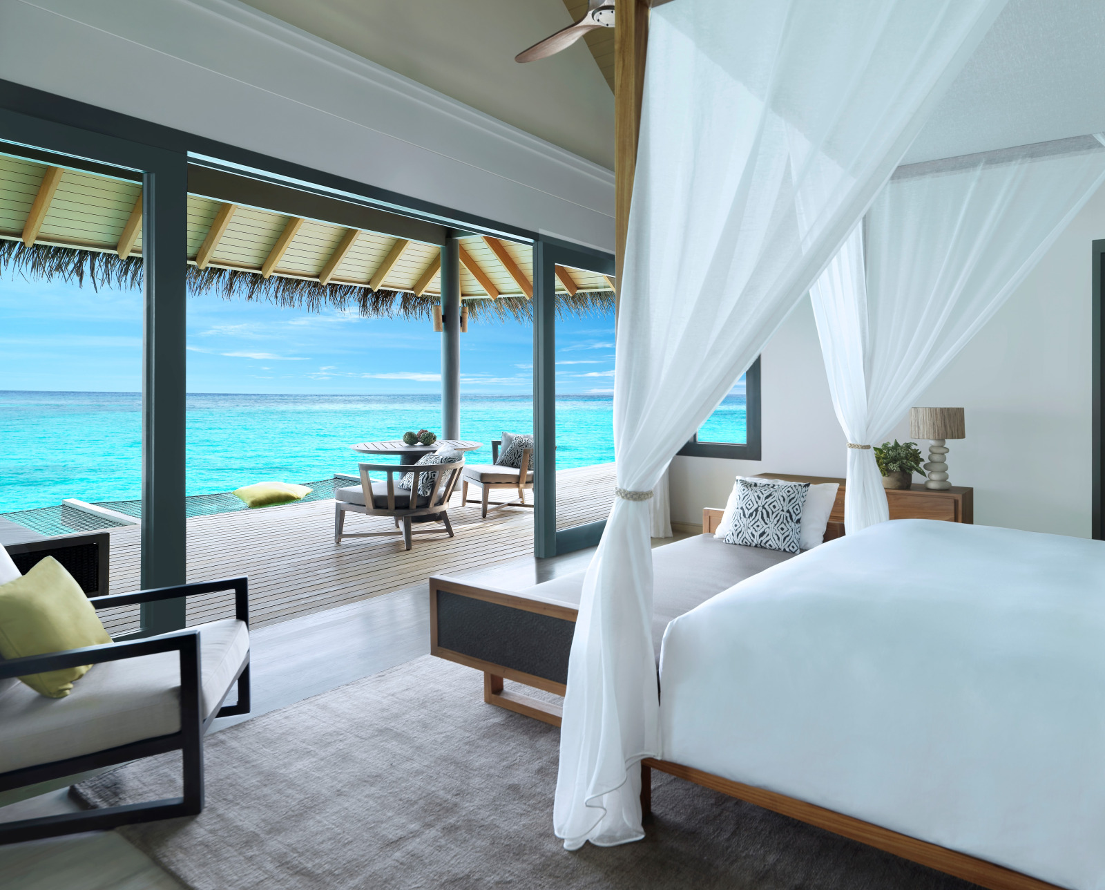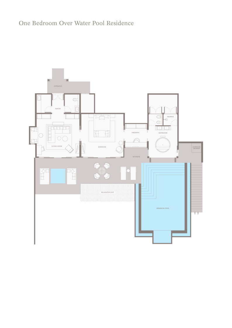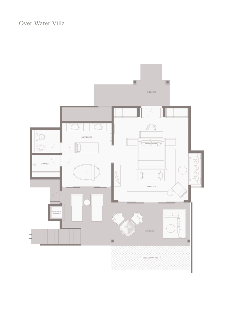 Вилла на воде. Спальня с кроватью king-size, гостиная, мини-кухня, гардеробная, ванная комната с ванной и душевой кабиной, душ на открытом воздухе, гостевой туалет, терраса с обеденной зоной на открытом воздухе, гамаком над водой, бассейном и прямым спуском к воде. Гостиная и спальня разделены дверью.