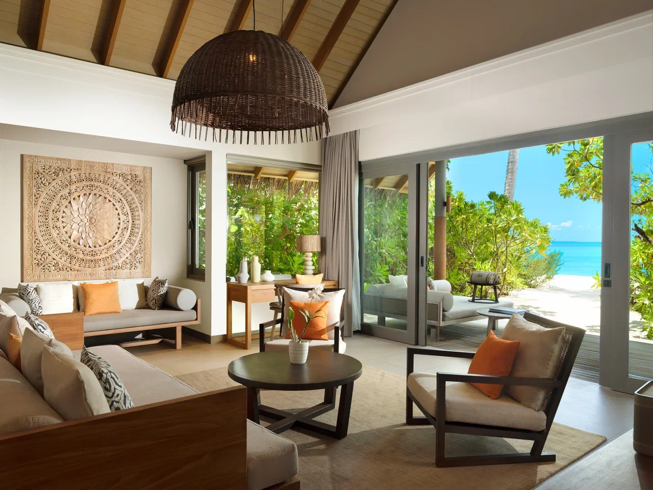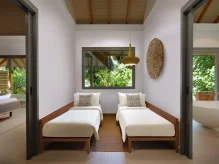 Вилла на берегу. 2 спальни (одна – с кроватью king-size, другая – с кроватями twin) с гостиными зонами, гостиная с обеденной зоной, 2 ванные комнаты (каждая с ванной и душевой кабиной), 3 душа на открытом воздухе, терраса с обеденной зоной и бассейном. Гостиная и спальни разделены дверями.