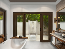 На 1-й вилле: 2 спальни (одна – с кроватью king-size, другая – с кроватями twin) с гостиными зонами, гостиная с обеденной зоной, 2 ванные комнаты (каждая с ванной и душевой кабиной), 3 душа на открытом воздухе, терраса с обеденной зоной, бассейном и беседкой. Гостиная и спальни разделены дверями.