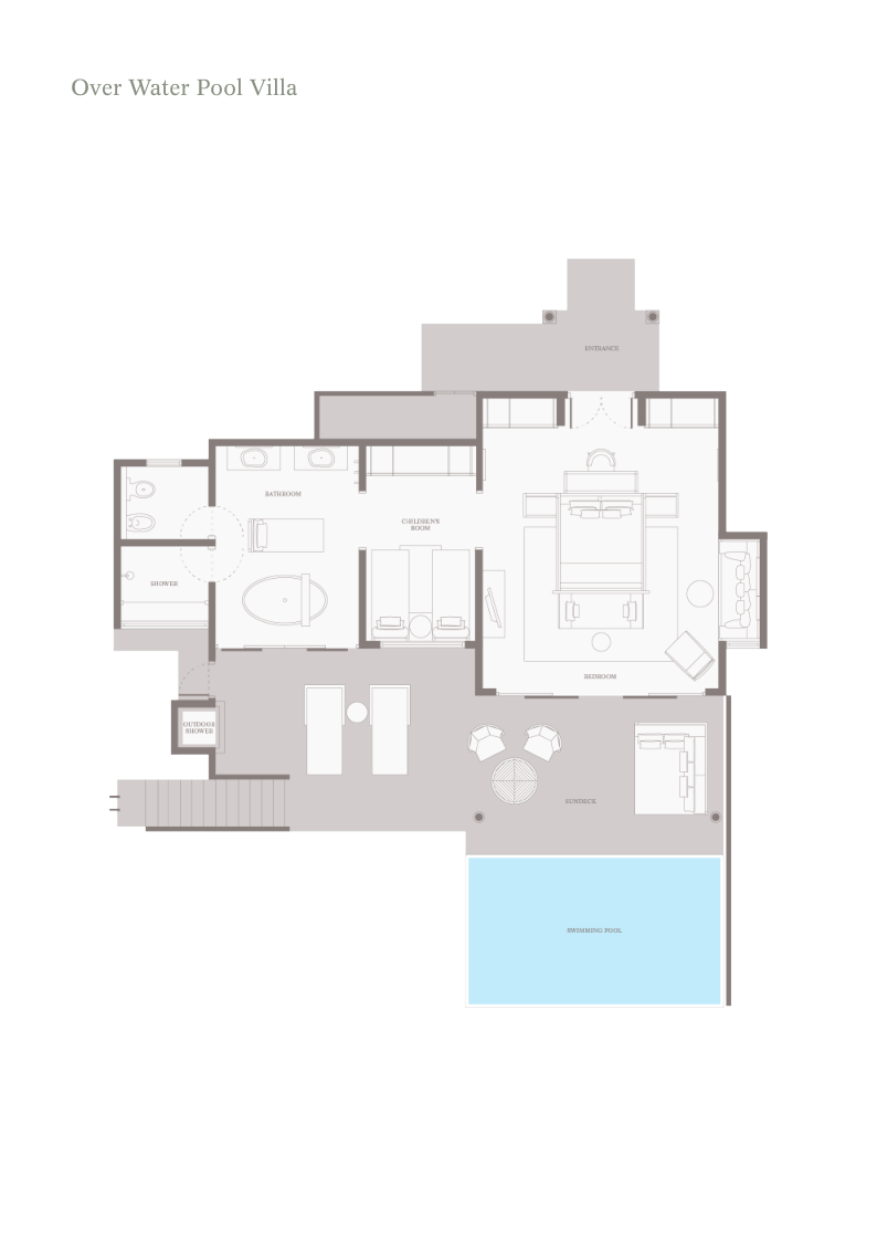 Вилла на воде. Спальня с кроватью king-size и гостиной зоной, детская спальня с кроватями twin (или комната для чтения), ванная комната с ванной и душевой кабиной, душ на открытом воздухе, терраса с обеденной зоной, бассейном и прямым спуском к воде.