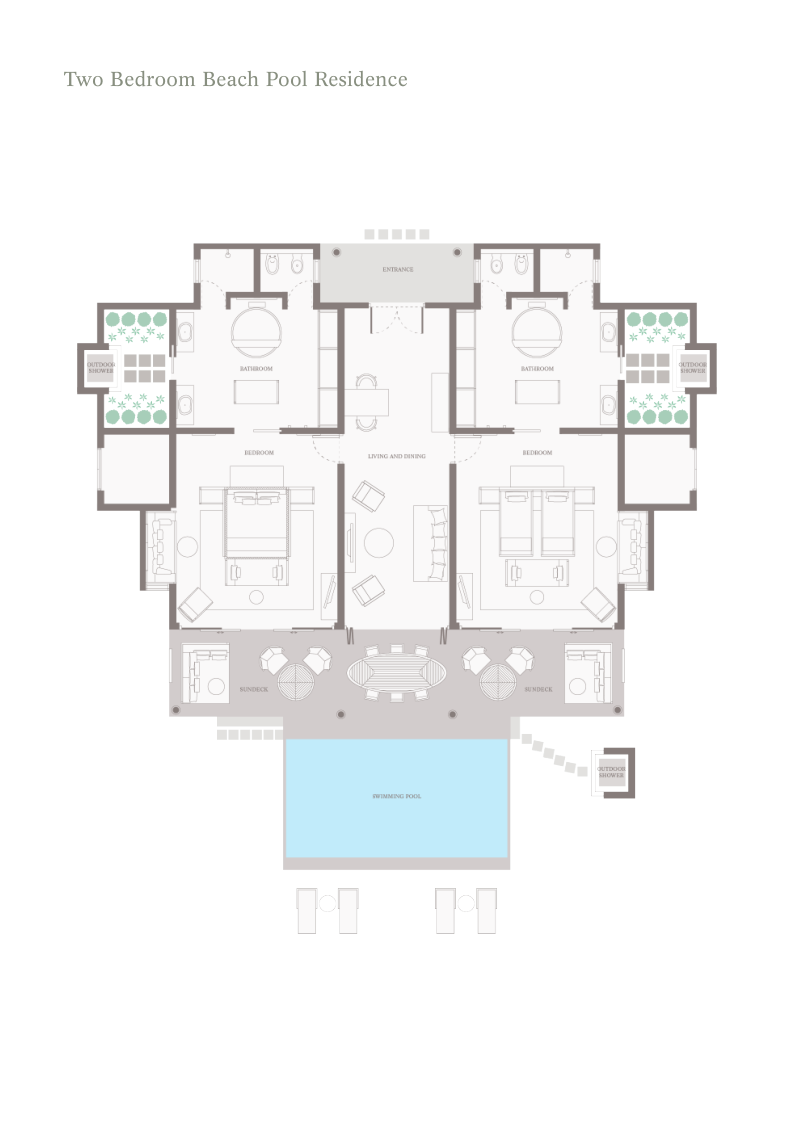 2 виллы категорий Two Bedroom Beach Pool Residence (улучшенная) и Beach Villa With Plunge Pool на берегу. 3 спальни, 3 ванные комнаты, 2 бассейна.