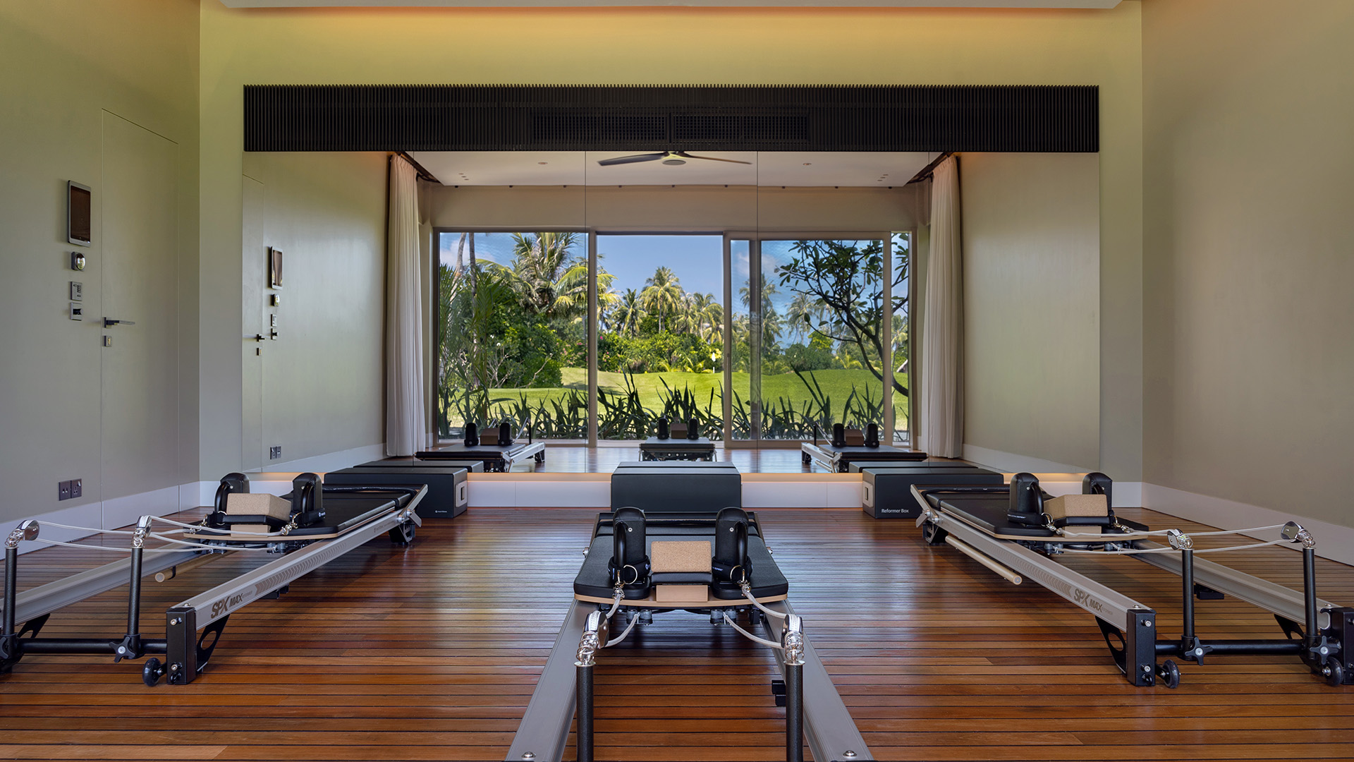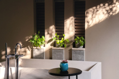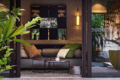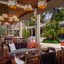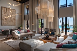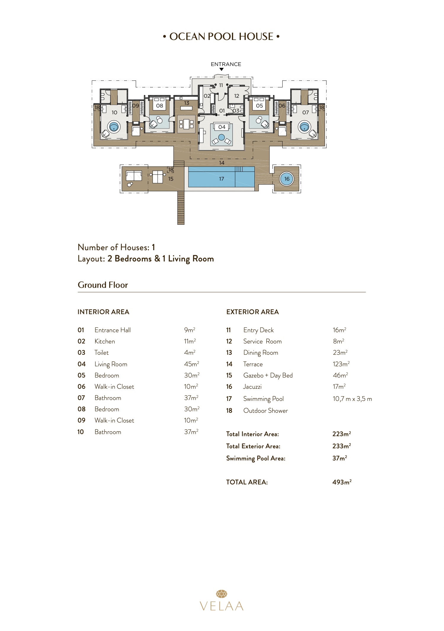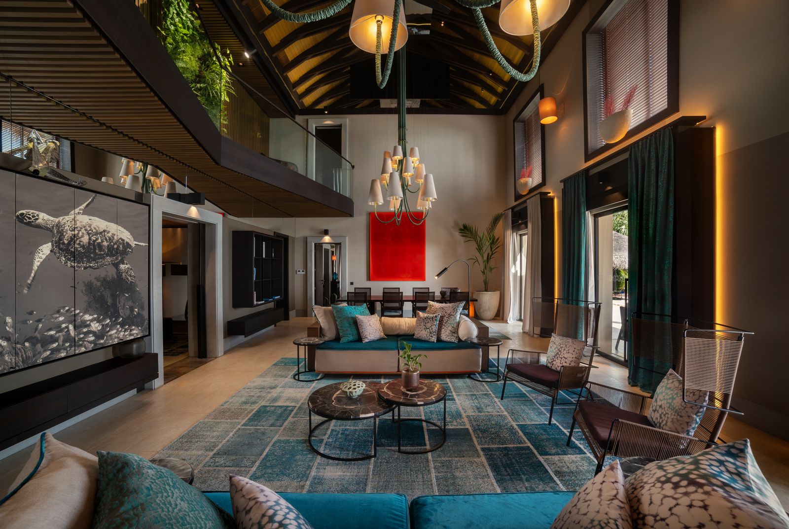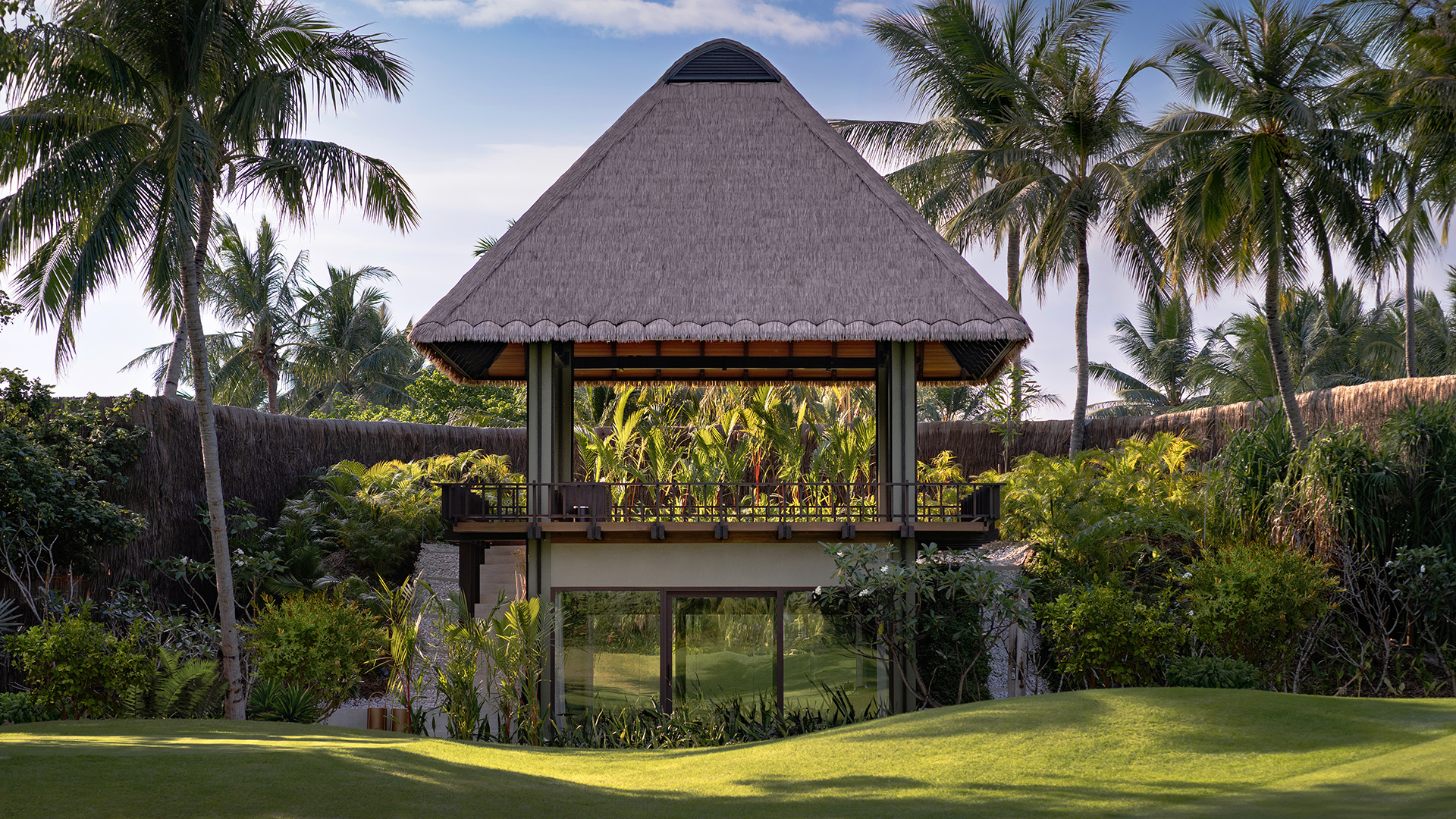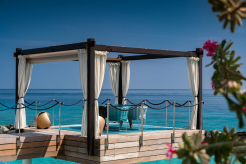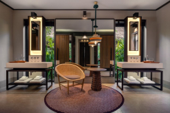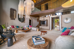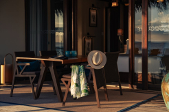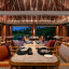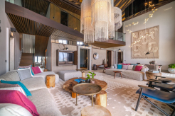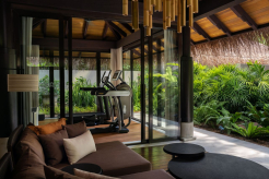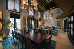 Двухэтажная вилла на берегу. 4 спальни с кроватями king-size, гостиная, обеденная зона, кухня, гардеробная, 4 ванные комнаты (одна – с ванной и душевой кабиной, три – с душевыми кабинами), гостевой туалет, тренажёрный зал, массажный кабинет, комната для обслуживающего персонала, 2 ванны, душ и джакузи на открытом воздухе, 3 беседки (одна из них – с кухней и обеденной зоной на открытом воздухе и бильярдом), балкон (38 кв. м), терраса с частным открытым бассейном. Гостиная и спальни разделены дверями.