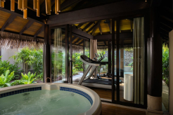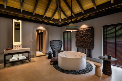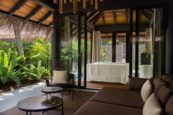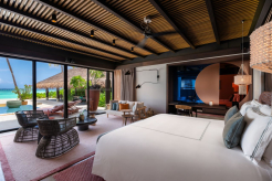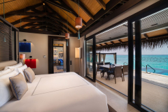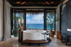 Вилла на воде. До виллы можно добраться на лодке. Спальня с кроватью king-size, гостиная, обеденная зона, кухня, гардеробная, 2 ванные комнаты (одна – с ванной и душевой кабиной, другая – с душевой кабиной), гостевой туалет, тренажёрный зал, массажный кабинет, комната для обслуживающего персонала, джакузи и душ на открытом воздухе, беседка с обеденной зоной, терраса с частным открытым бассейном, частный песчаный пляж на платформе, прямой спуск к воде. Гостиная и спальня разделены дверью.