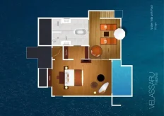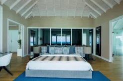 Вилла на воде. Спальня с кроватью king-size, гостиная зона, гардеробная, ванная комната с ванной и душевой кабиной, терраса с бассейном и прямым спуском к воде.
