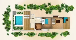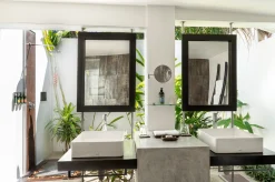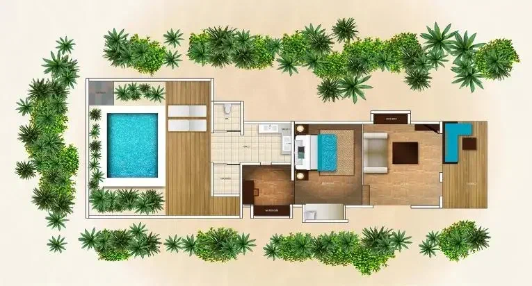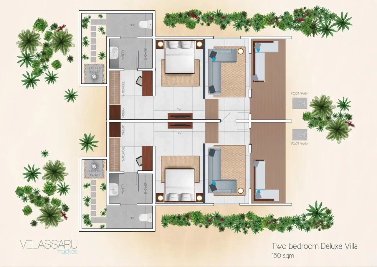 2 соединённые виллы категории Deluxe Villa в саду. 2 спальни с кроватями king-size, 2 гостиные зоны, 2 гардеробные, 2 ванные комнаты (каждая с душевой кабиной), 2 душа на открытом воздухе, 2 террасы.